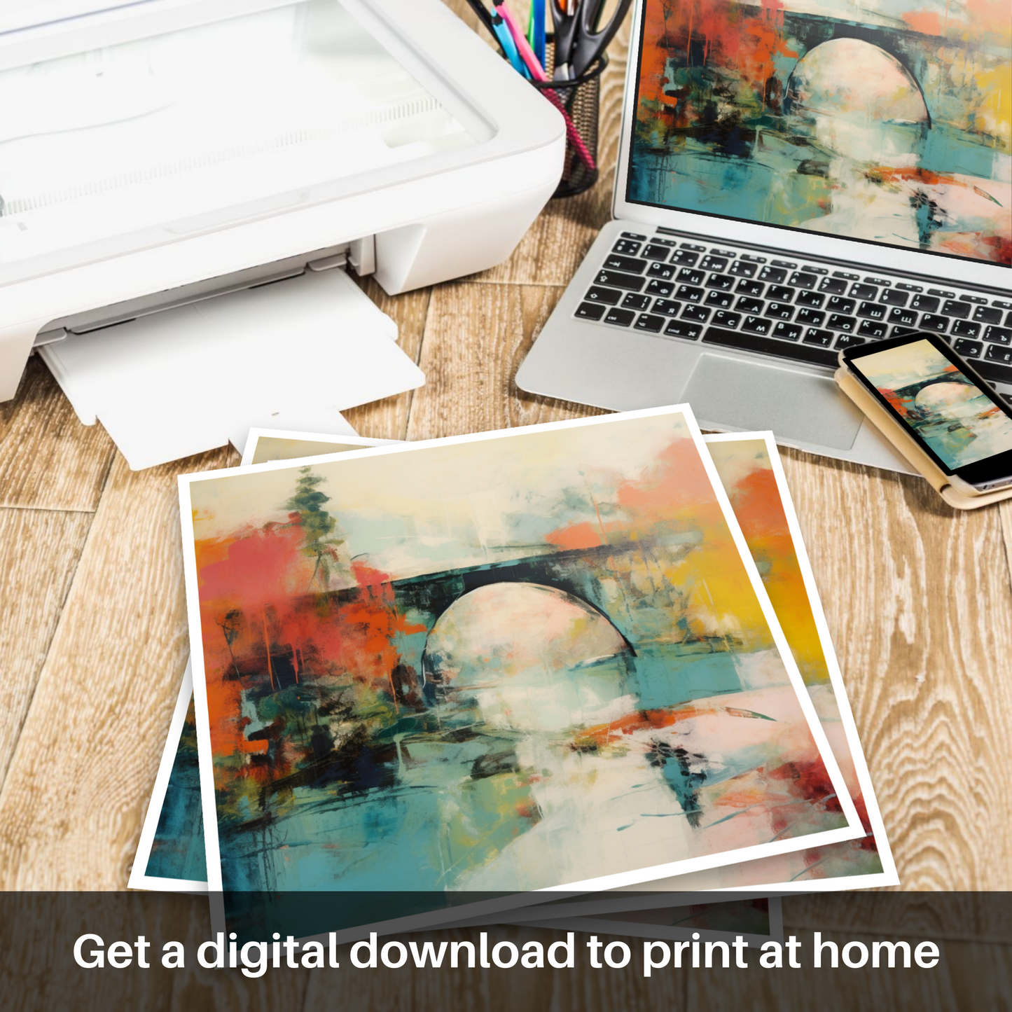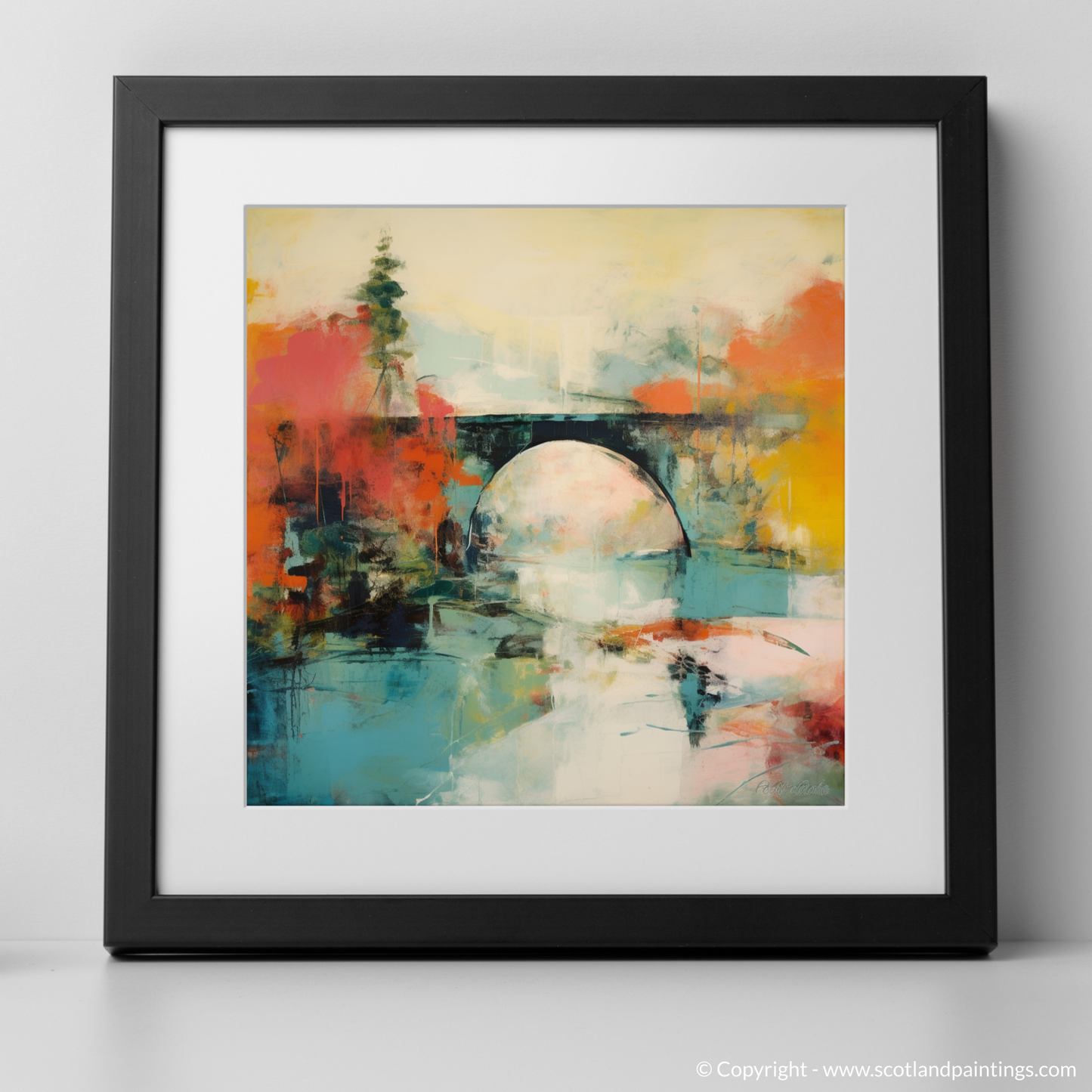 Immerse yourself in the vibrant abstraction of this evocatively reimagined Scottish bridge, a canvas where splashes of crimson, fiery orange, and gentle yellows dance across the surface, capturing the essence of the historic Victoria Bridge in Ballater, Aberdeenshire. The arch of the bridge forms a steadfast focal point amidst the swirling tapestry of hues and shapes that evoke the fluidity of the water below.