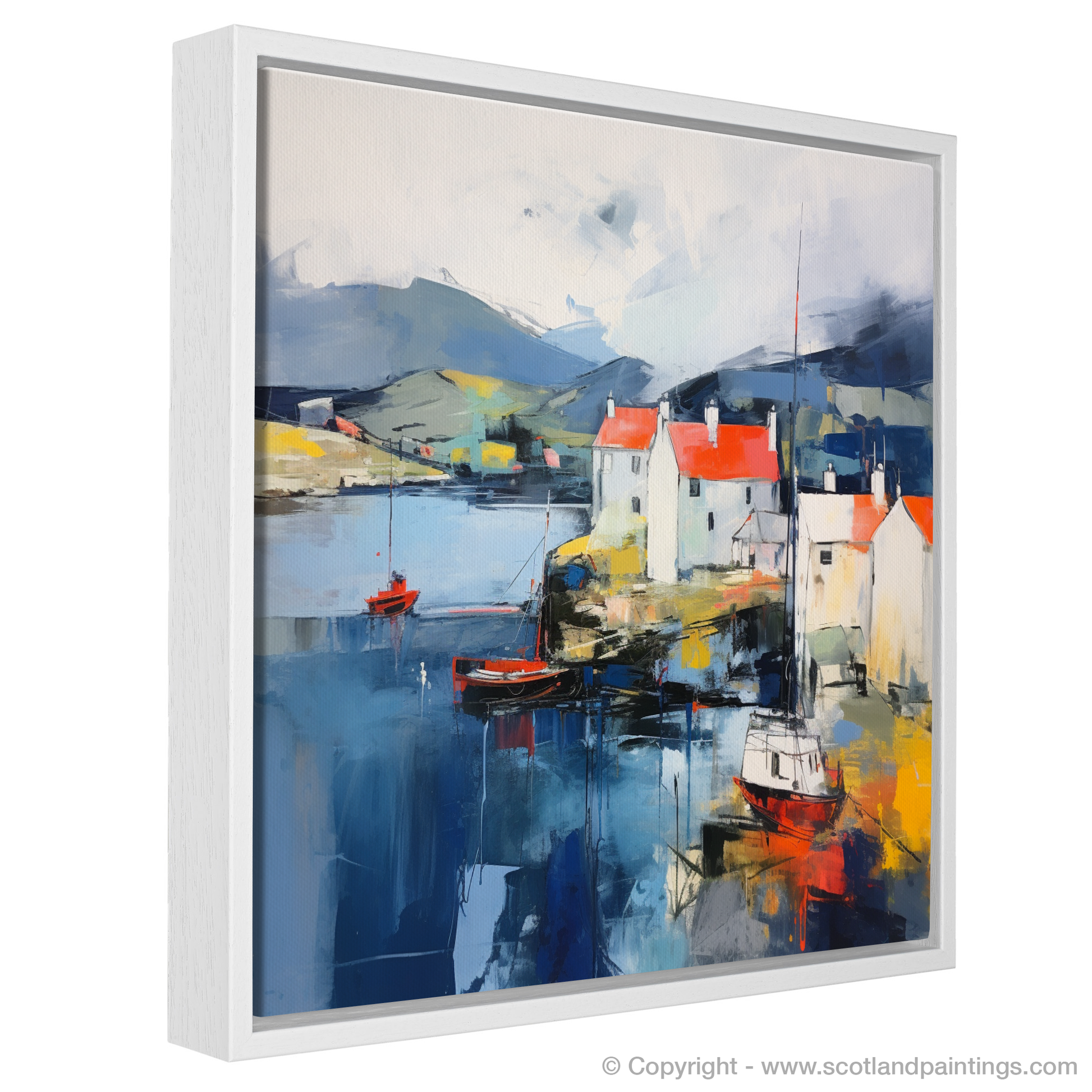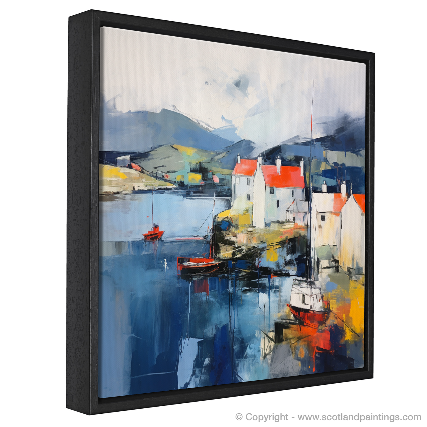 Embark on a visual voyage to the rugged charm of Castlebay Harbour through this compelling abstract print. With its evocative blend of tempestuous skies and serene waters, the artwork adeptly captures the essence of Scotland's maritime landscapes. Bold brushstrokes carve out the silhouettes of quaint harbour buildings that stand resilient against the elements. A palette of vibrant reds and deep blues contrasts with softer yellows and stark whites, reflecting both the natural beauty and the cultural tapestry of the Scottish Isles.