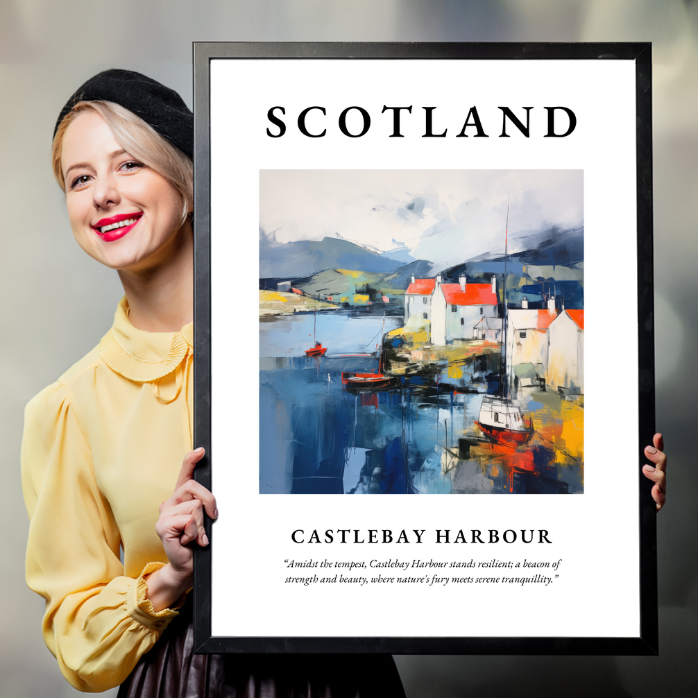 At the top, the bold lettering of "SCOTLAND" celebrates the land's majestic allure, drawing the eye to the abstract painting below. The colourful interplay of shapes and hues captures the essence of Castlebay Harbour, with vivid reds, soothing blues, and earthy tones juxtaposed to evoke the meeting of nature’s fury and tranquil serenity. The composition conveys movement and energy, while the quote beneath—“Amidst the tempest, Castlebay Harbour stands resilient; a beacon of strength and beauty, where nature's fury meets serene tranquillity”—adds depth and reflection.