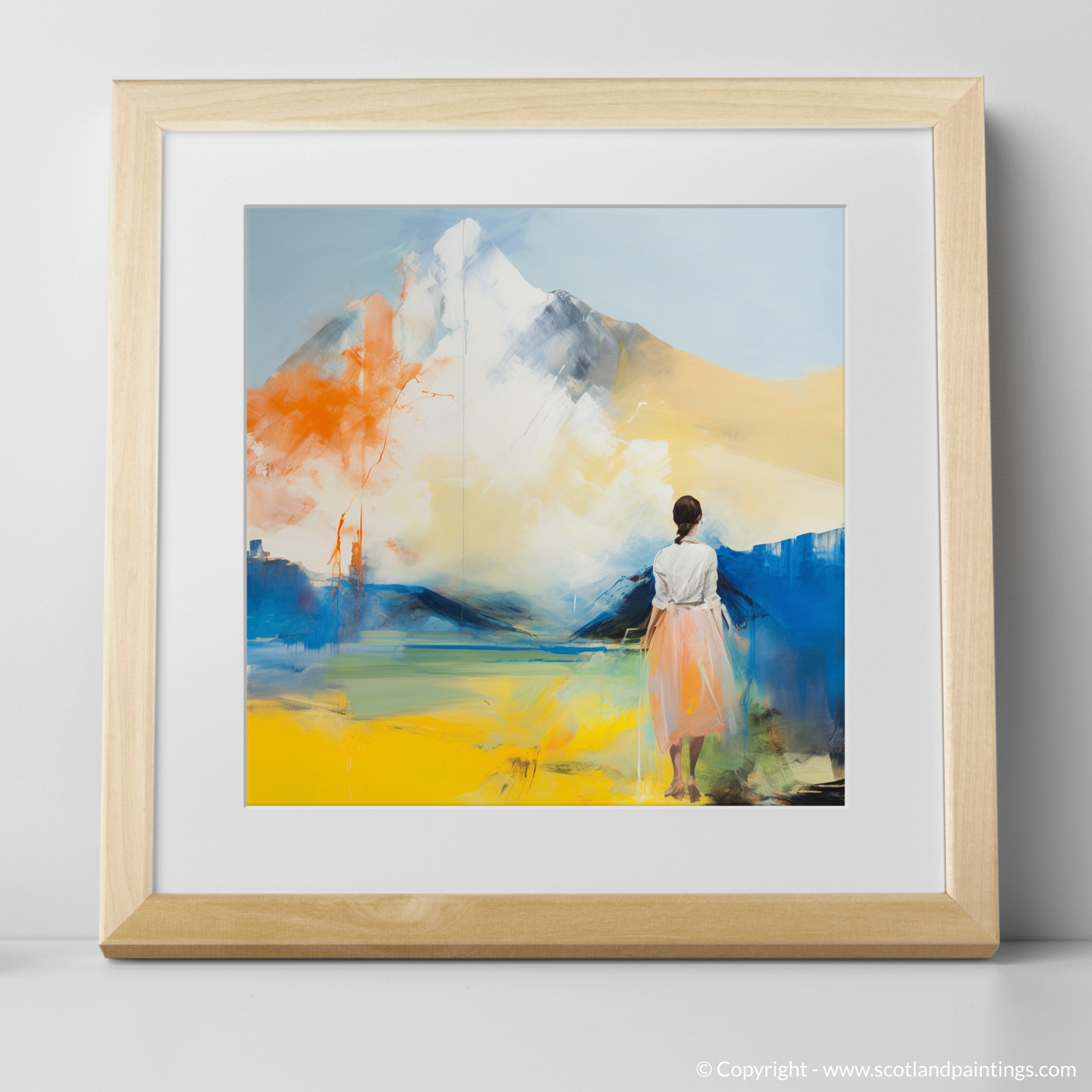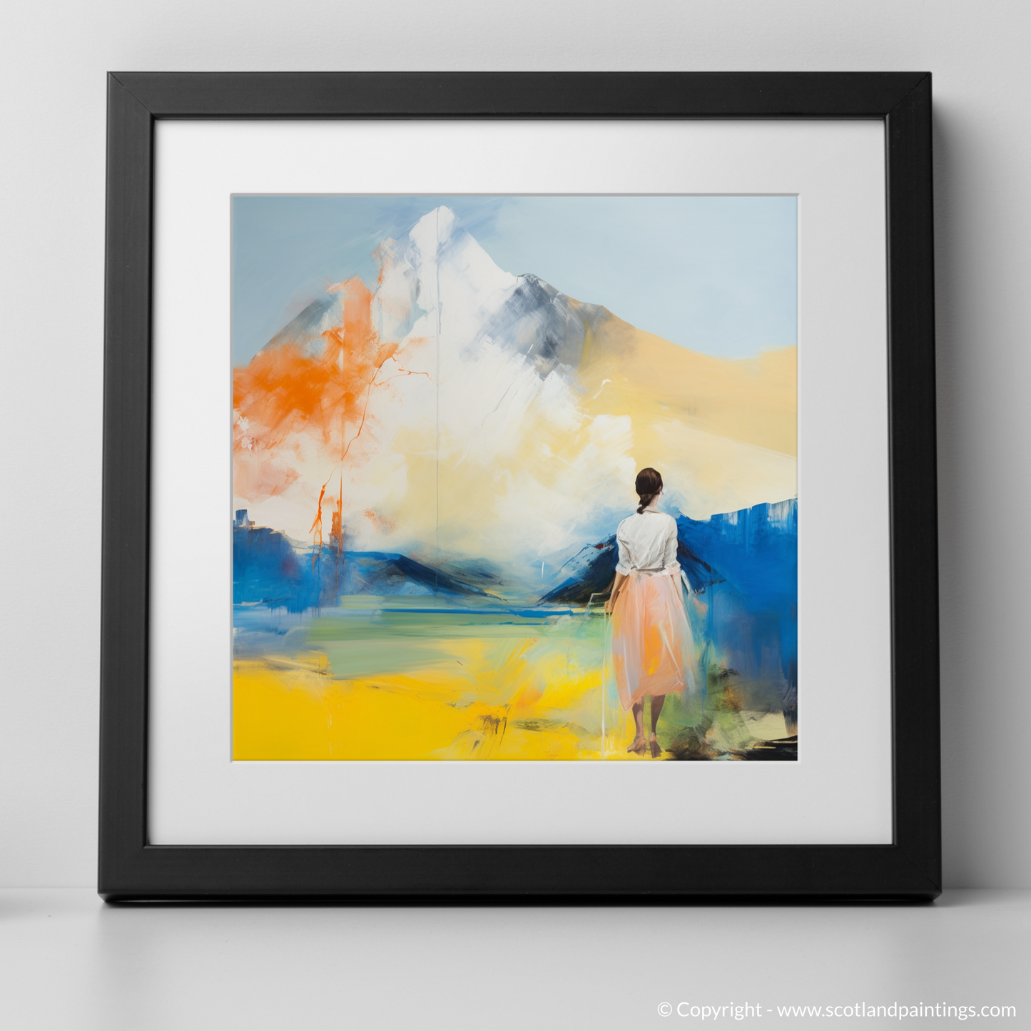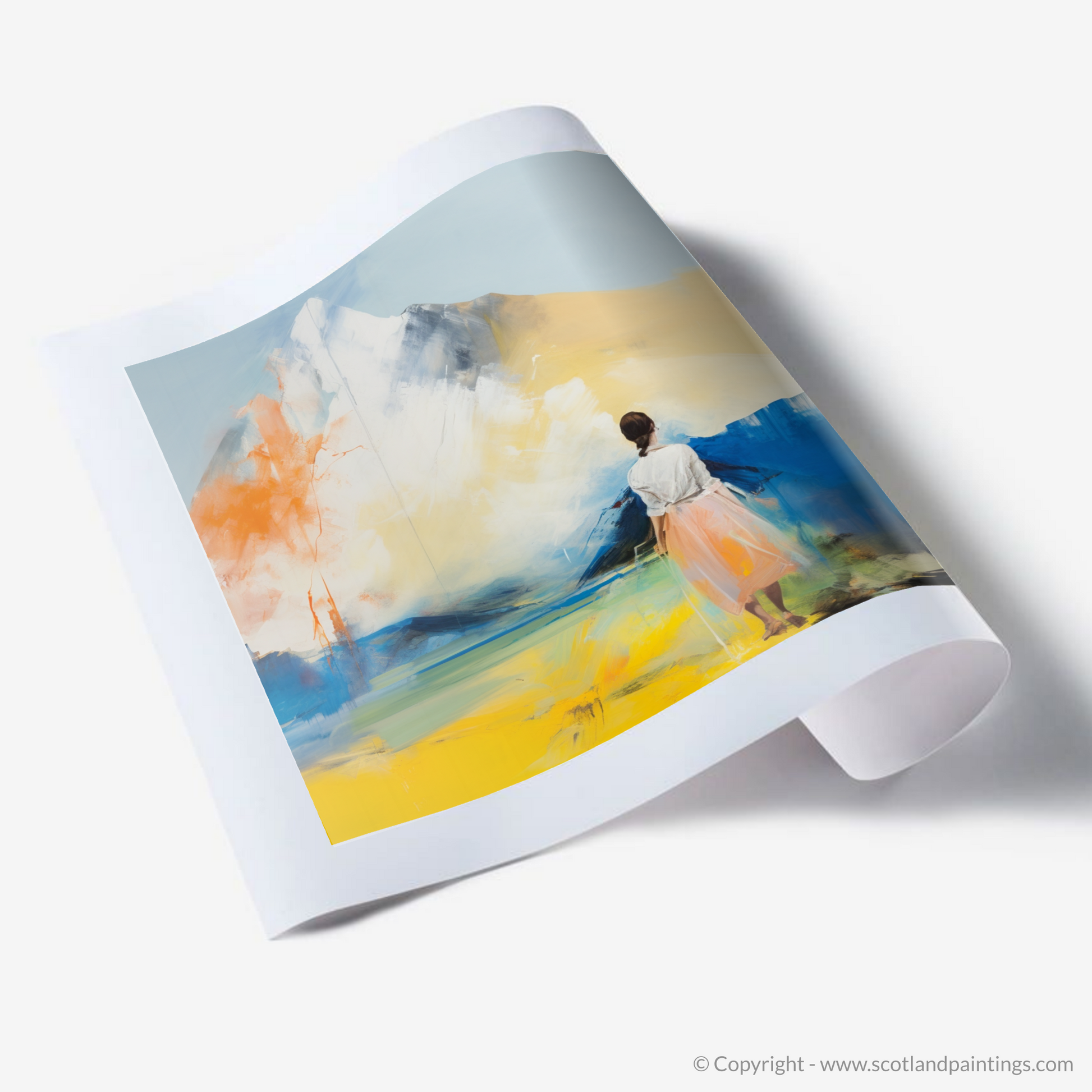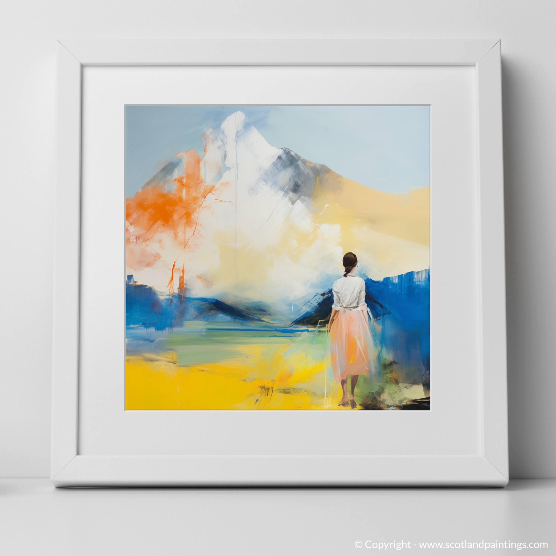Immerse yourself in the contemplative beauty of this evocative print, where an abstract representation of nature's grandeur meets the gentle allure of human introspection. At the heart of this visual poetry is a lone figure, a woman clad in a flowing white dress, her gaze lost in the majesty of the mountains that tower before her - a tribute to the imposing magnificence of Ben Nevis.