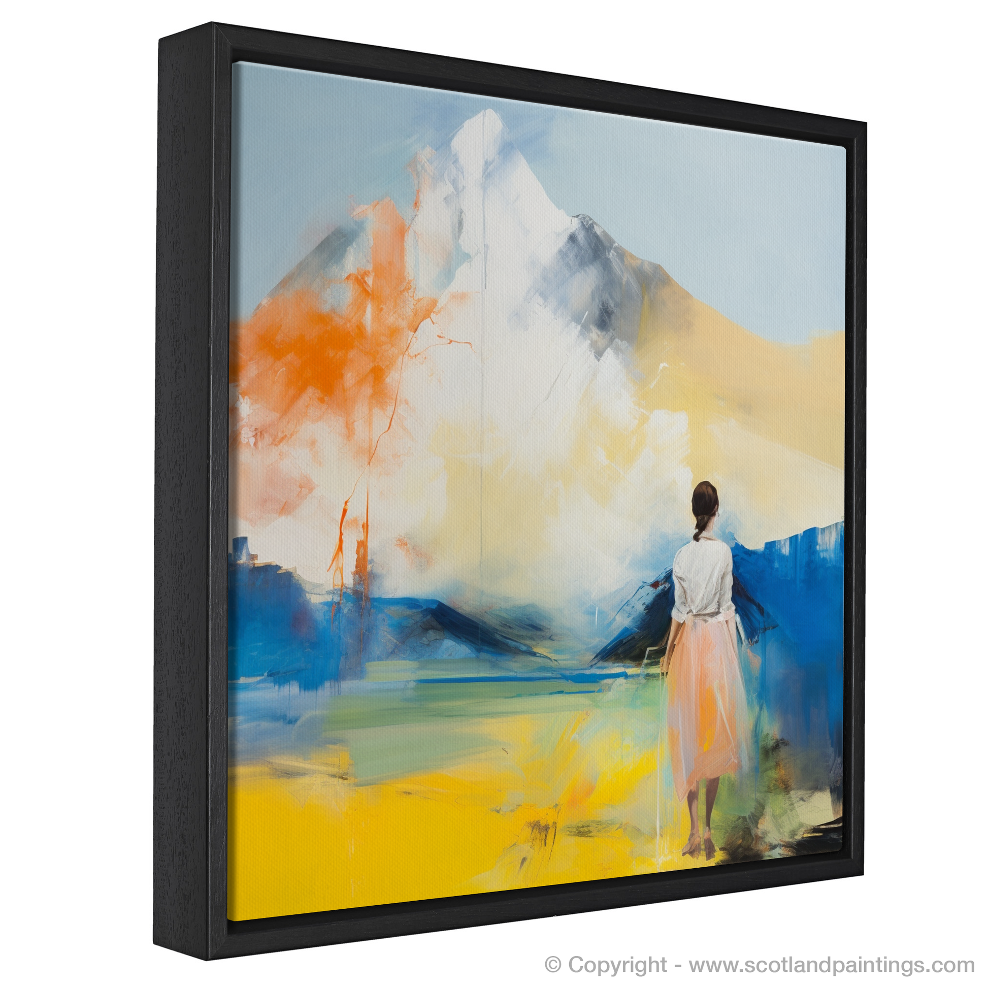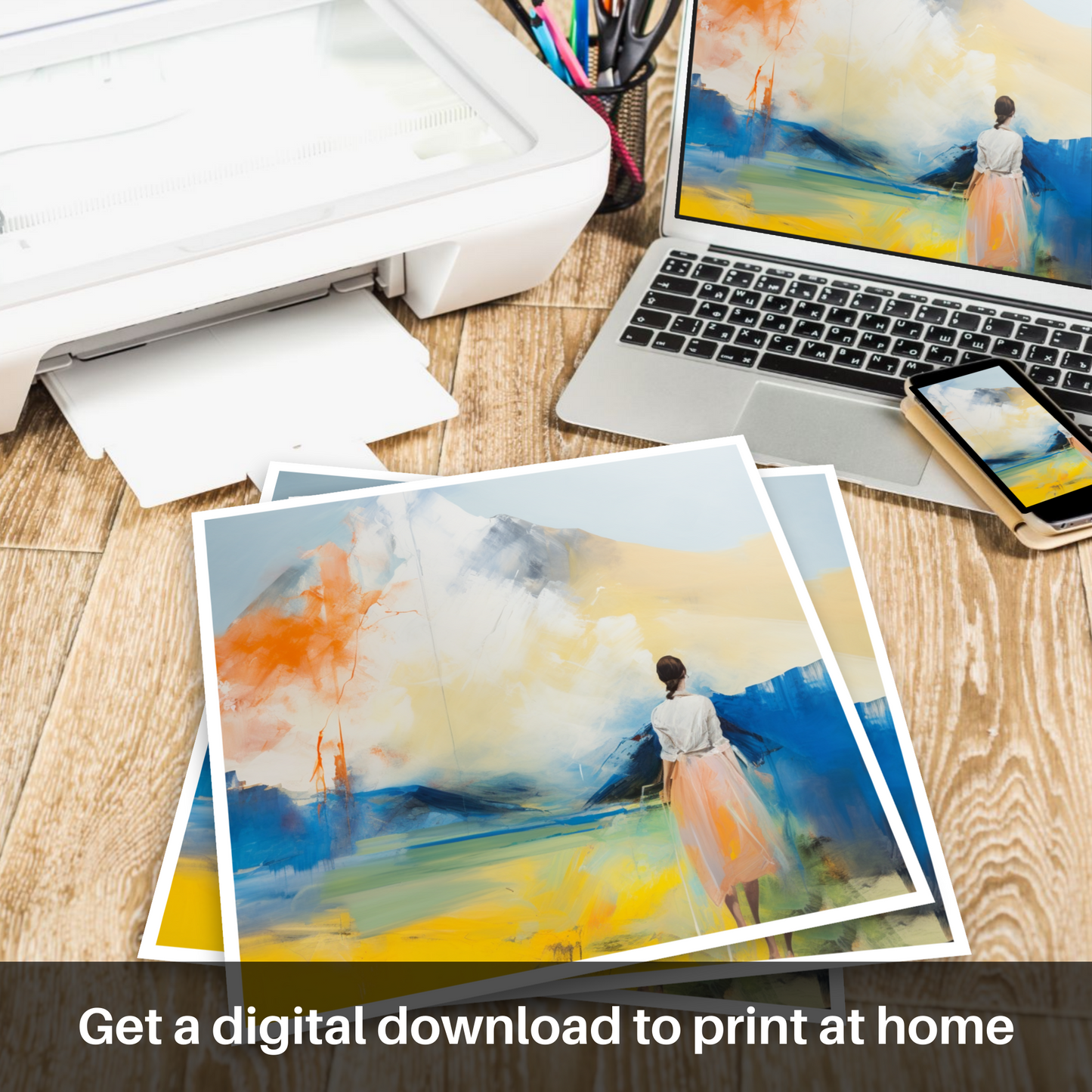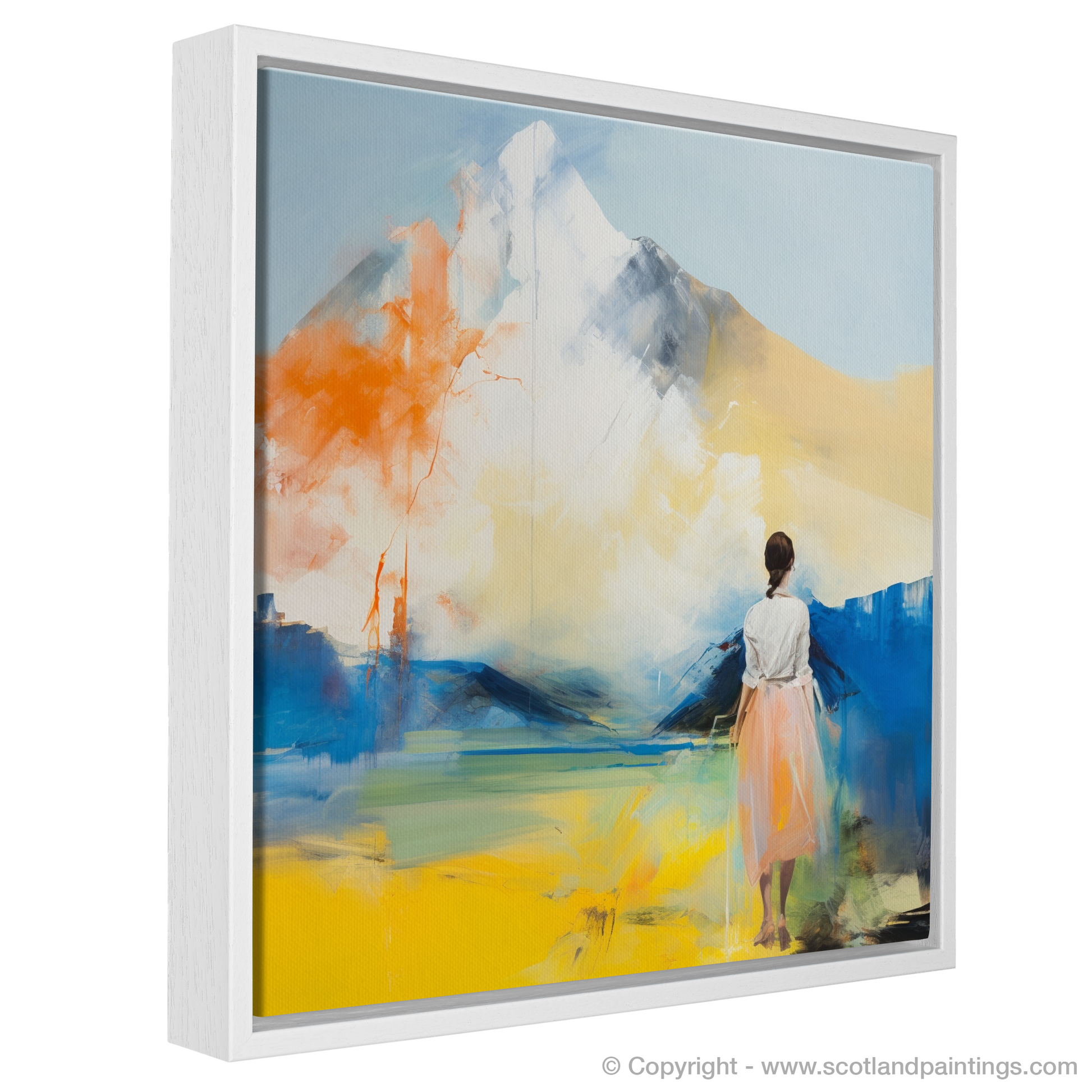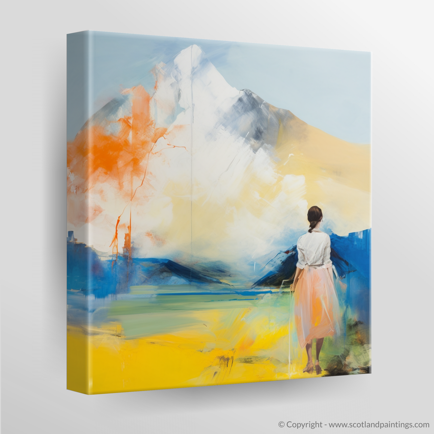 Immerse yourself in the contemplative beauty of this evocative print, where an abstract representation of nature's grandeur meets the gentle allure of human introspection. At the heart of this visual poetry is a lone figure, a woman clad in a flowing white dress, her gaze lost in the majesty of the mountains that tower before her - a tribute to the imposing magnificence of Ben Nevis.