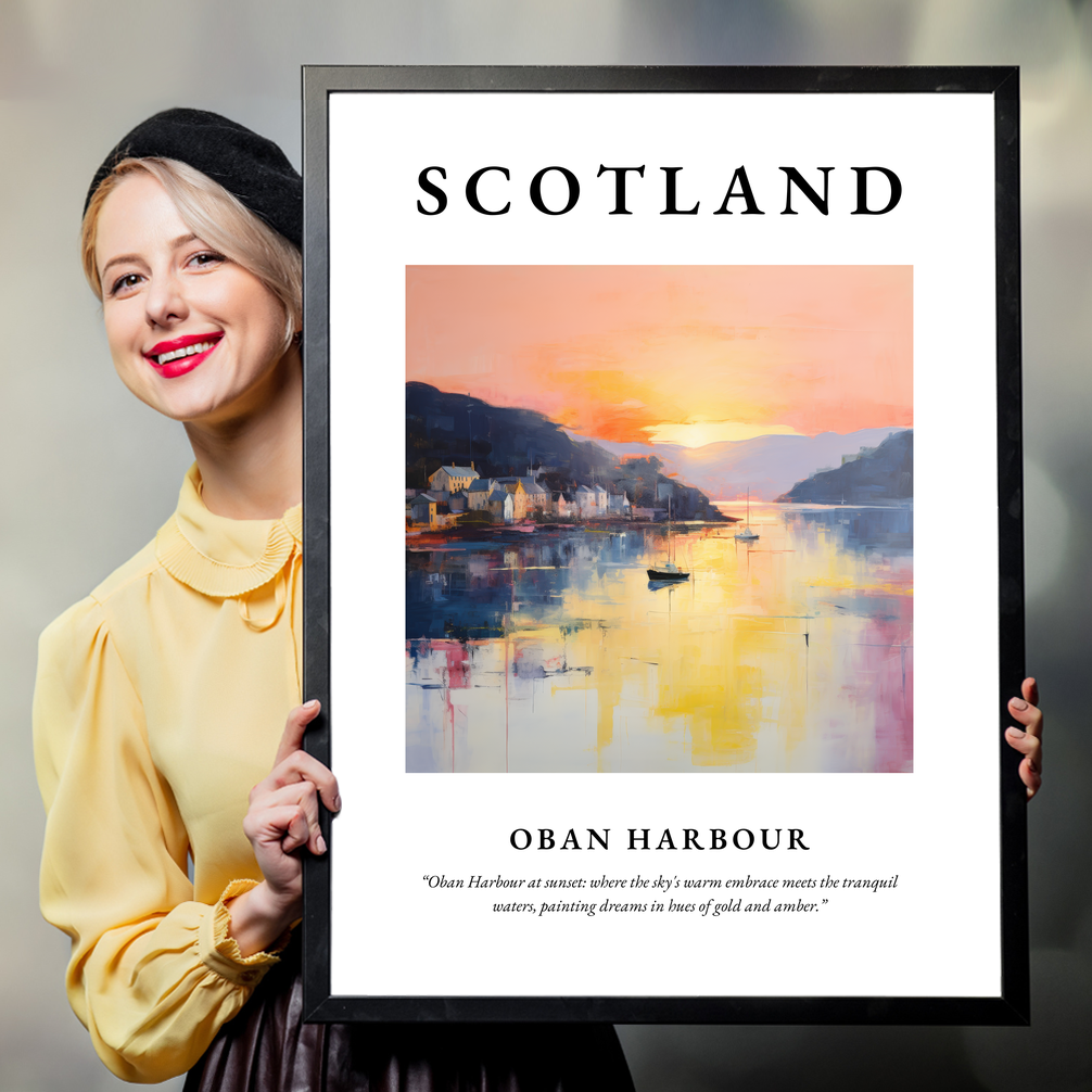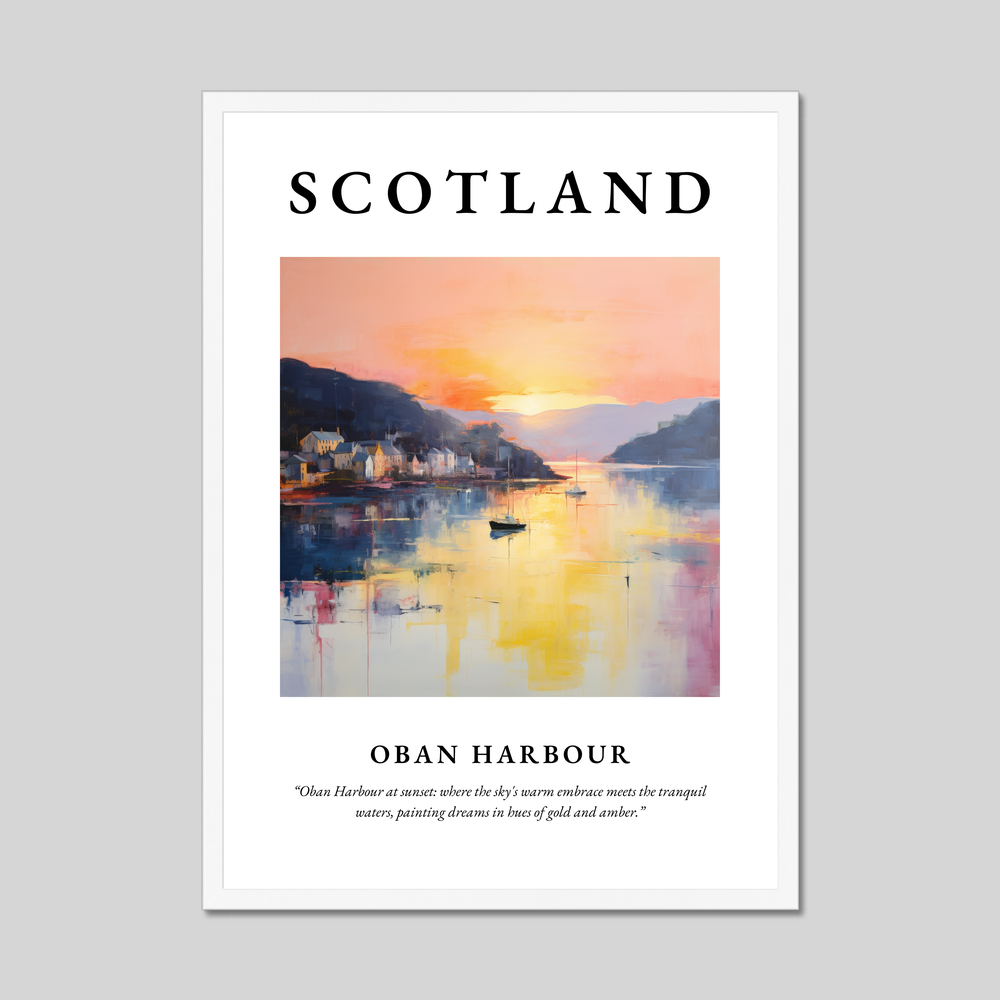 The poster, part of our exclusive “Scottish Harbours” collection, features the word “SCOTLAND” in bold on top, promising a visual delight for both art enthusiasts and those with a sentimental connection to this serene locale. Below the dramatic lettering, an abstract depiction of Oban Harbour unfolds, capturing the harbour at one of its most mesmerising moments—sunset. With the glow of the setting sun reflected in the tranquil waters, the artwork paints dreams in hues of gold and amber, echoing the quote inscribed below: “Oban Harbour at sunset: where the sky's warm embrace meets the tranquil waters, painting dreams in hues of gold and amber.”