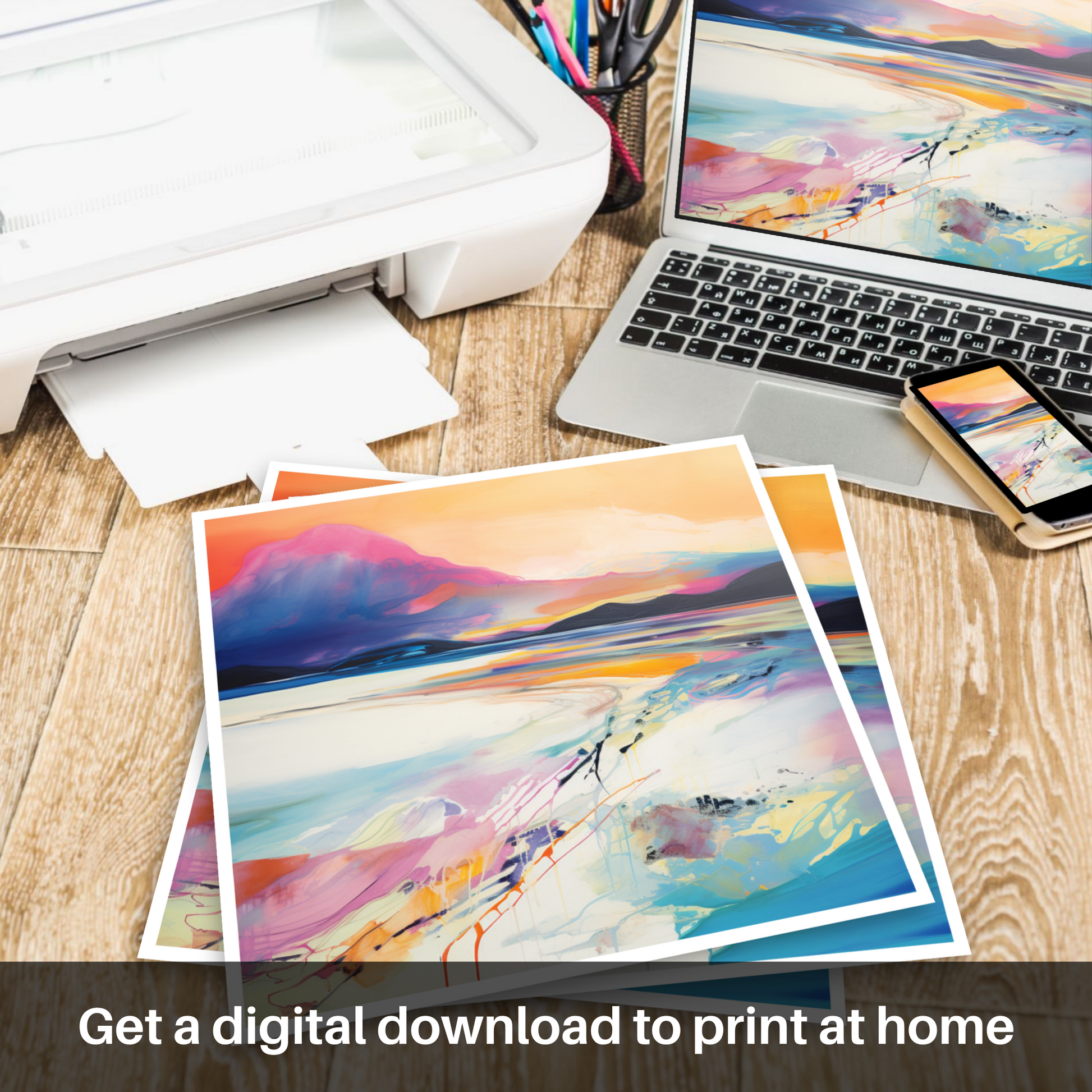 Capturing the ephemeral beauty of Luskentyre Beach as the sun makes its descent, this mesmerising print invites you into a world where the sand and sea speak in soft whispers of colour. Hues of fiery coral and serene blues melt into each other, offering a window to the rugged yet ethereal landscape of the Scottish coast. Bold strokes and dynamic swashes create an immersive abstraction that conveys the timeless dance between light and nature.