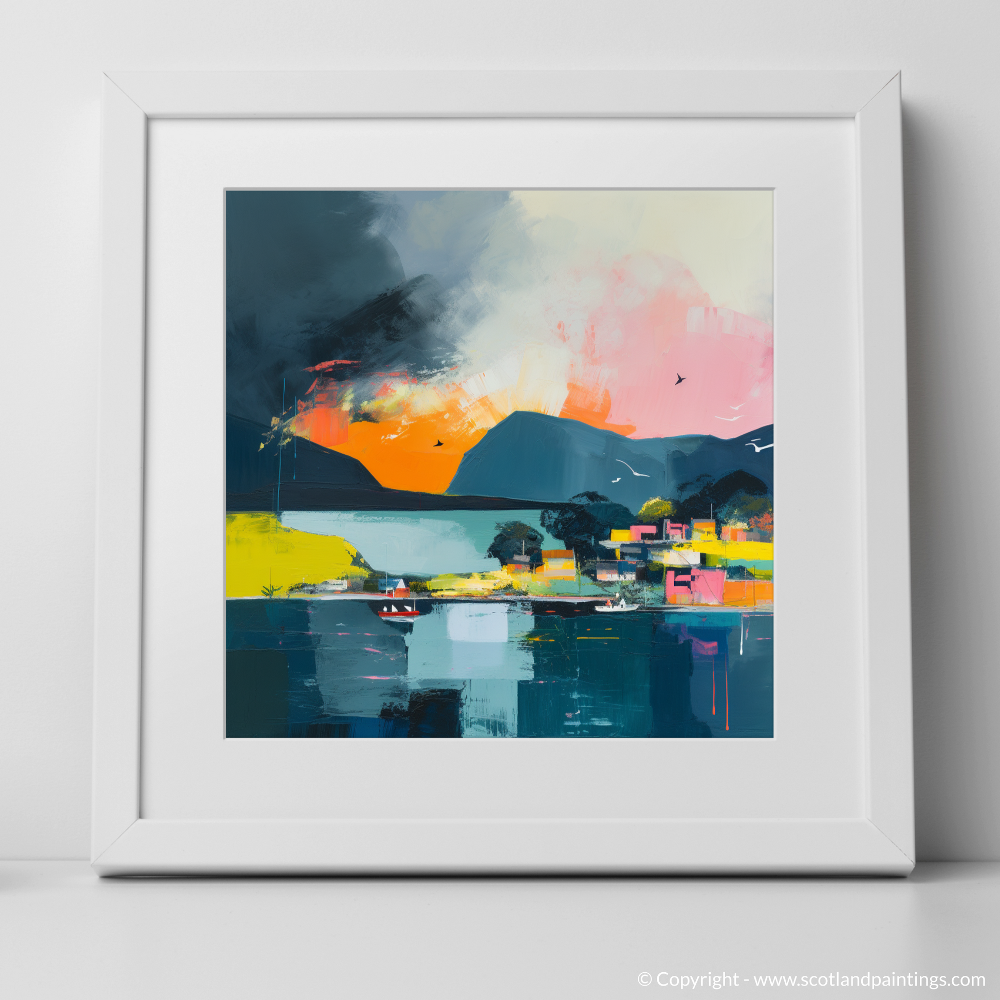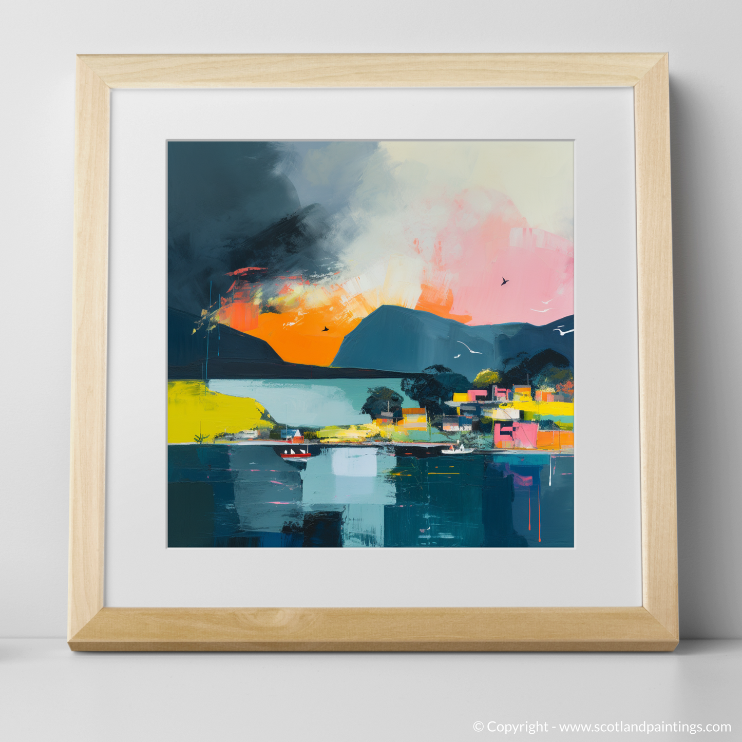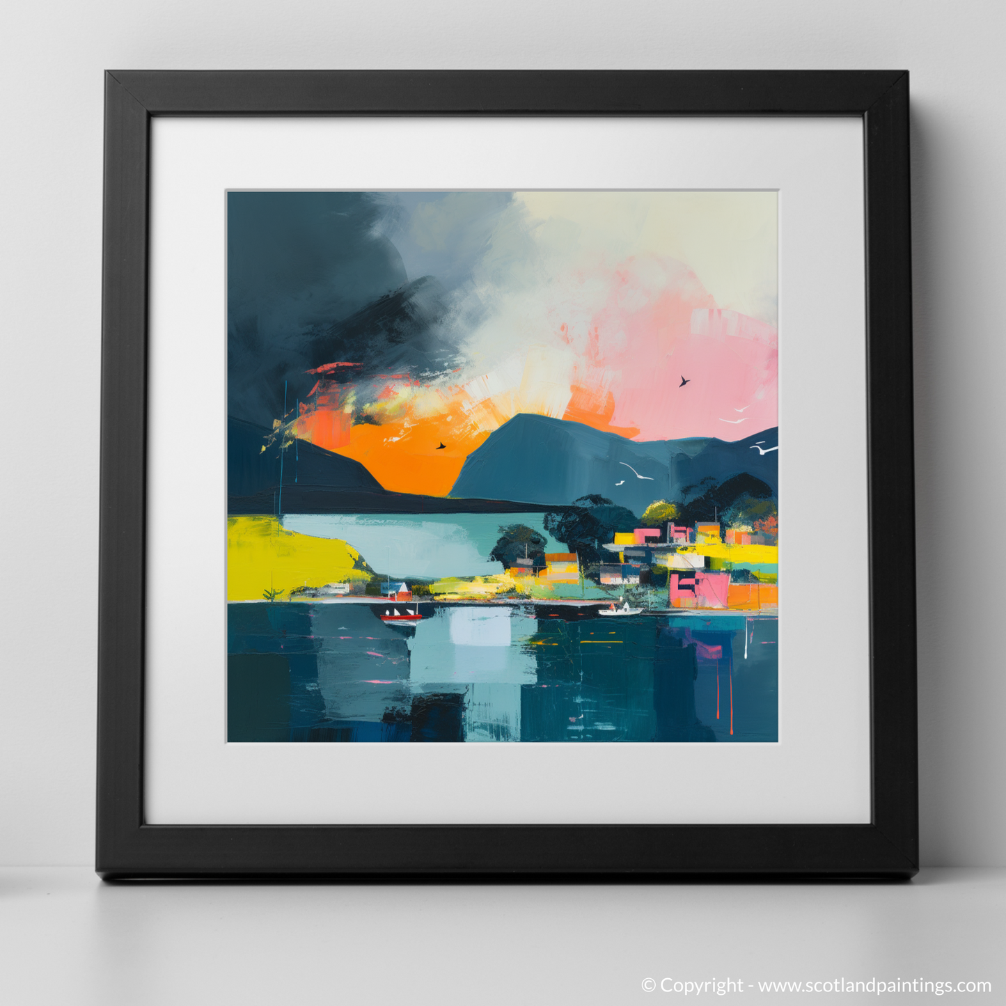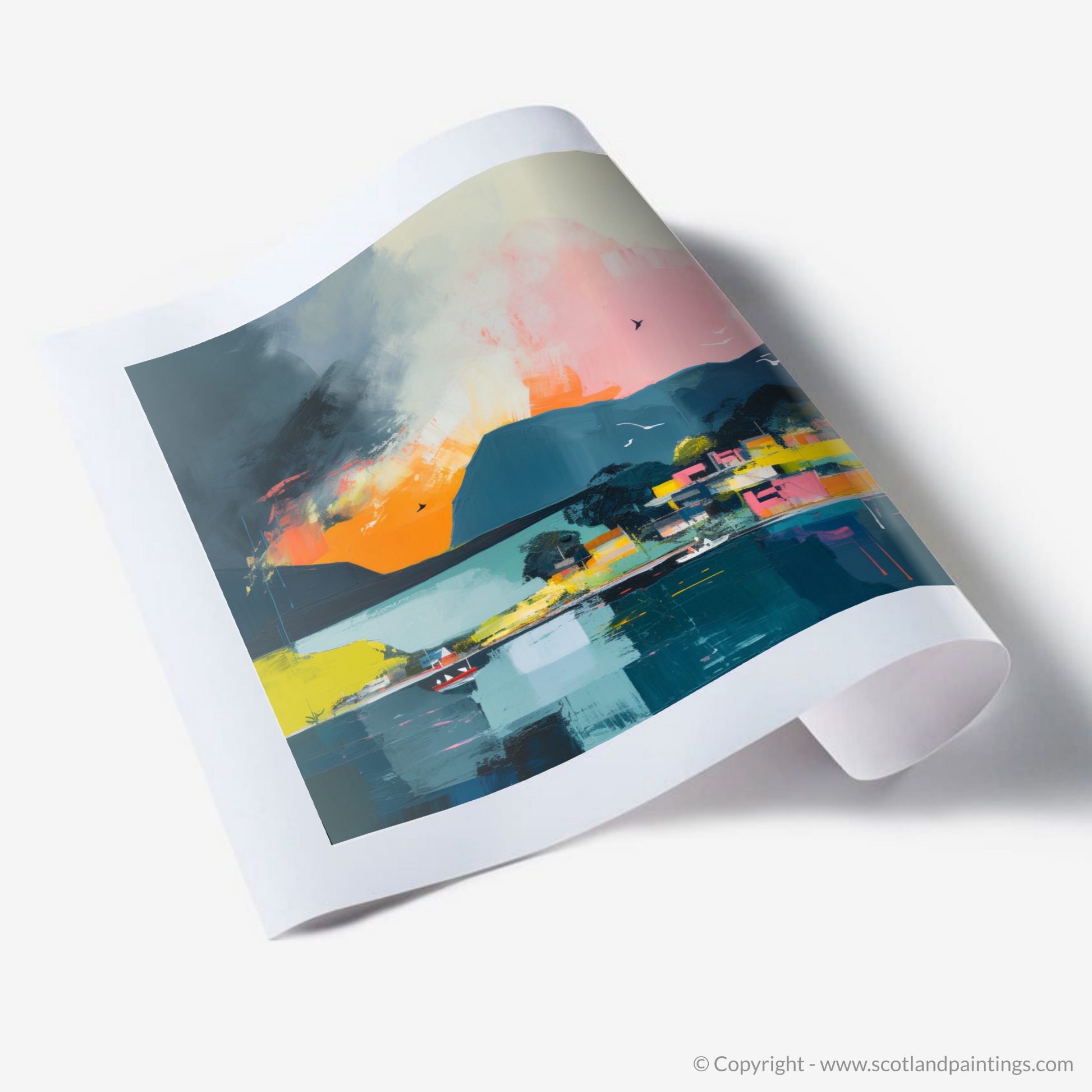 Capturing the tempestuous beauty of Balmaha Harbour with an abstract flourish, this intriguing print invites the viewer into a world where the traditional Scottish landscape is reimagined through a vibrant and emotive lens. The palette knife and broad brush strokes adopt an array of dazzling colours, with brooding, charcoal-hued clouds that loom over the scene, accentuating the storm's impending presence.