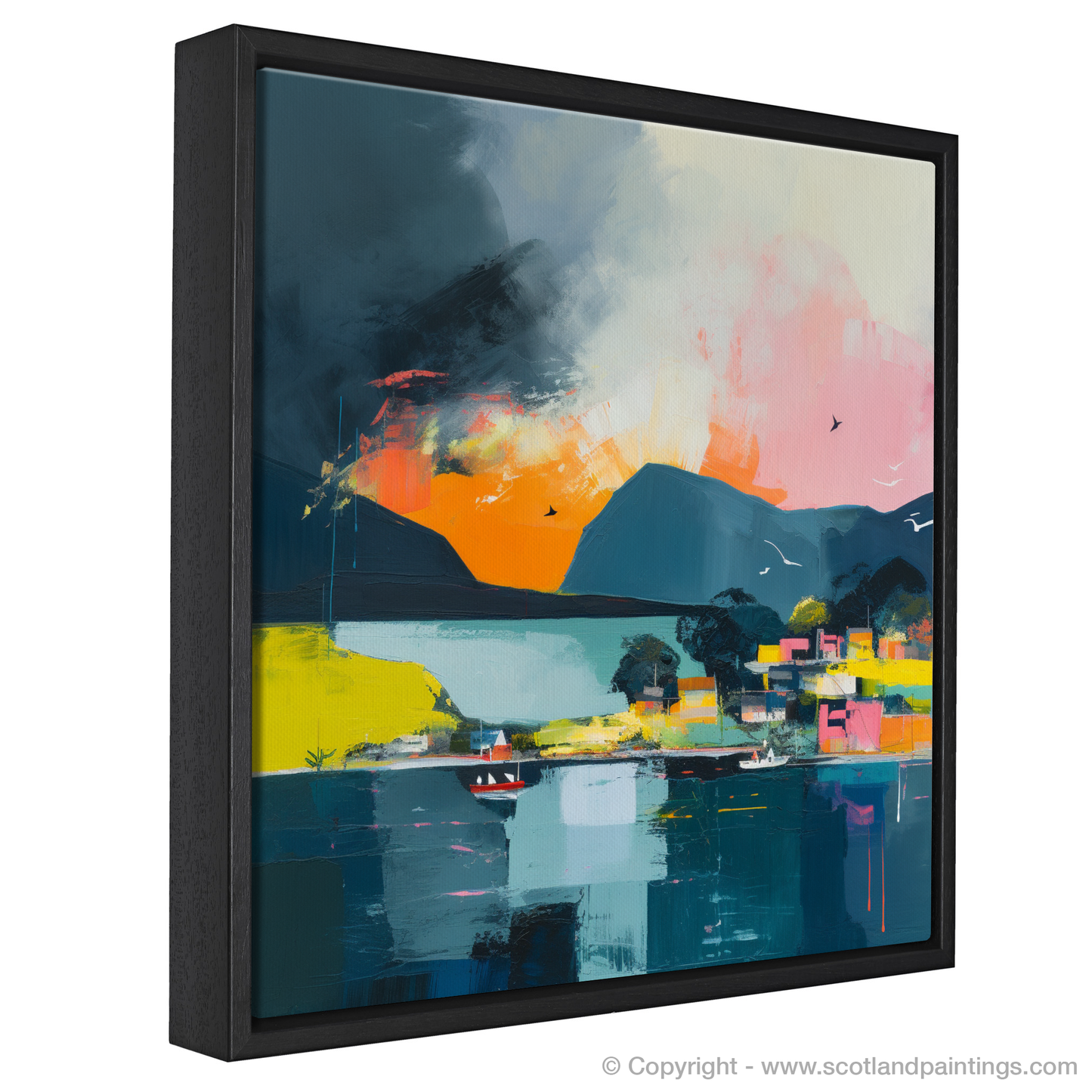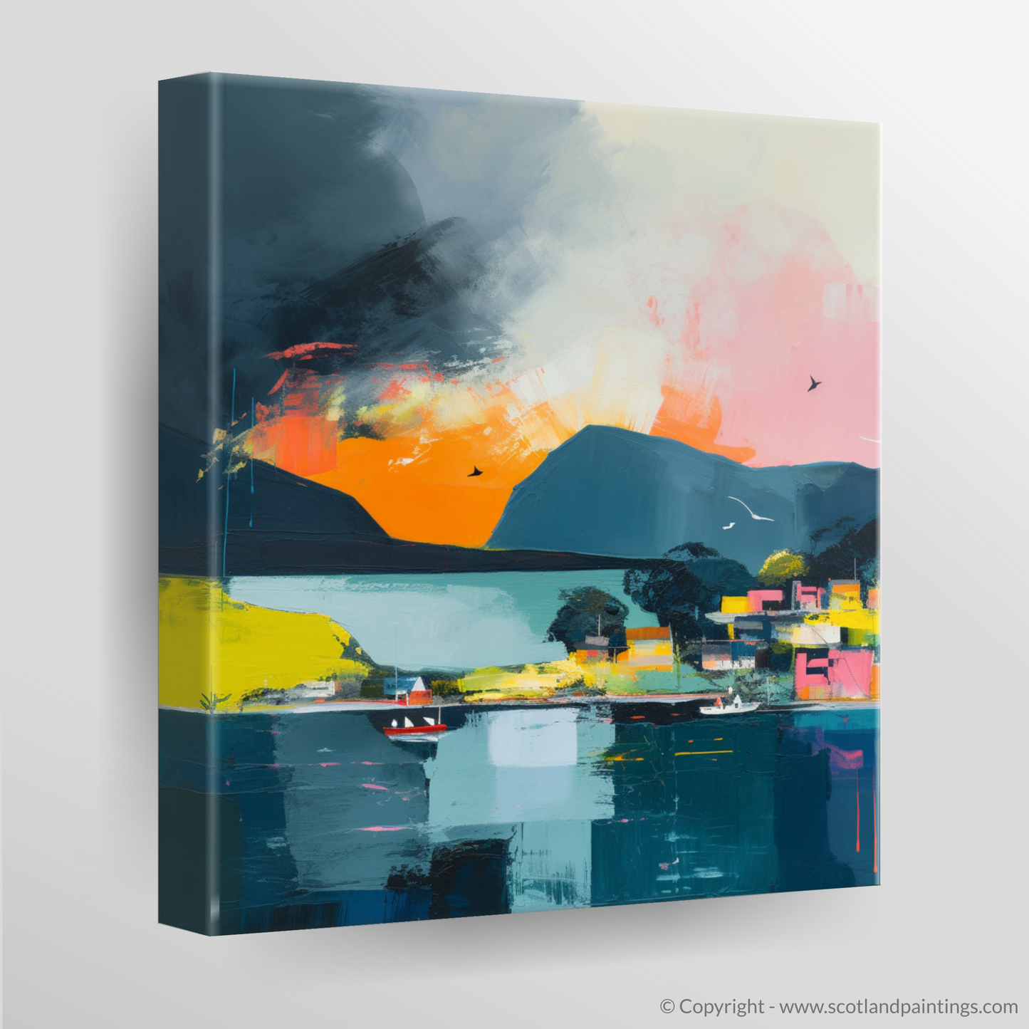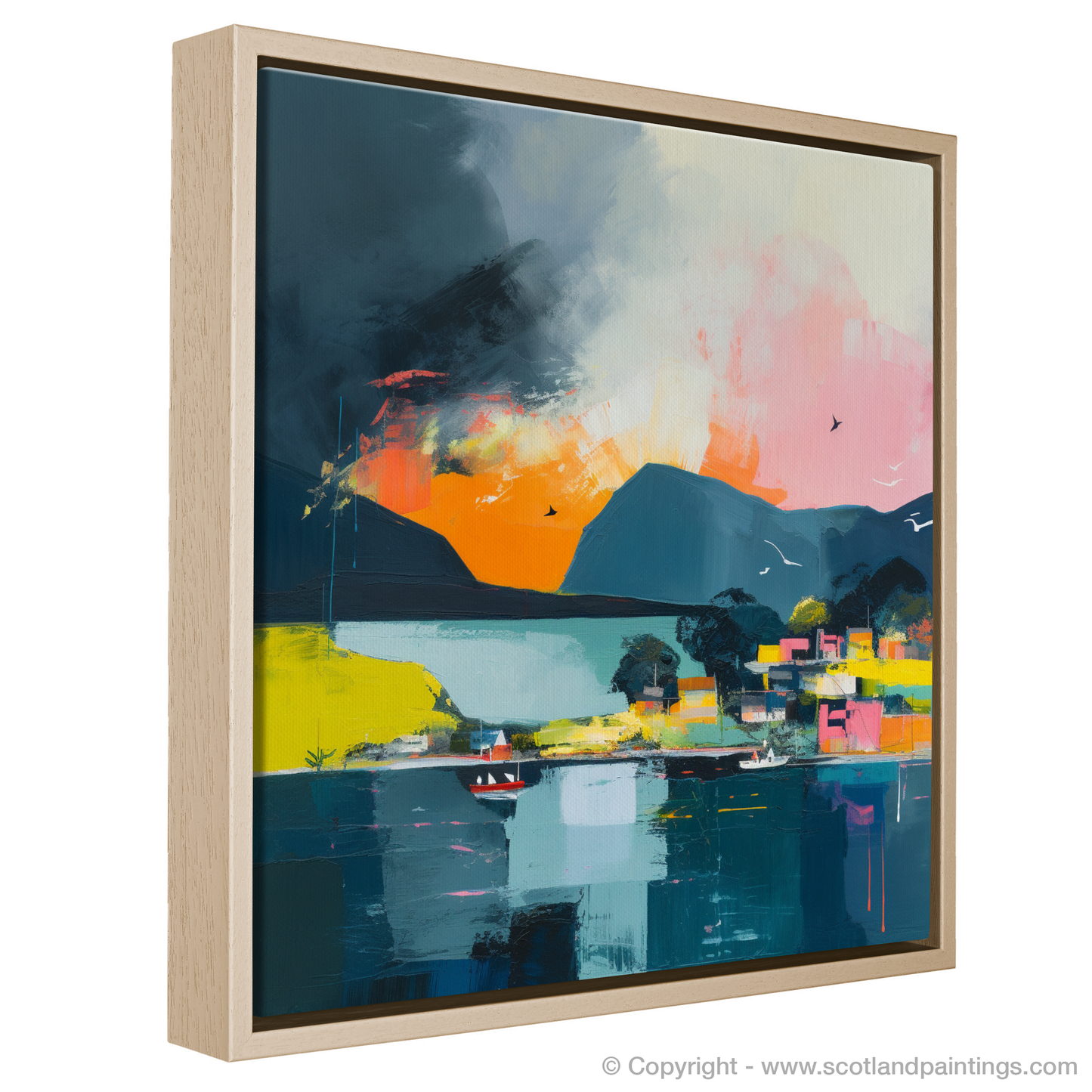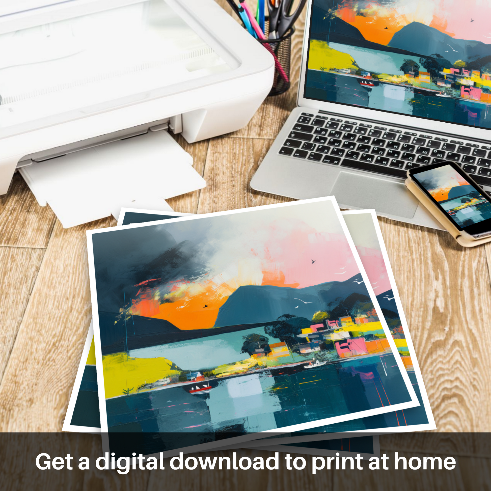 Capturing the tempestuous beauty of Balmaha Harbour with an abstract flourish, this intriguing print invites the viewer into a world where the traditional Scottish landscape is reimagined through a vibrant and emotive lens. The palette knife and broad brush strokes adopt an array of dazzling colours, with brooding, charcoal-hued clouds that loom over the scene, accentuating the storm's impending presence.