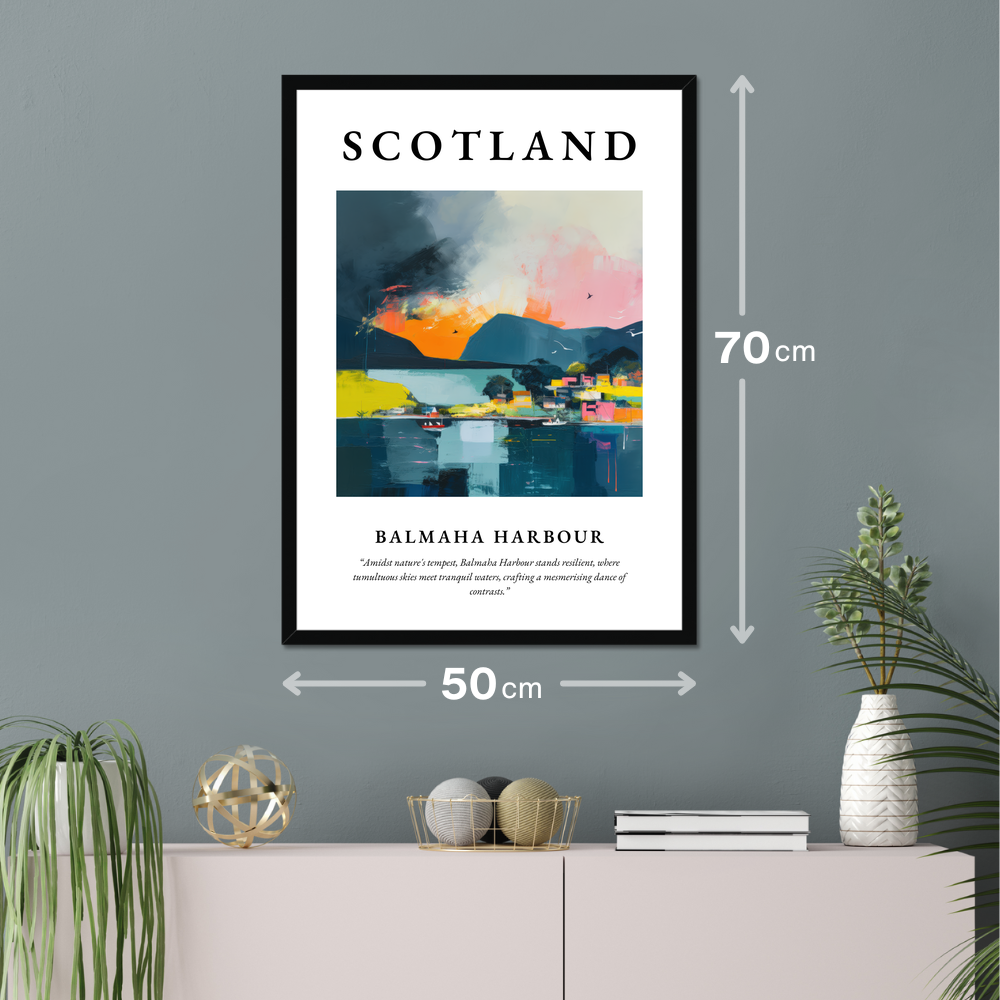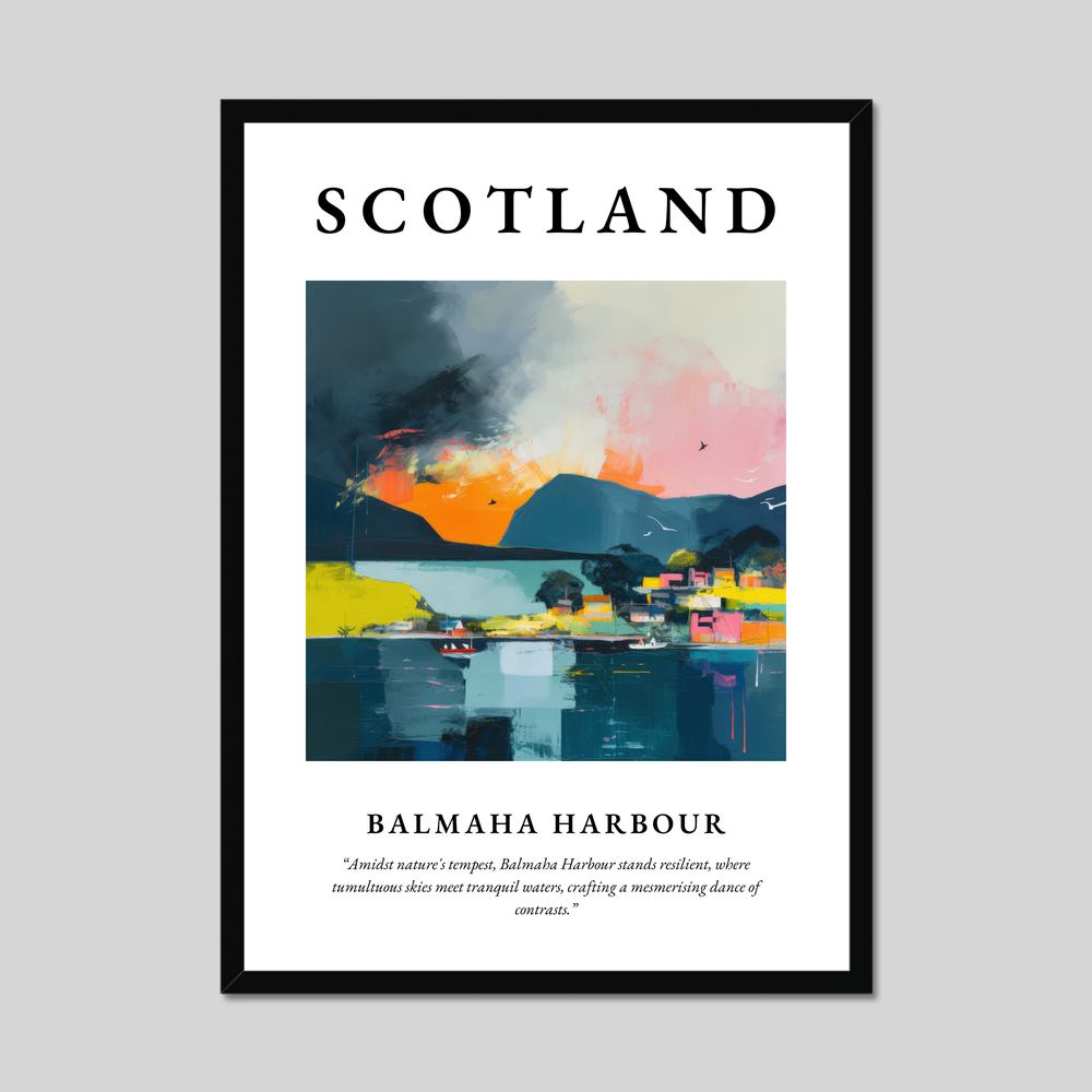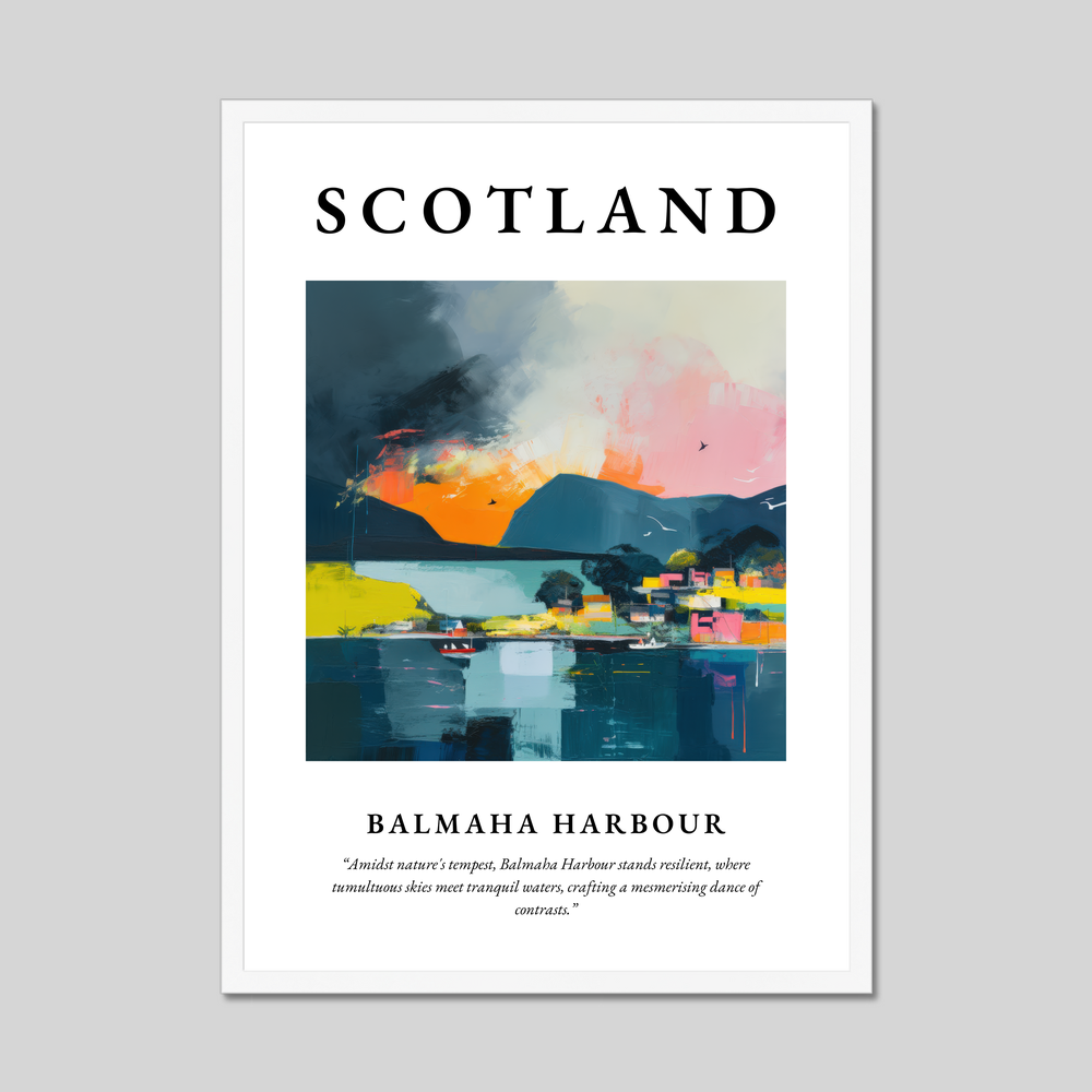 Bring a piece of Scotland into your home with this stunning 50cm x 70cm abstract poster featuring "SCOTLAND" in bold, striking letters. Below, an evocative portrayal of Balmaha Harbour captures a mesmerising dance of contrasts, where tumultuous skies meet tranquil waters. The quote beneath the painting encapsulates the spirit of this captivating location: “Amidst nature's tempest, Balmaha Harbour stands resilient, where tumultuous skies meet tranquil waters, crafting a mesmerising dance of contrasts.”
