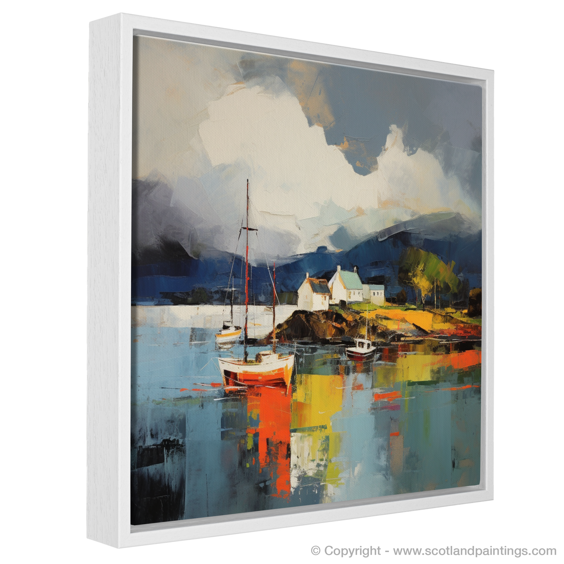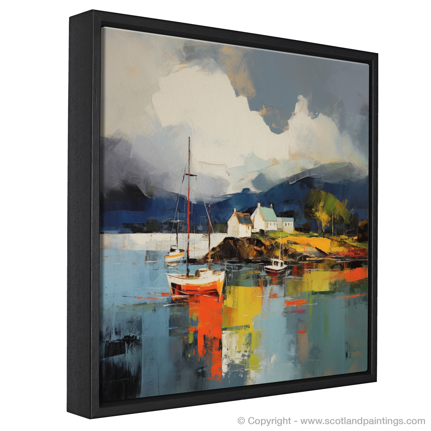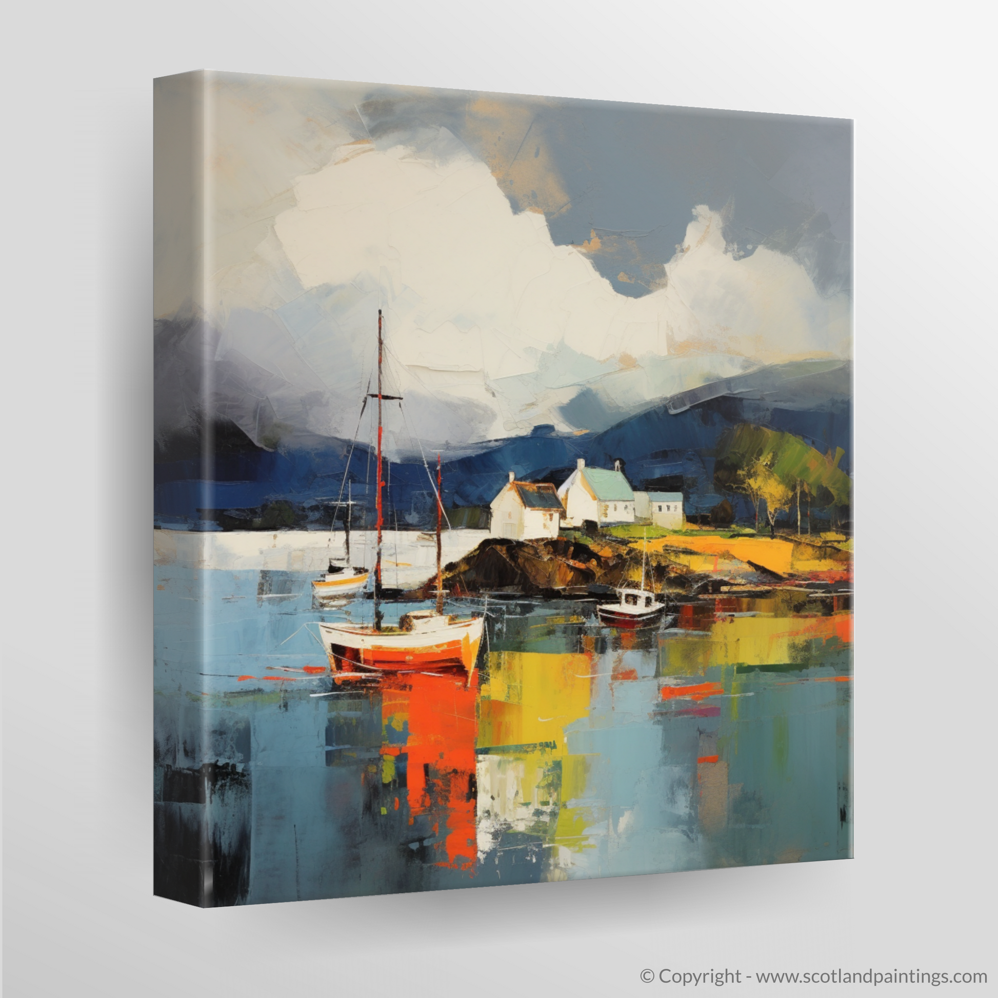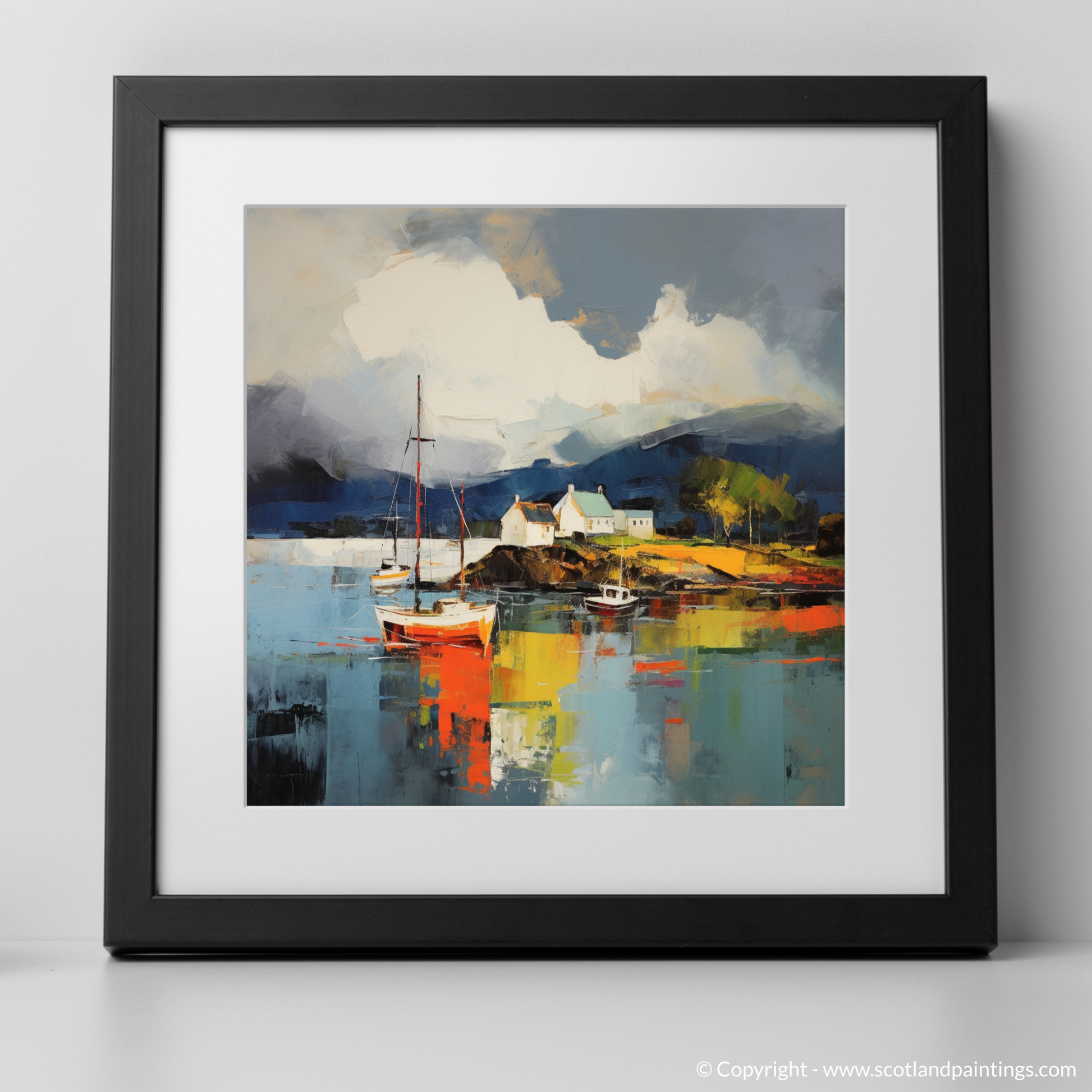The artist has masterfully employed a symphony of abstract techniques to distil both the essence of the harbour and the mutable moods of Scottish weather. The result is a thought-provoking piece that suspends the fleeting moment between calm and storm, encapsulated in a bold melee of colour and texture.