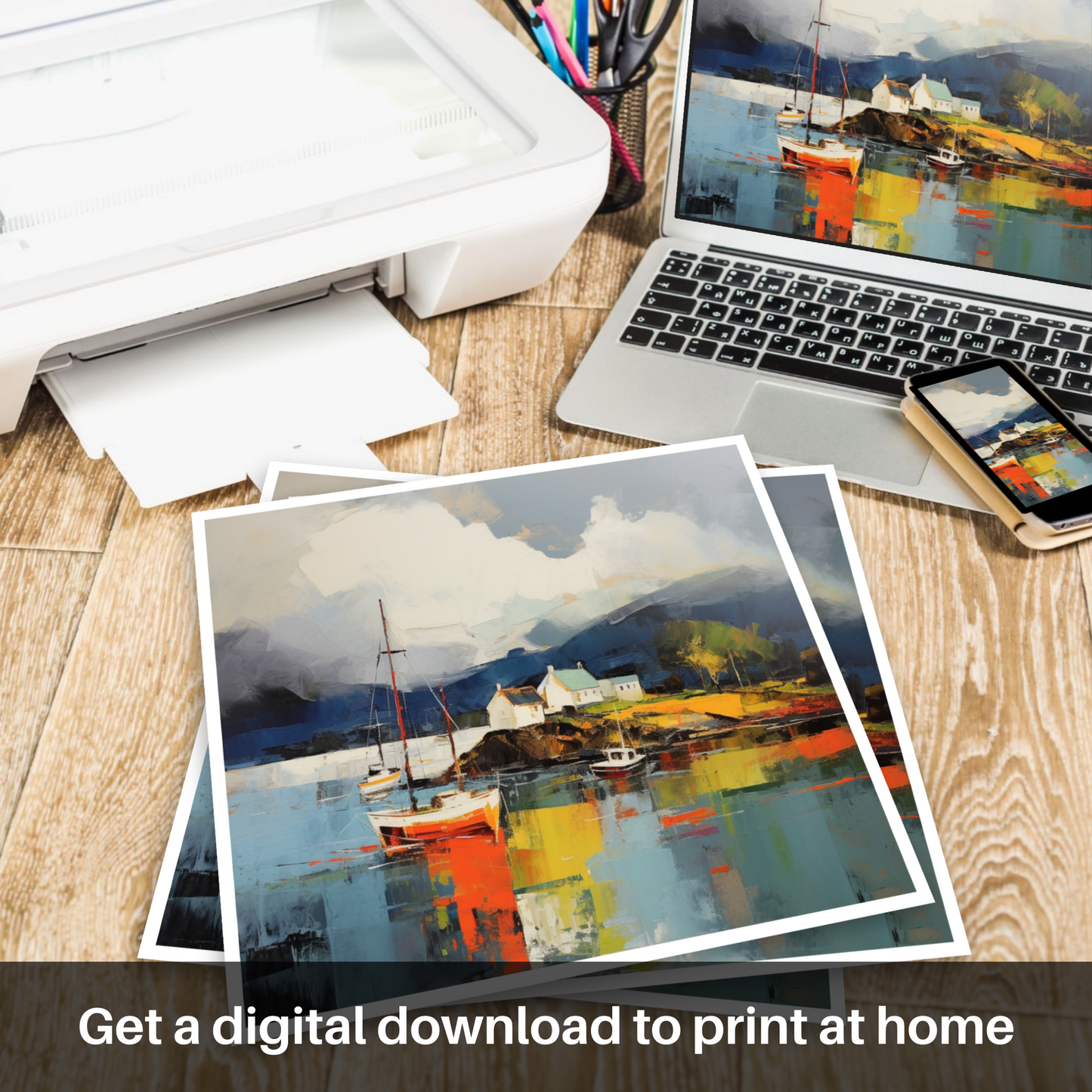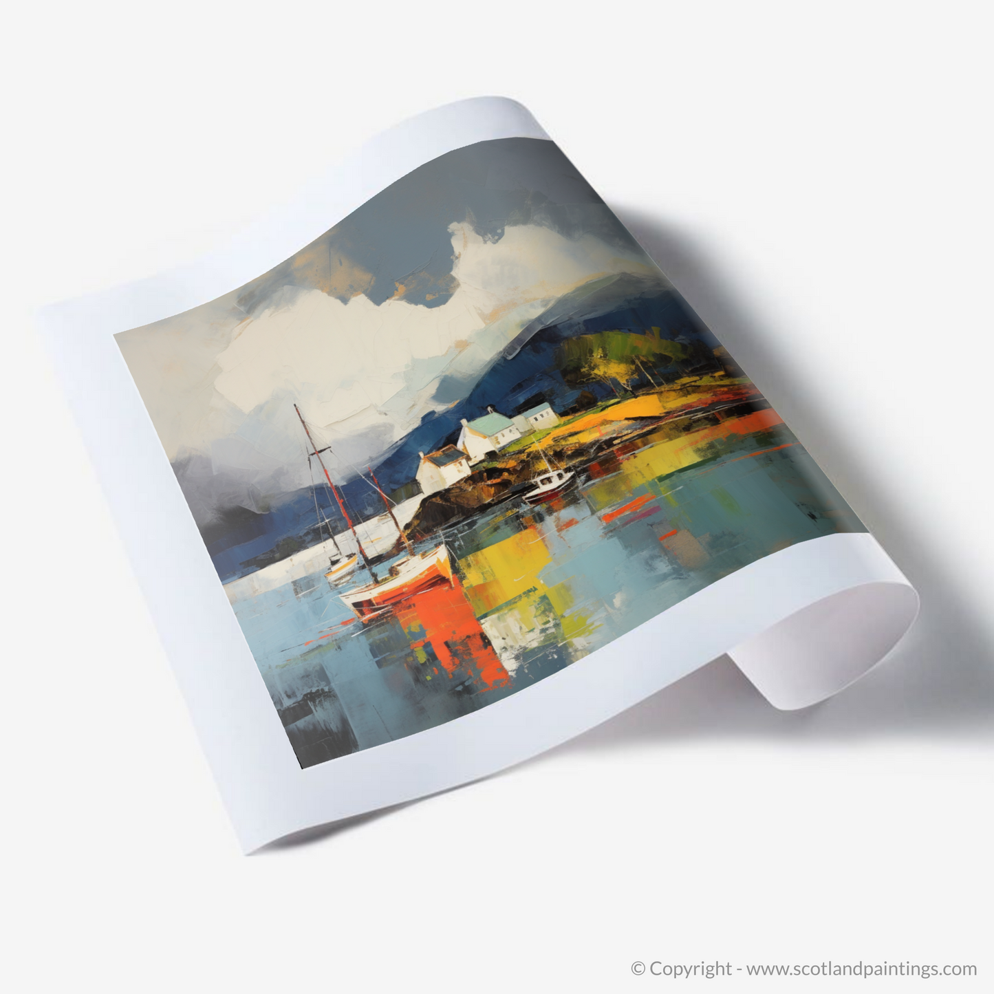 Immerse yourself in the dynamic energy and vivid atmosphere captured in this abstract depiction of Balmaha Harbour. Set against a tumultuous sky, swaths of moody blues and greys conjure the essence of a storm brewing over the waters, emphasising the untamed spirit of Scotland's natural landscapes. The horizon is bisected by a stark contrast - a band of clear, white light suggesting an impeding break in the clouds, offering a fleeting glimpse of tranquillity amidst the chaos.