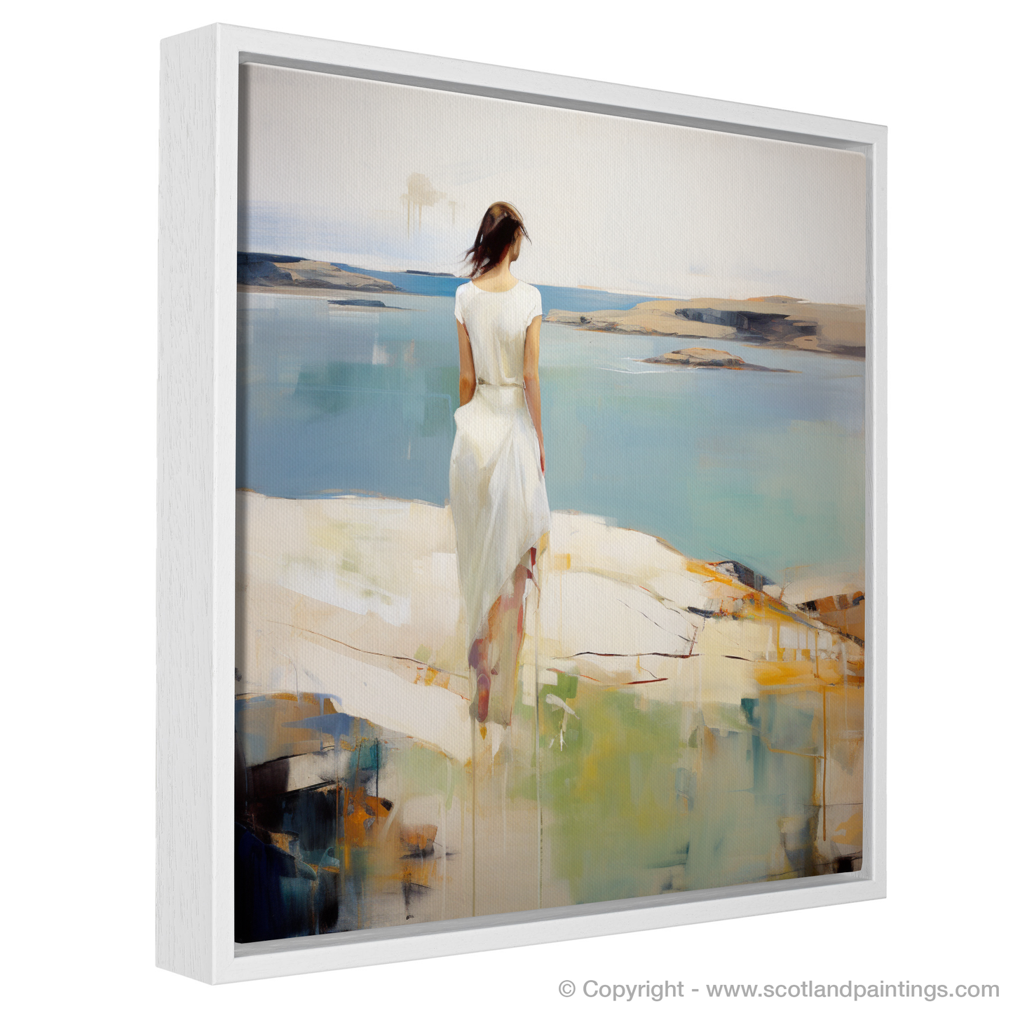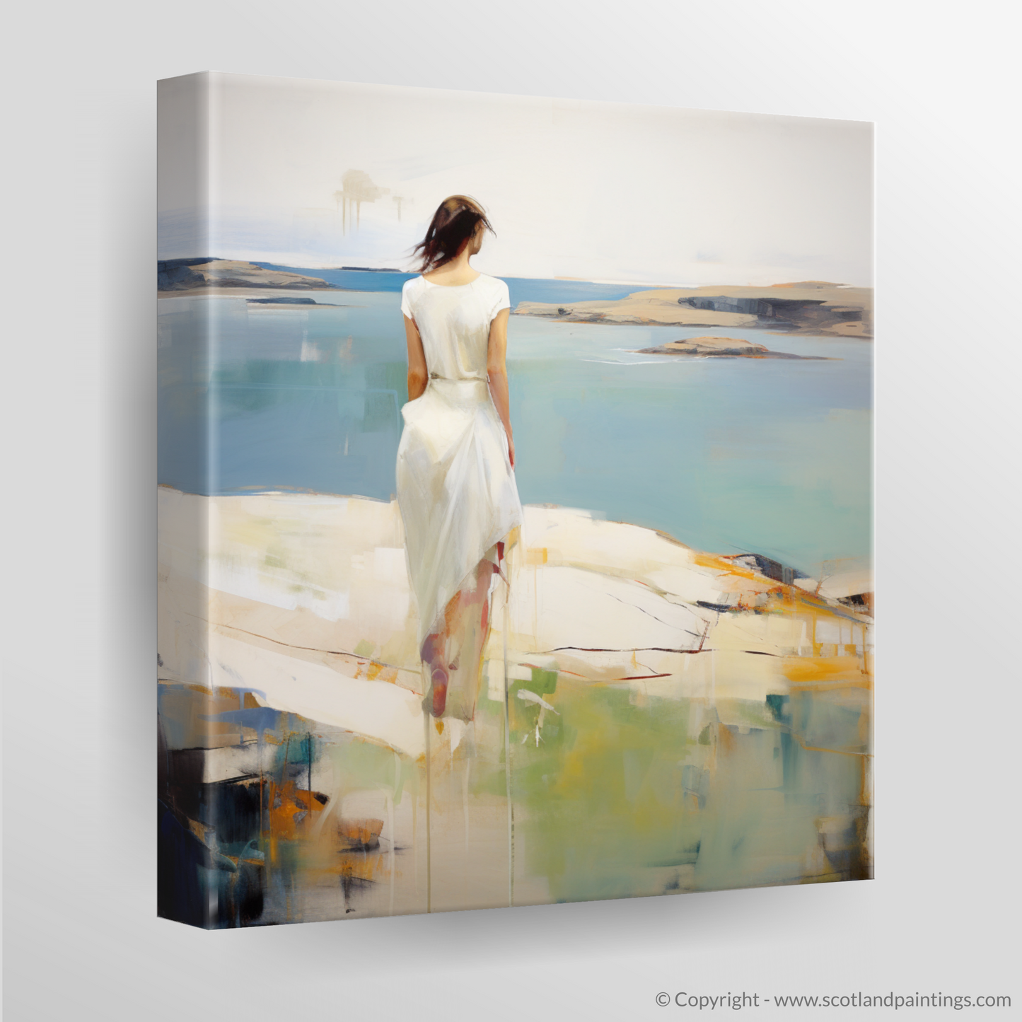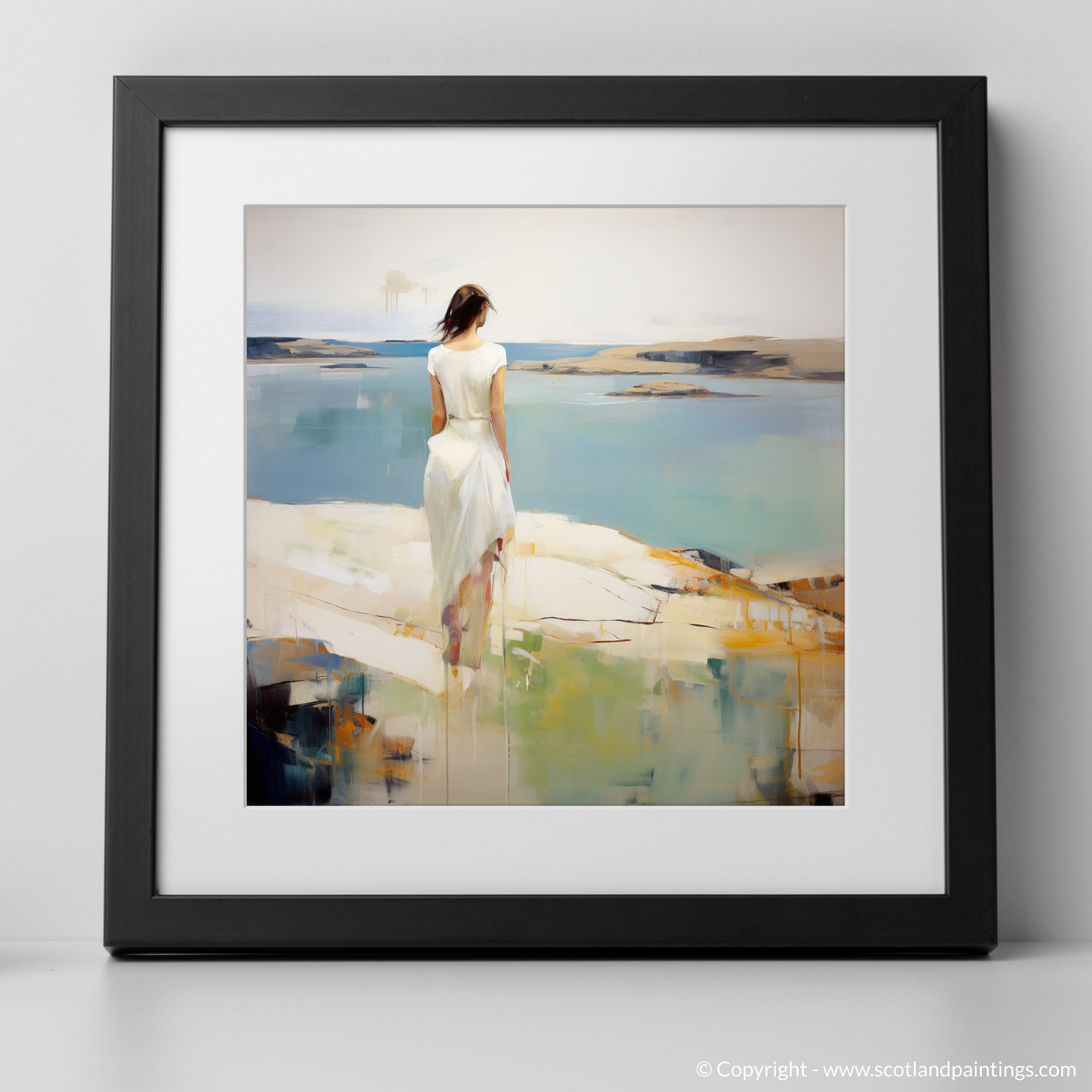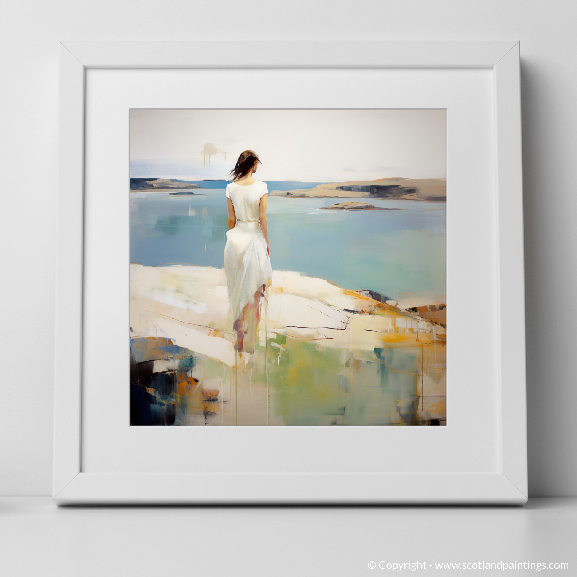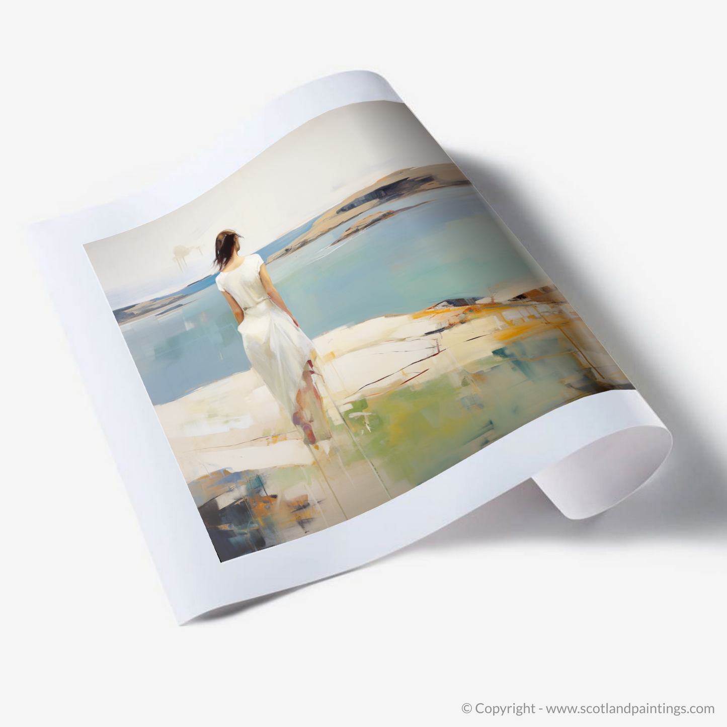 Captured within this print is a moment of serene contemplation as a woman stands poised in her ethereal white dress, set against the rugged beauty of the Isle of Iona's shoreline. The abstract style infuses the scene with emotion and energy, accentuating the harmony between the figure and the landscape.