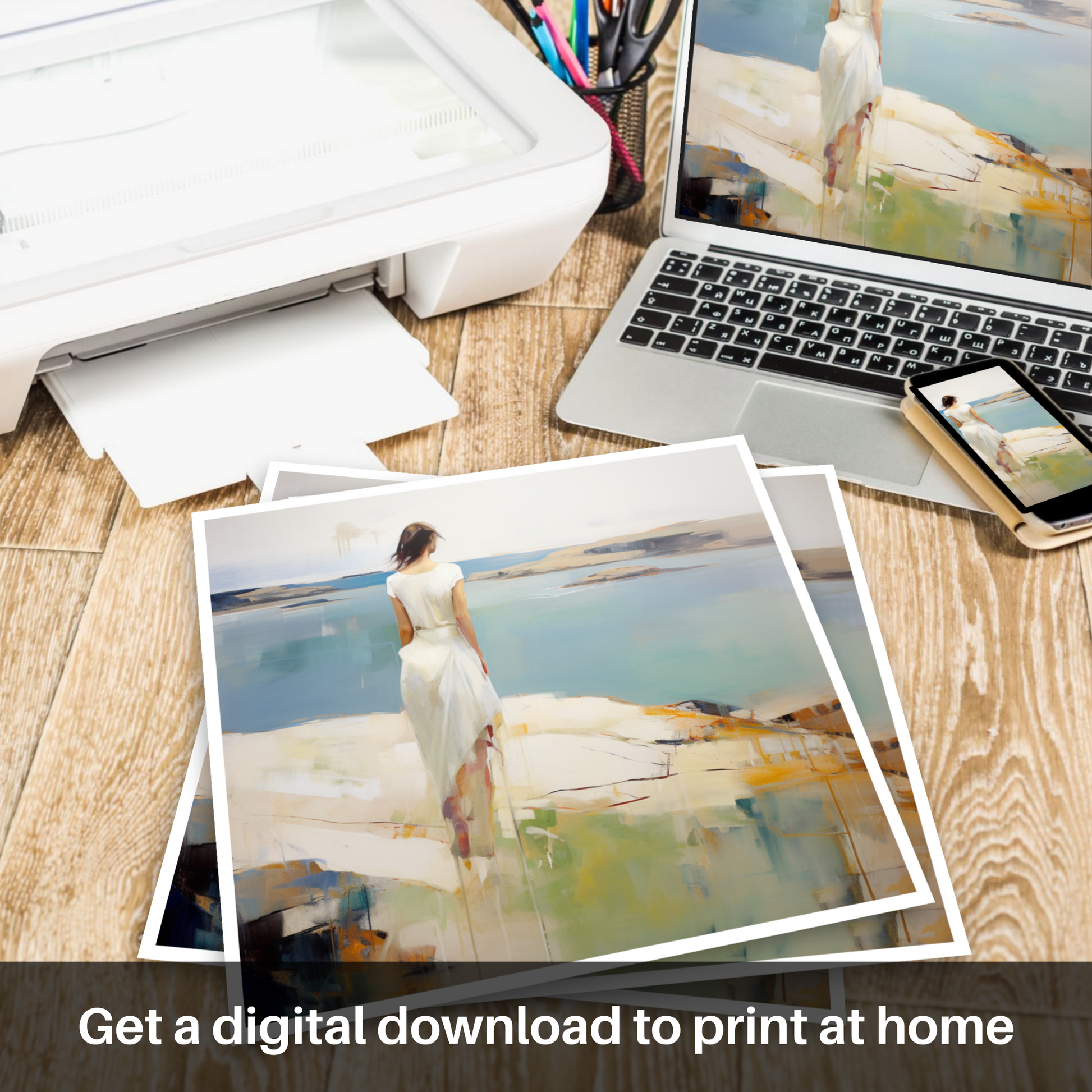 This print, a fine addition to our 'White Dress' collection, offers a transcendent experience, blending the abstract with the figurative to create a piece that is as introspective as it is visually engaging. It's a reverie frozen in time, a moment where the rugged whispers of the isle converge with the softness of a white dress and the infinite contemplation of its wearer.