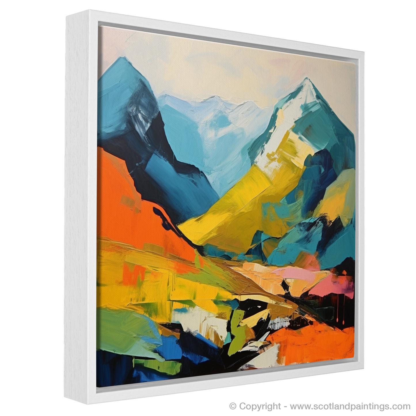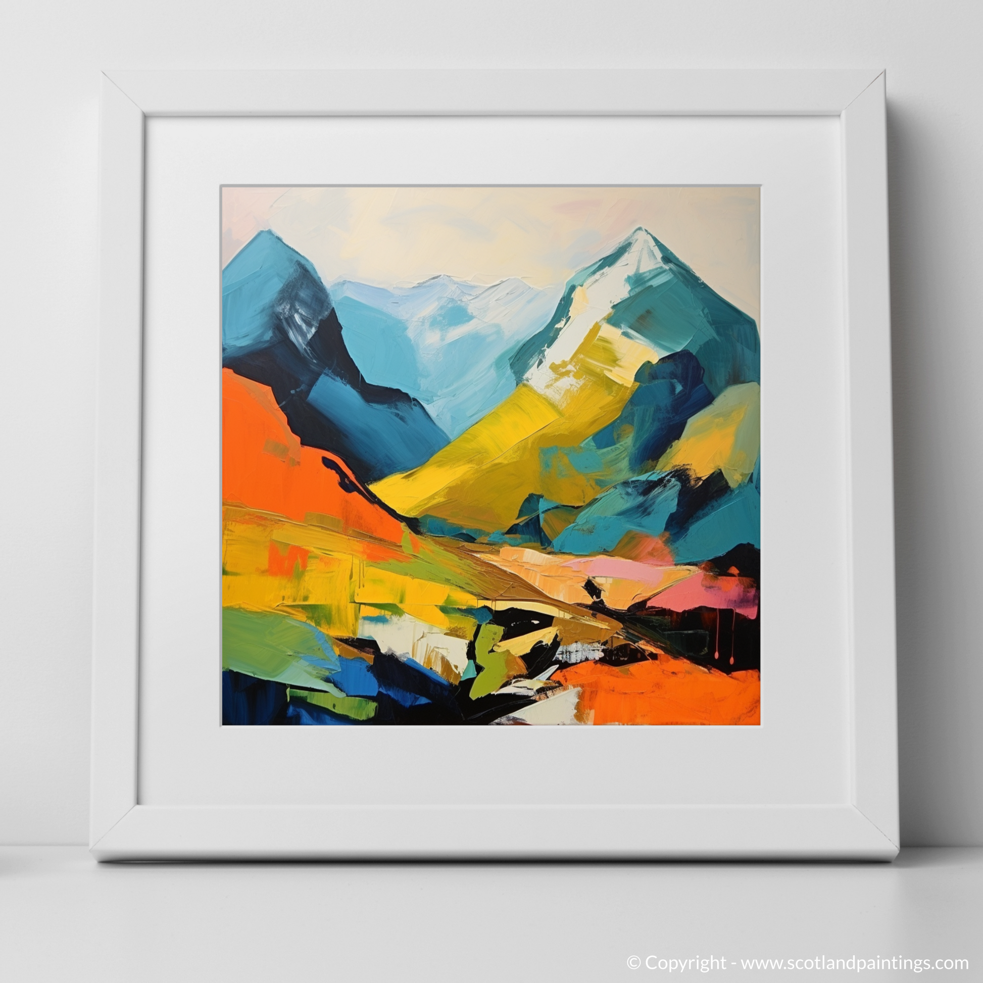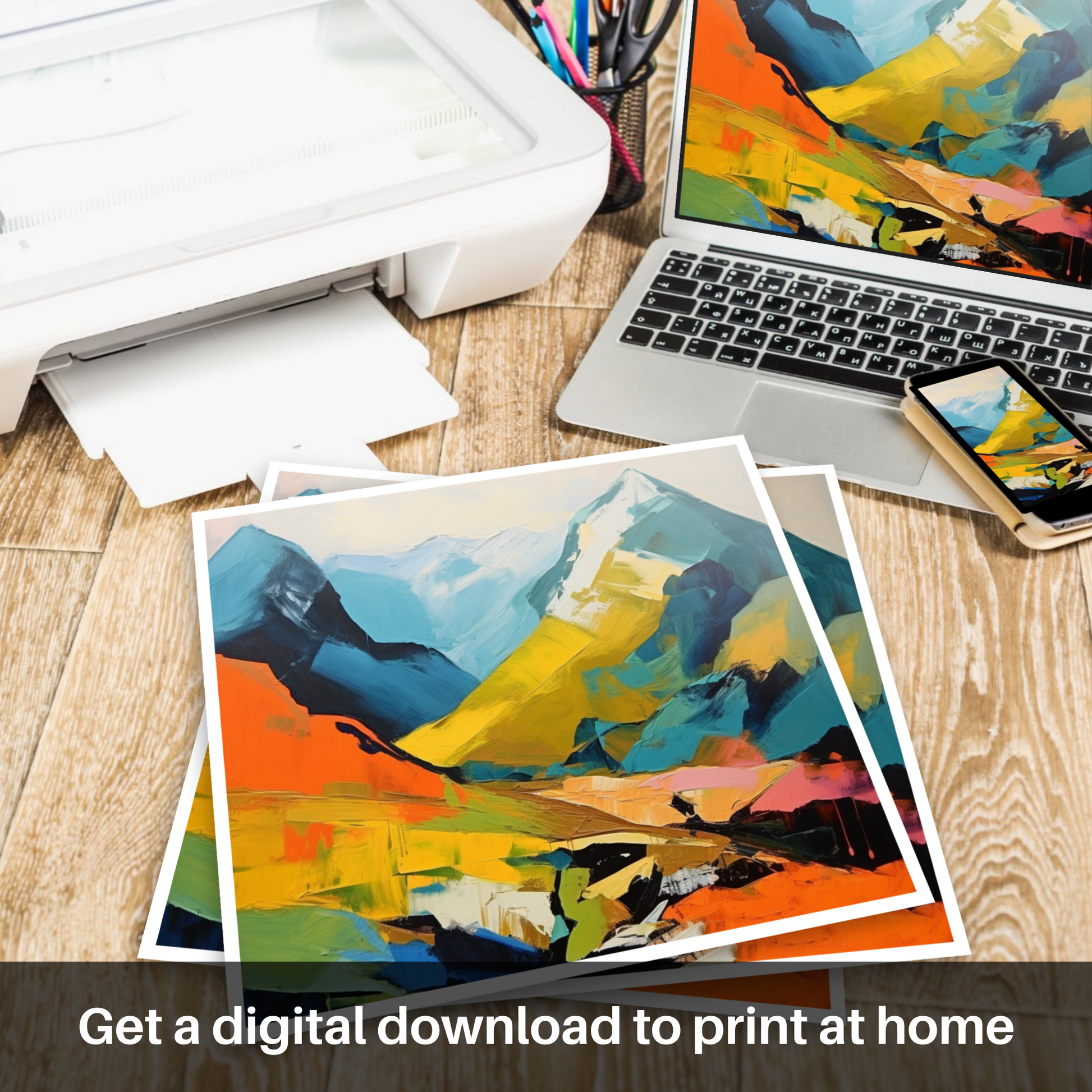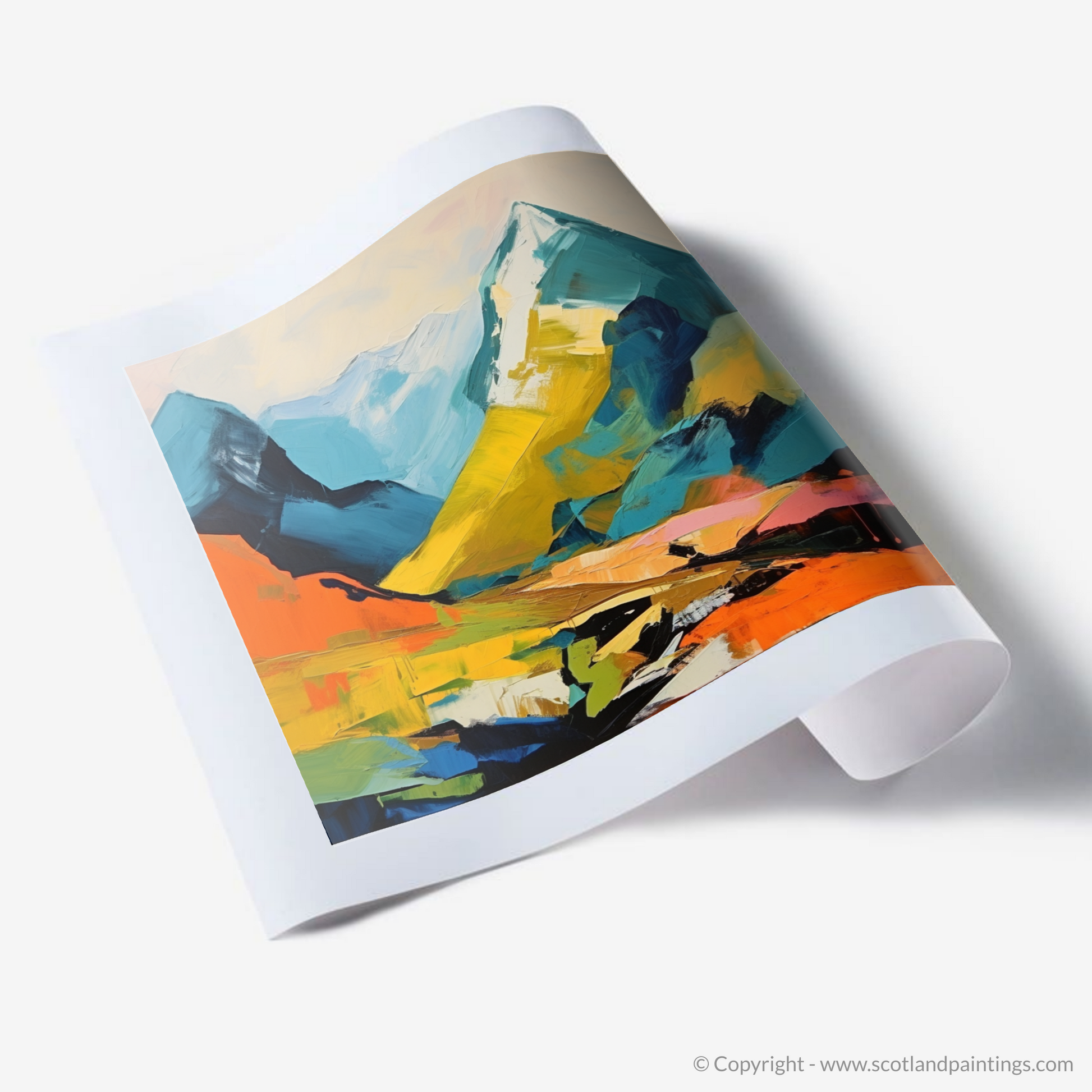 Bask in the vivid expression of Scotland's natural grandeur through this captivating abstract portrayal of Aonach Eagach, nestled within the world-renowned Highlands. This evocative print encapsulates the raw energy and contrasting tranquillity of the Scottish mountainous landscape, reimagined through a luminous spectrum of colours and bold, sweeping brushstrokes that dance across the canvas.