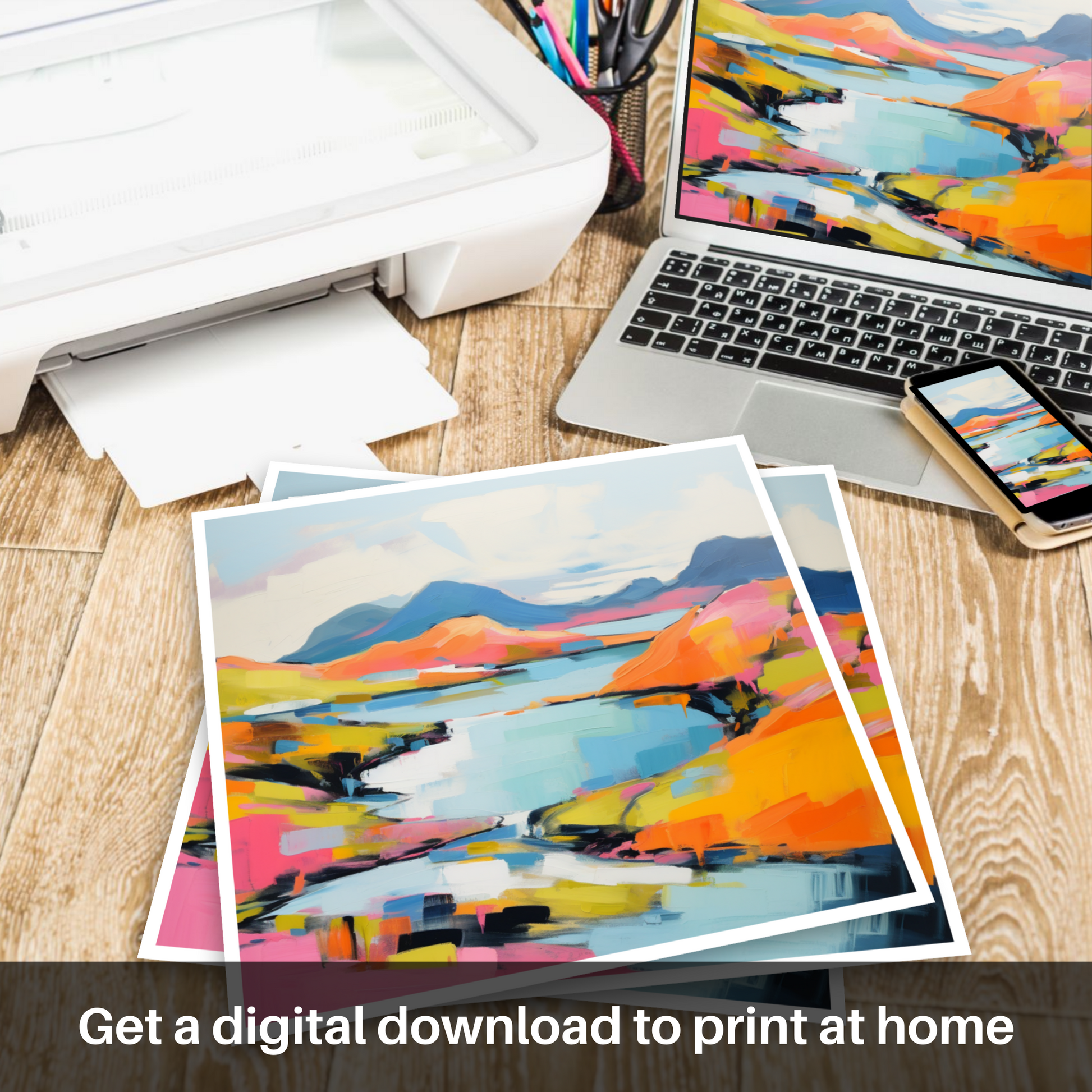 Immerse yourself in the vibrant essence of the Scottish Highlands with a print that captures the spirit of Loch Morar through a mesmerising abstract lens. Swathes of bold, sweeping brushstrokes dance across the canvas, conjuring images of the tranquil loch nestled amongst undulating hills. Vivacious hues of tangerine, cerise, and lemon zest infuse the landscape with a dream-like quality, their brilliance mirrored in the serene blue of the water's surface.