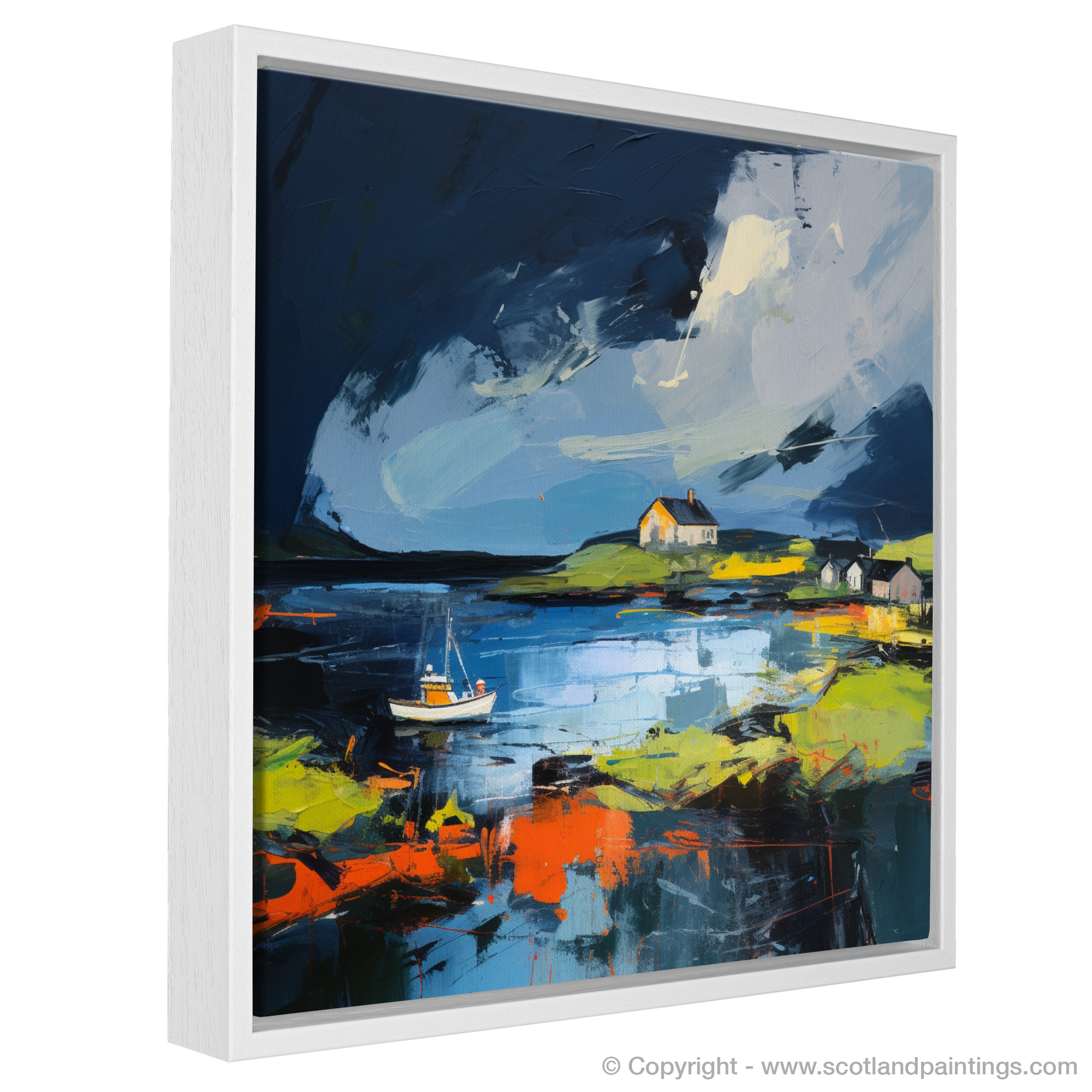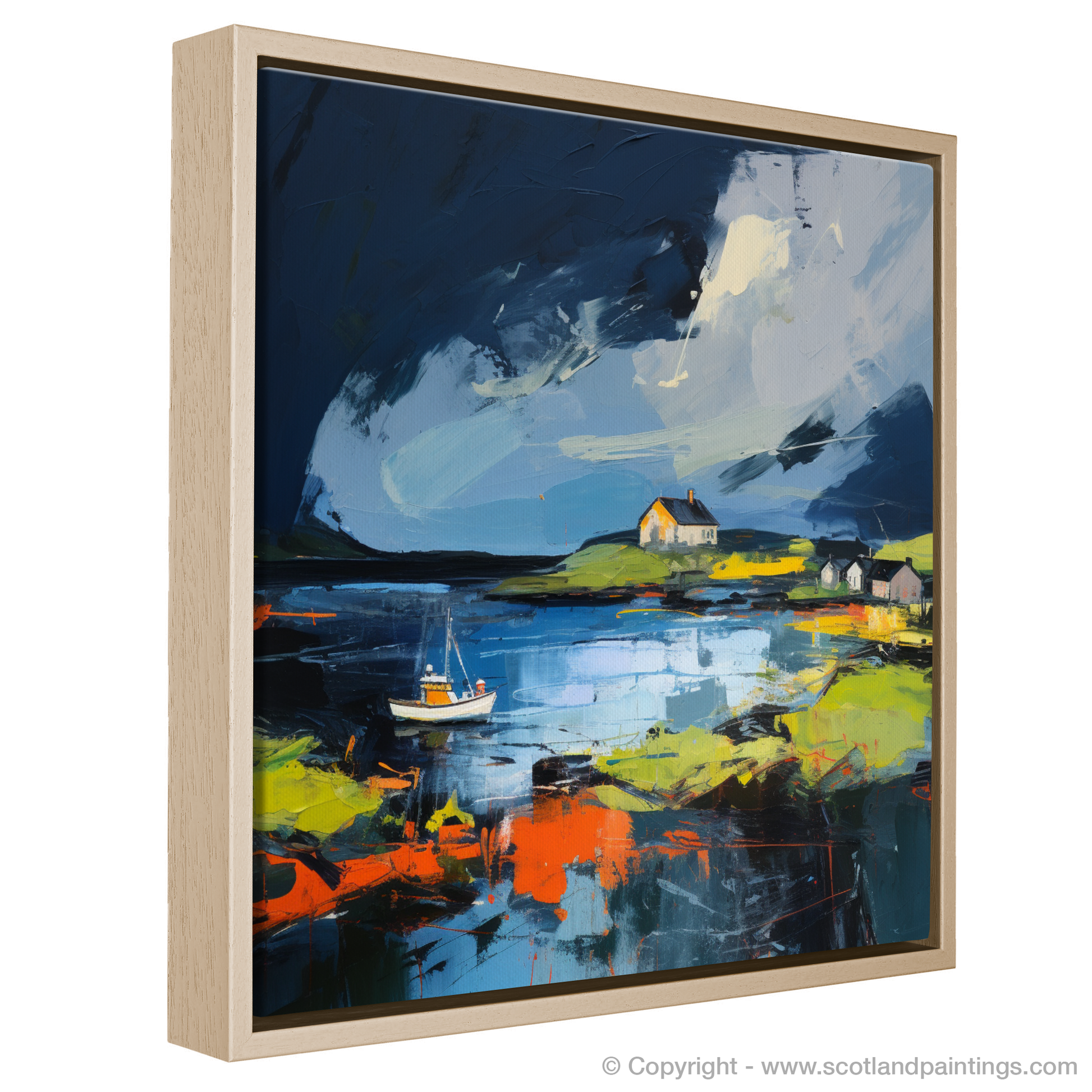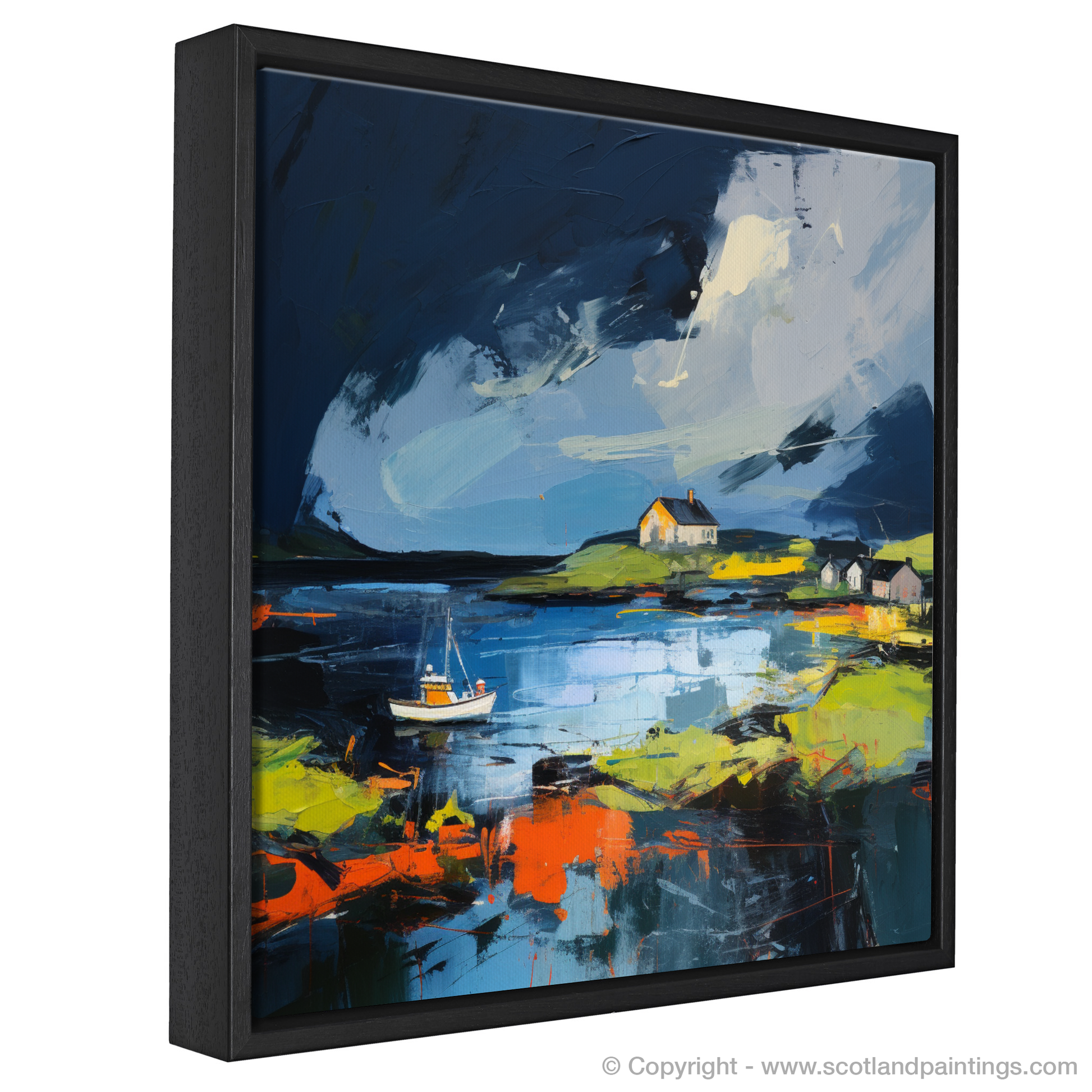 As if observing through the eyes of a dream, this abstract rendition of Isleornsay Harbour captures the untamed beauty of the Scottish coast with an almost-tangible energy. Swathes of deep blue and black dominate the upper expanses, suggesting a stormy sky rolling with intensity over the secluded haven. The threat of tempest is palpable, yet beneath this brooding canopy, the imagery unfolds in an array of exhilarating colours that defy the sombre mood above.