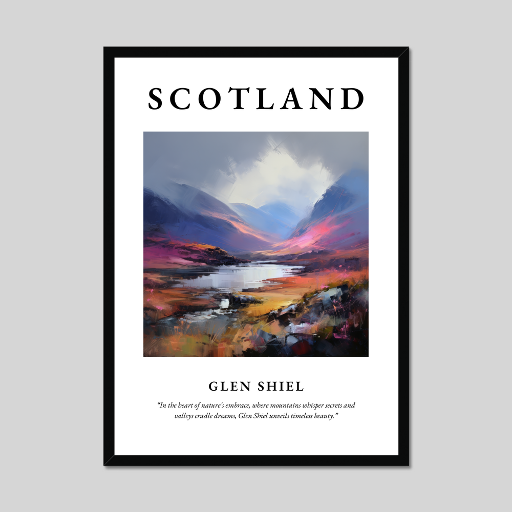 The painting reflects the glen’s soulful landscape, echoing the whispers of ancient warriors and the dreams nestled in its valleys. Whether you’ve visited Glen Shiel, long to explore its trails, or simply admire its rugged beauty, this poster is a portal to everything you love about Scotland. Let it transport you to a land where dreams are cradled by nature's embrace.