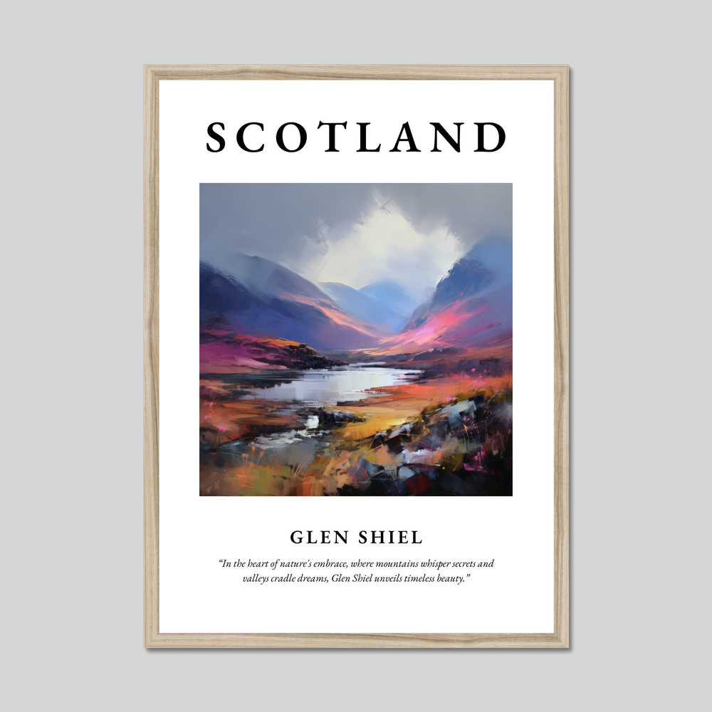 Embrace the allure of Scotland with our striking framed poster, an homage to the breathtaking beauty of Glen Shiel. At a commanding size of 50cm x 70cm, this piece transforms any room, bringing the dramatic Scottish landscapes into your home. Available in a sleek black, crisp white, or elegant natural wood-effect frame, it's easy to match with any decor while making a bold artistic statement without breaking the bank.