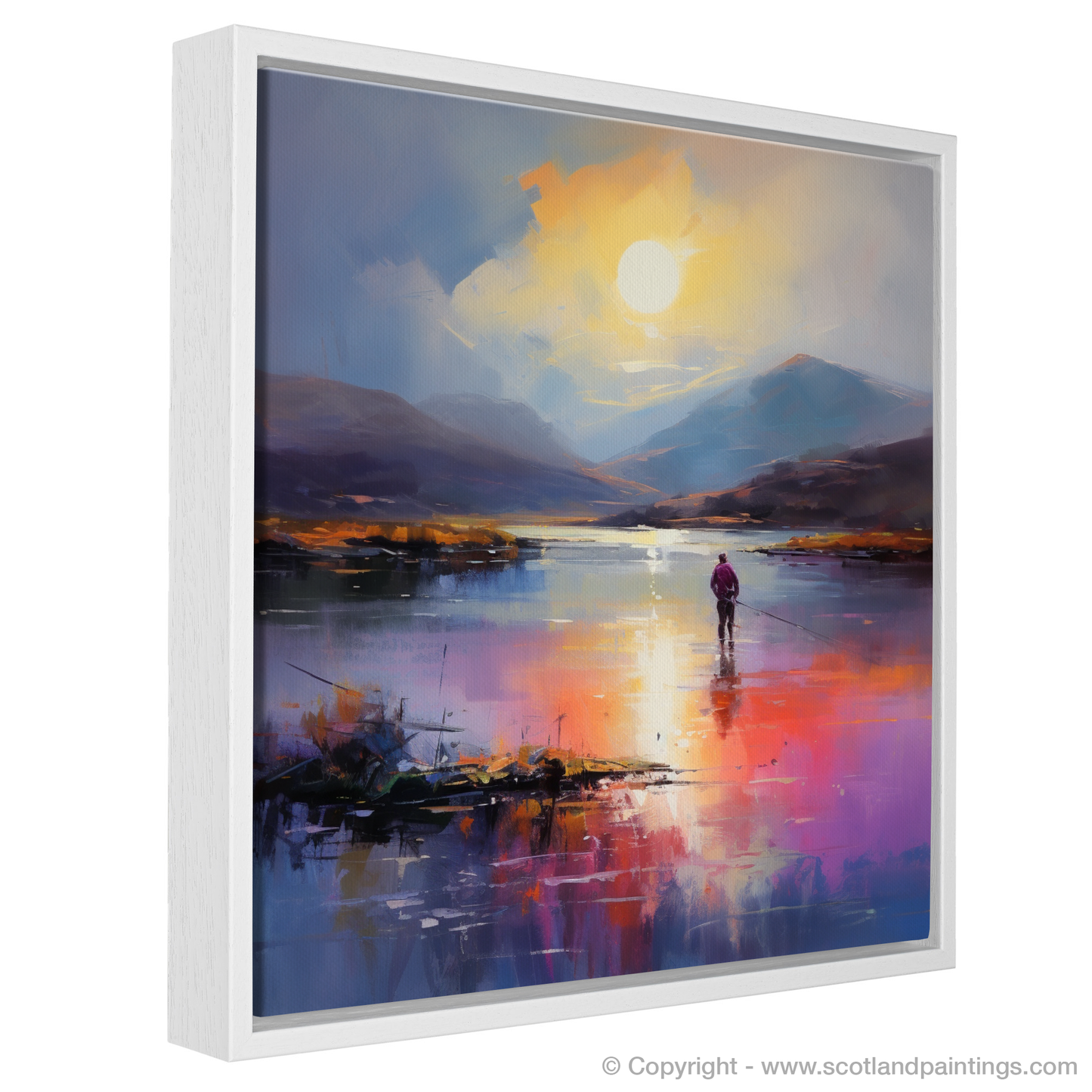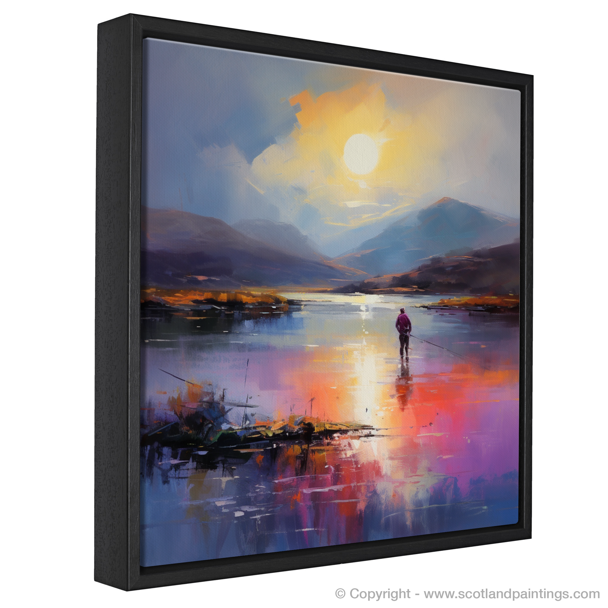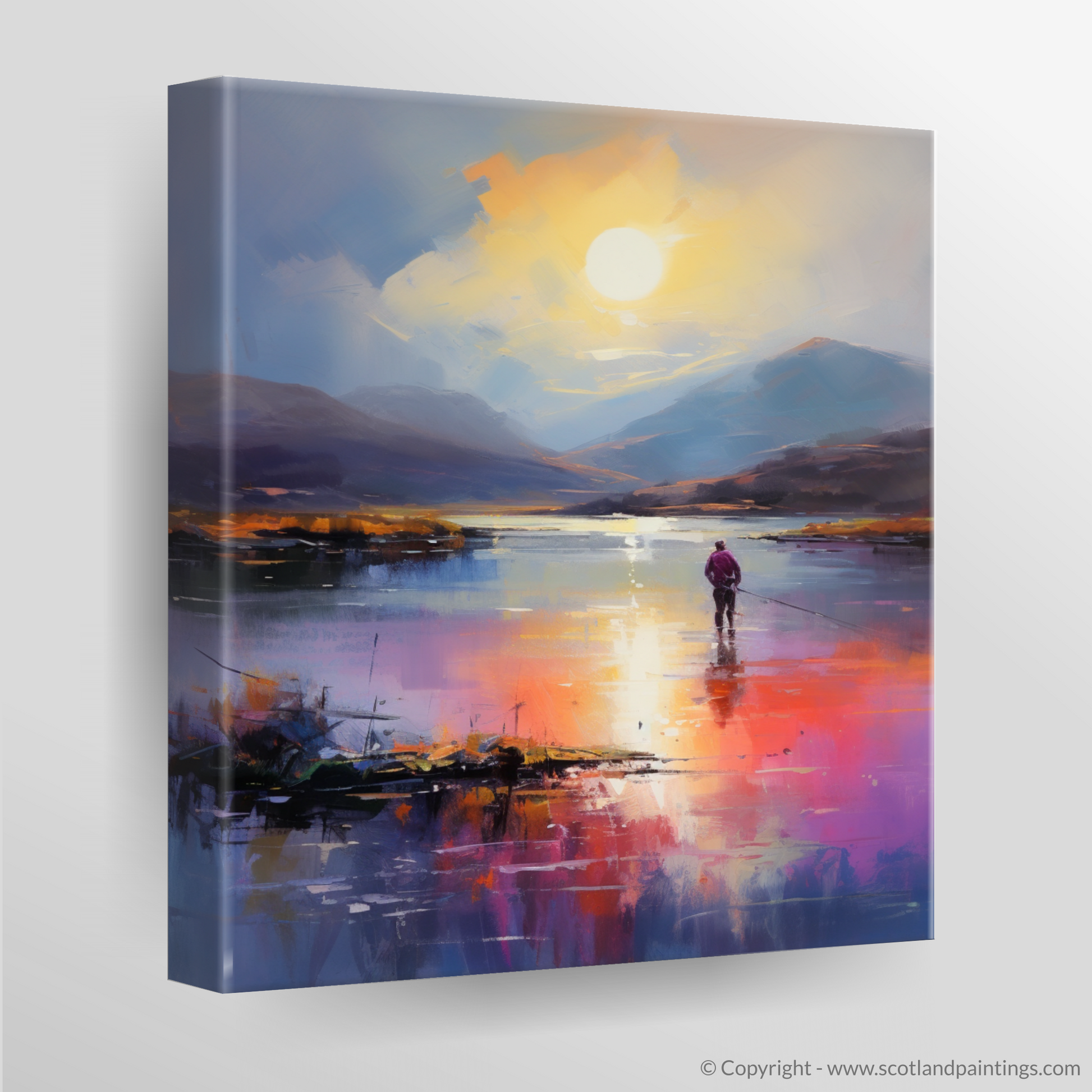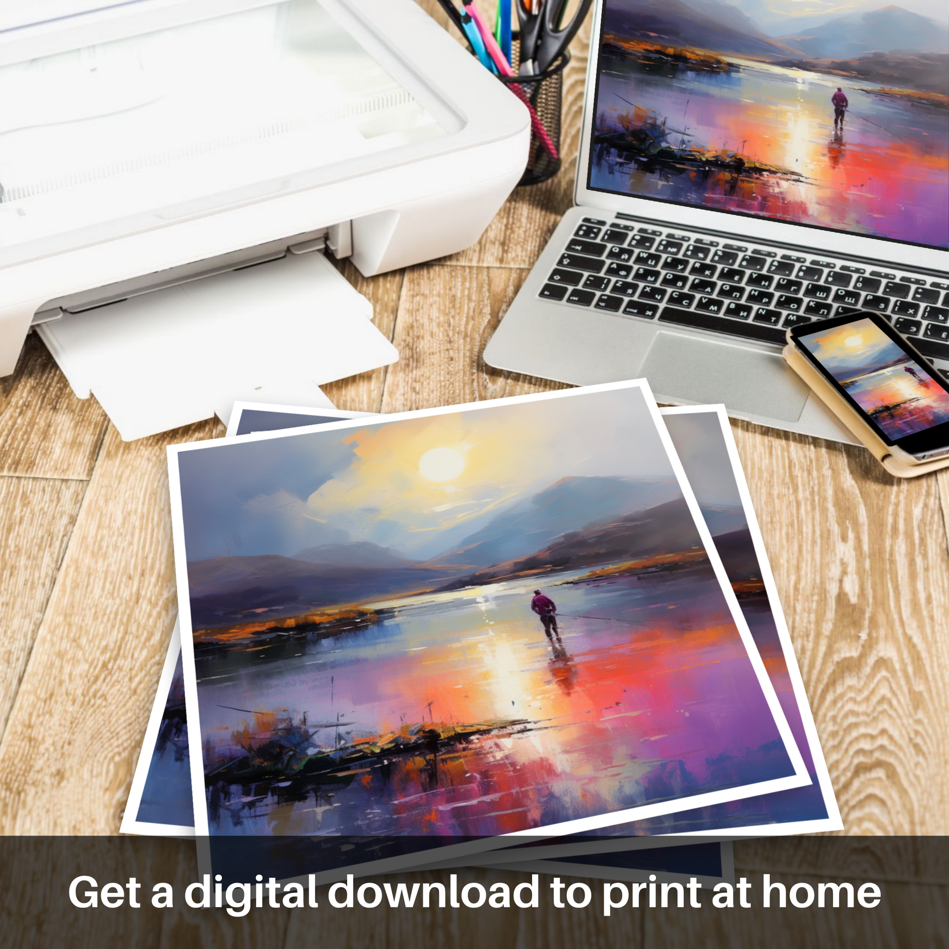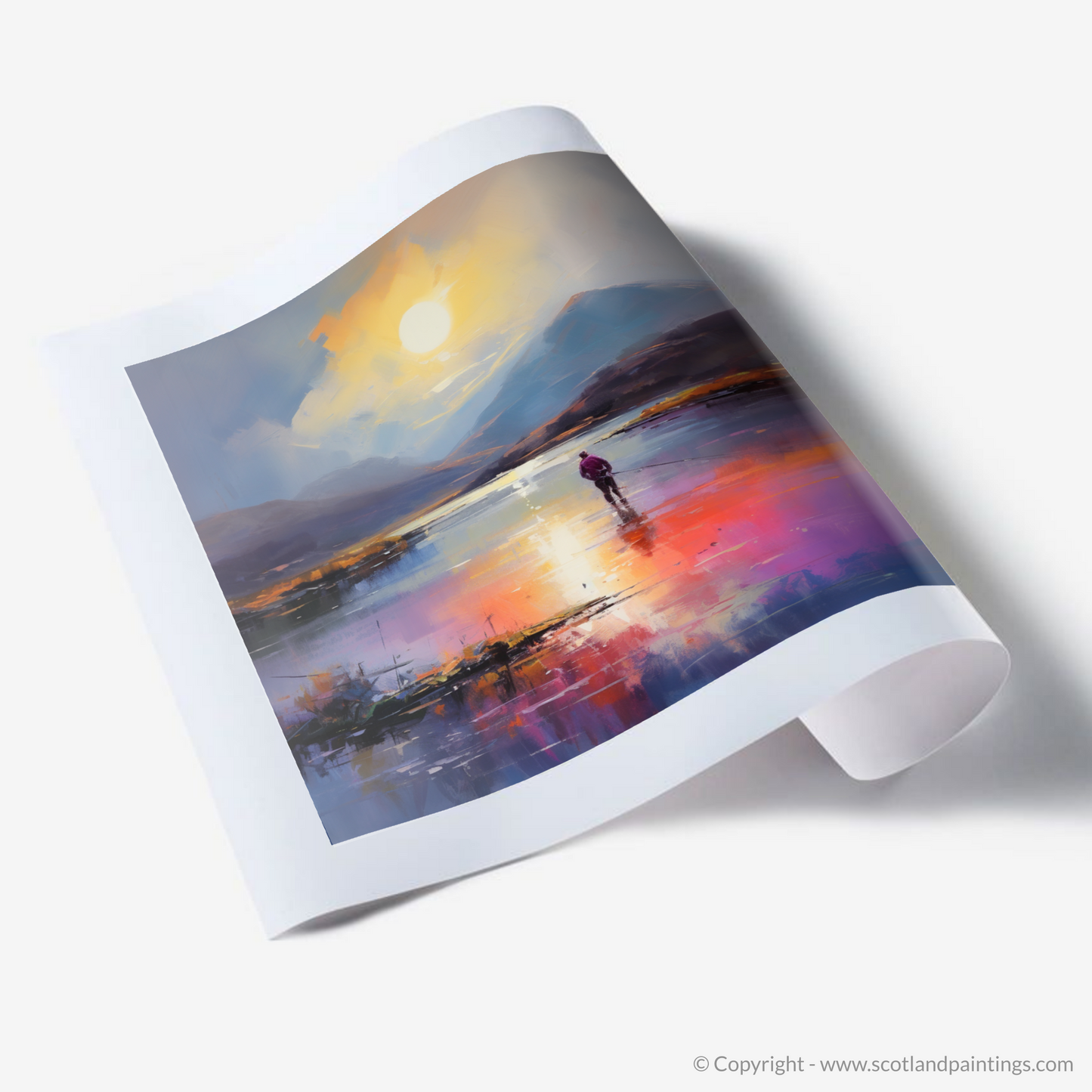 Let the tranquil essence of dawn over the Scottish Highlands envelop you with our evocative print. The serene expanse of Loch Assynt unfolds before you, captured in an explosion of expressive colours and emotive brushstrokes characteristic of the Expressionist style. A lone figure, immersed in the solace of fly fishing, stands as a focal point amidst the shimmering reflections of the sun-kissed waters.