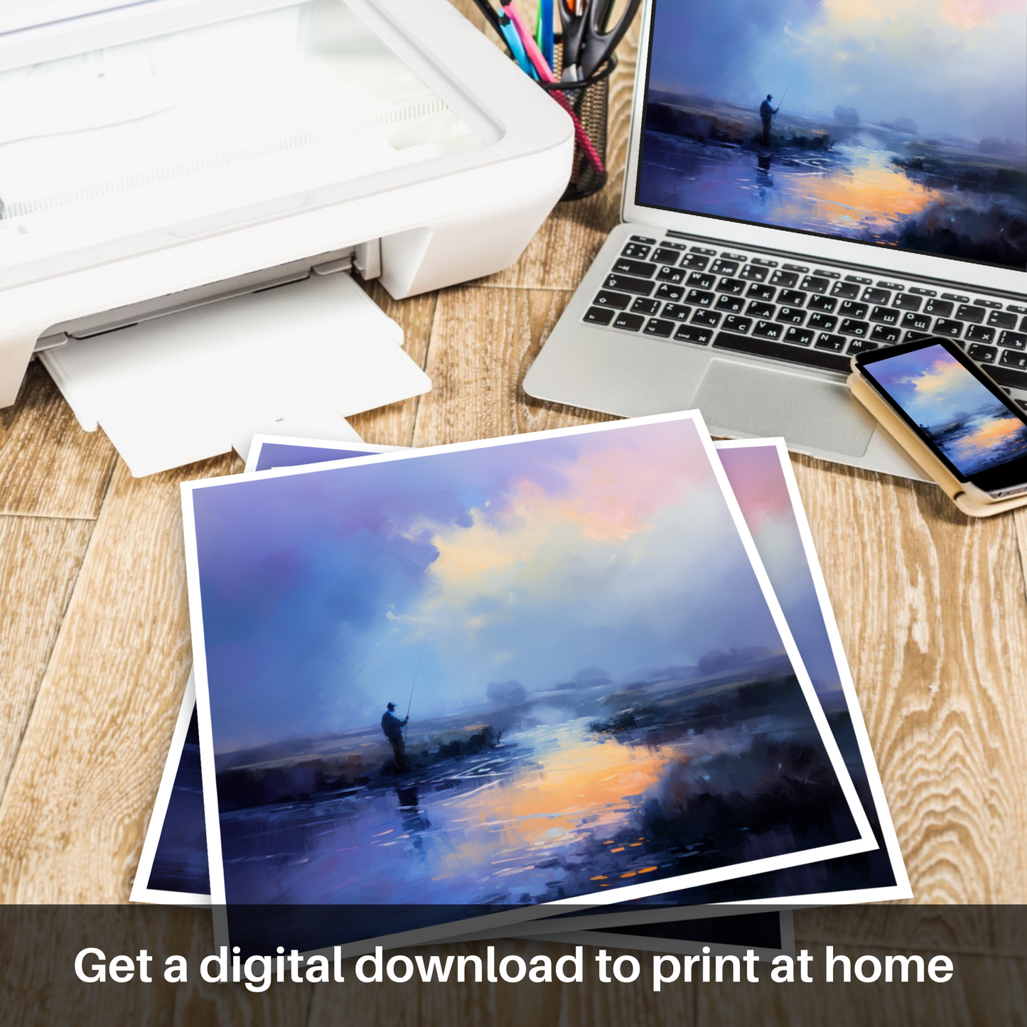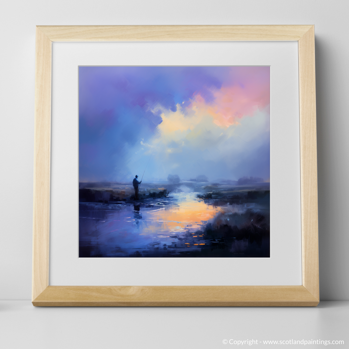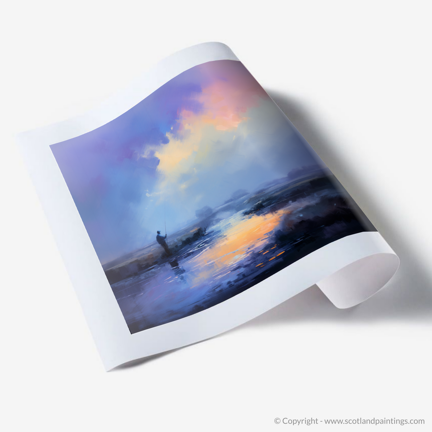 As the evening mist delicately unfurls over the tranquil waters of the River Don, a solitary figure emerges – a man engaged in the timeless art of fly fishing. This evocative print captures the serene essence of a Scottish evening, where the subtle interplay of light and shadow converge to create a playfully expressionistic depiction that soothes the soul.