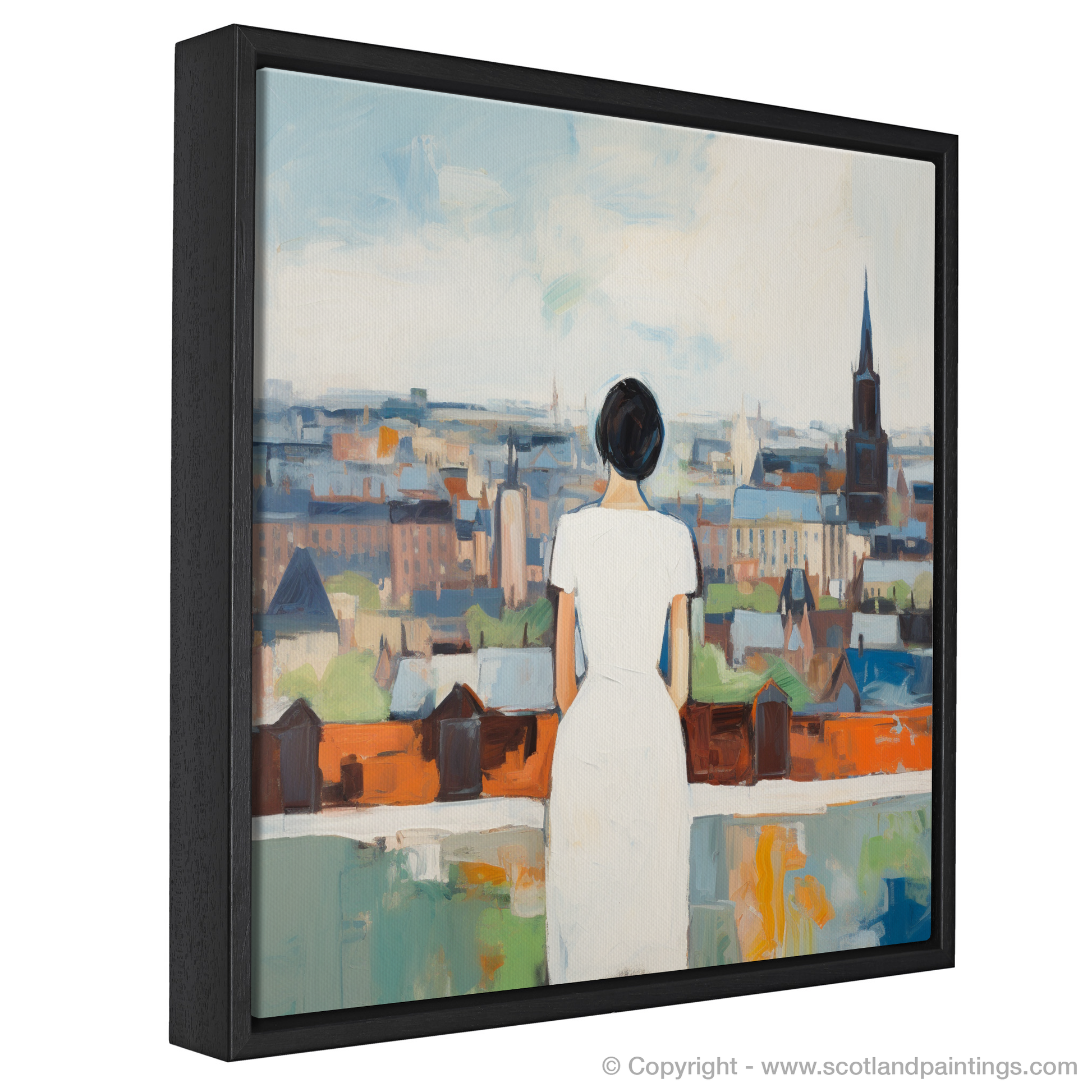 Through a flurry of bold strokes and a mosaic of vivid colours, the bustling life of Glasgow streets is suggested rather than explicitly detailed, allowing your imagination to wander through the city's vivacious heartbeat. Hues of azure, terracotta, and earthen tones blend with the dreamy blues of the Scottish sky, casting a harmonious palette that contrasts with the stark elegance of the woman's attire.