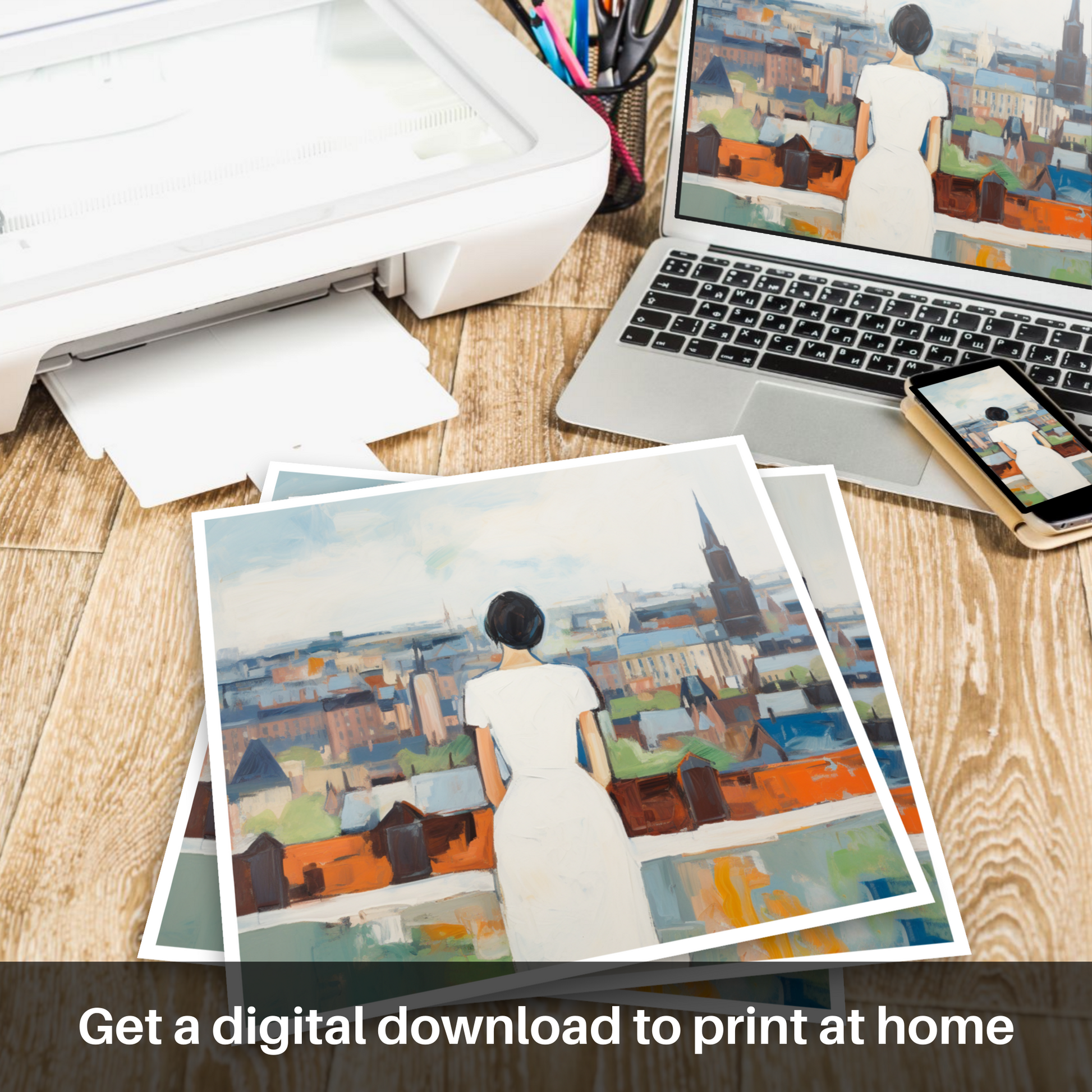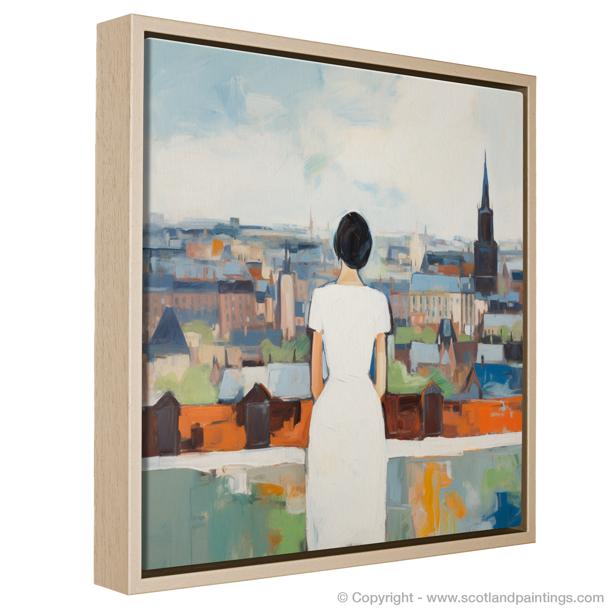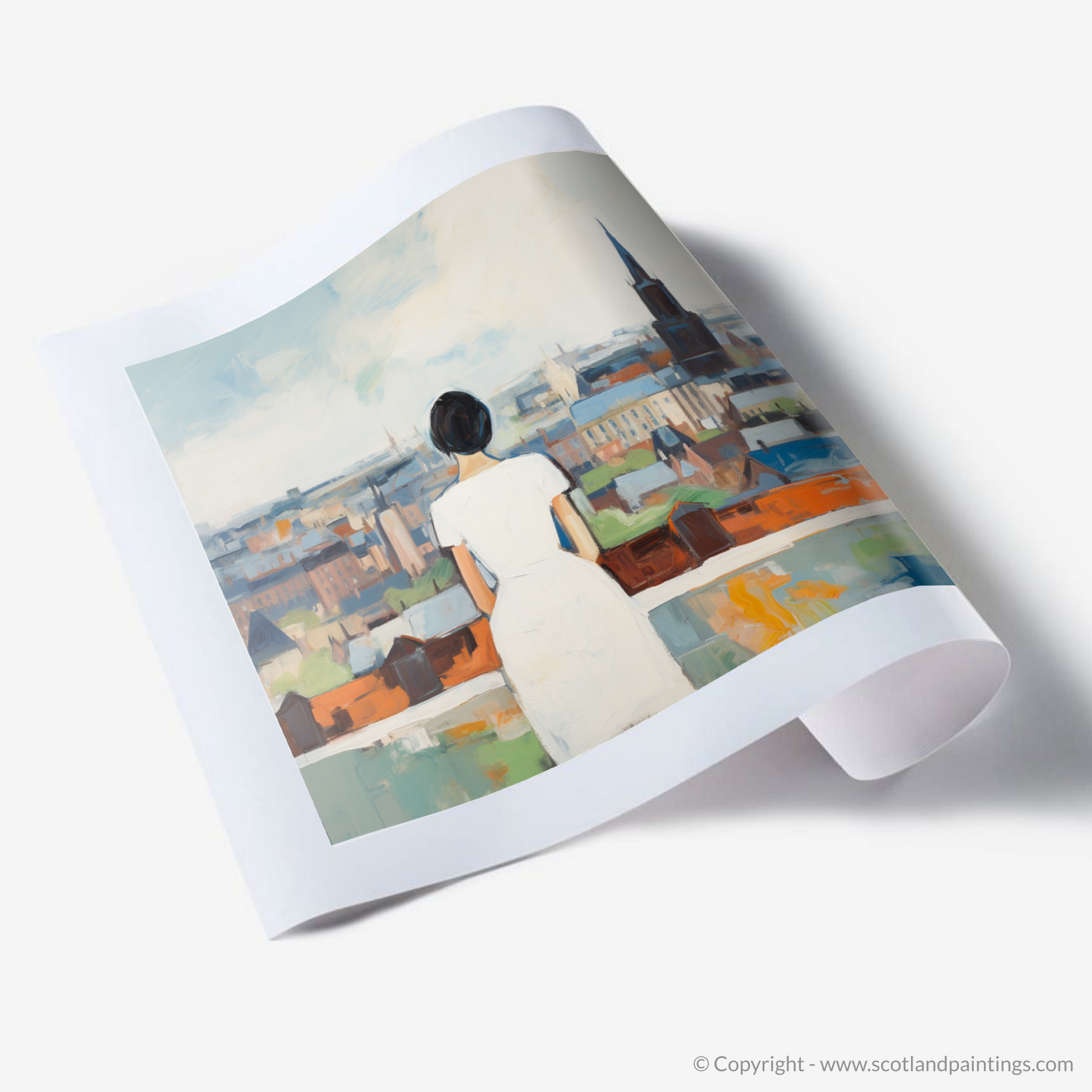 Immerse your surroundings with the enigmatic allure of our mesmerising print, where the simplicity of a white dress meets the complexity of urban vibrancy. Capturing the essence of contemplation, this piece invites viewers to step into the shoes of a solitary figure poised atop Glasgow’s historic Necropolis. With her back to us, she stands tranquil and pensive, her white dress a symbol of serenity against the colourful abstract tapestry that unfolds before her.