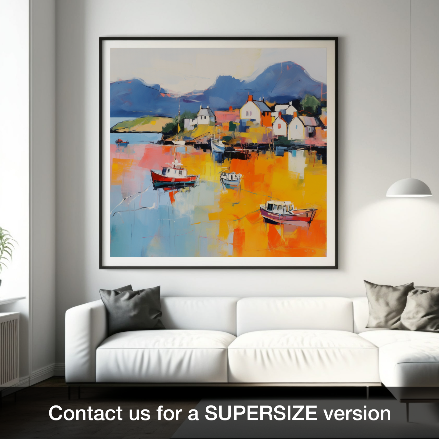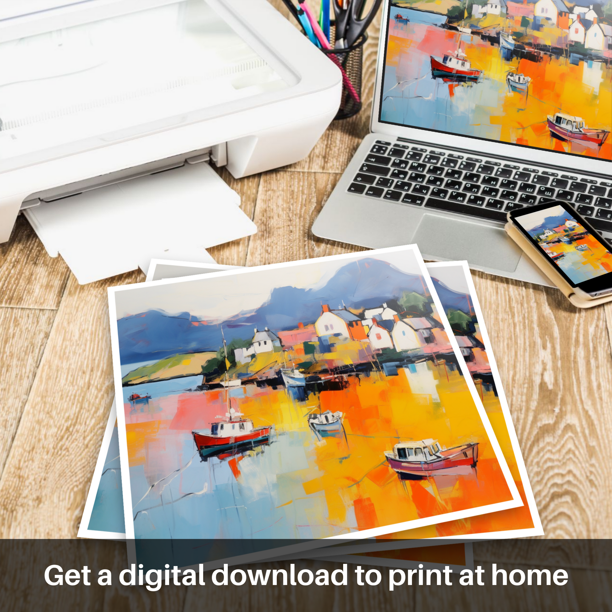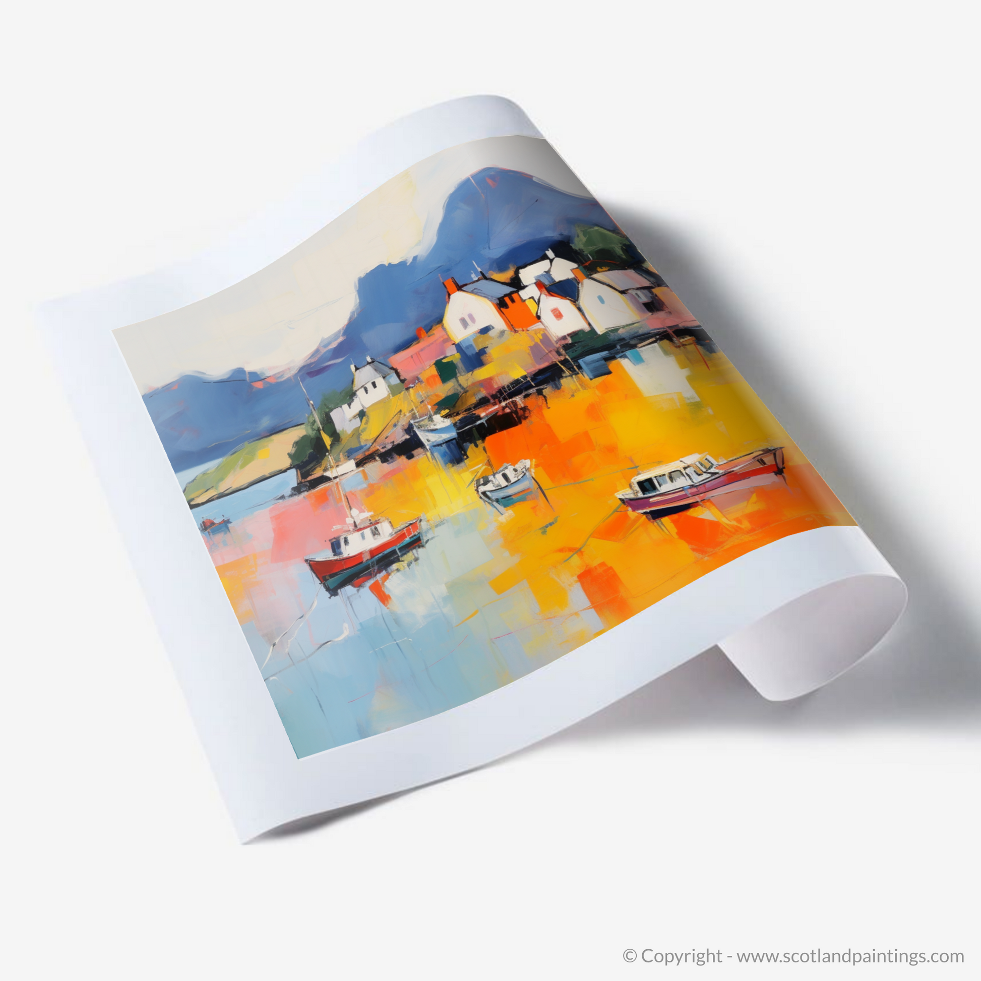Immerse yourself in the vibrant allure of the Highlands with this captivating abstract impression of Plockton Harbour. The artwork boasts a mesmerising palette, where the warm hues of orange and red meld seamlessly with touches of blue, capturing the dynamic amalgamation of light as it dances across the harbour's waters and the Scottish sky. Boats, relaxed in their gentle sway, are rendered with a simplicity that prioritizes form and colour, while the reflections on the water's surface are abstracted into a symphony of fractured shapes.