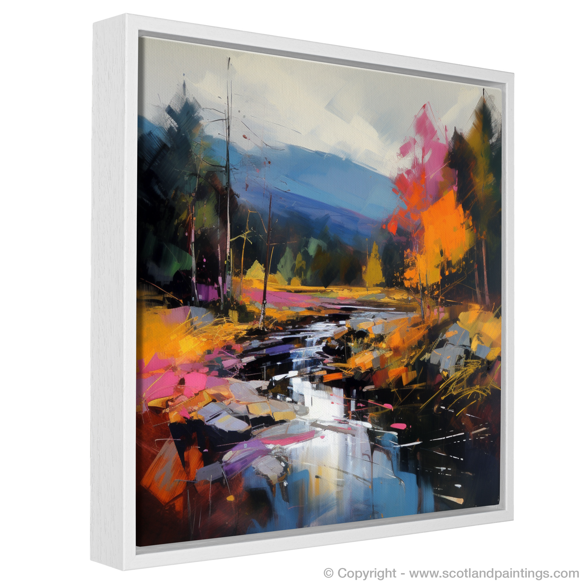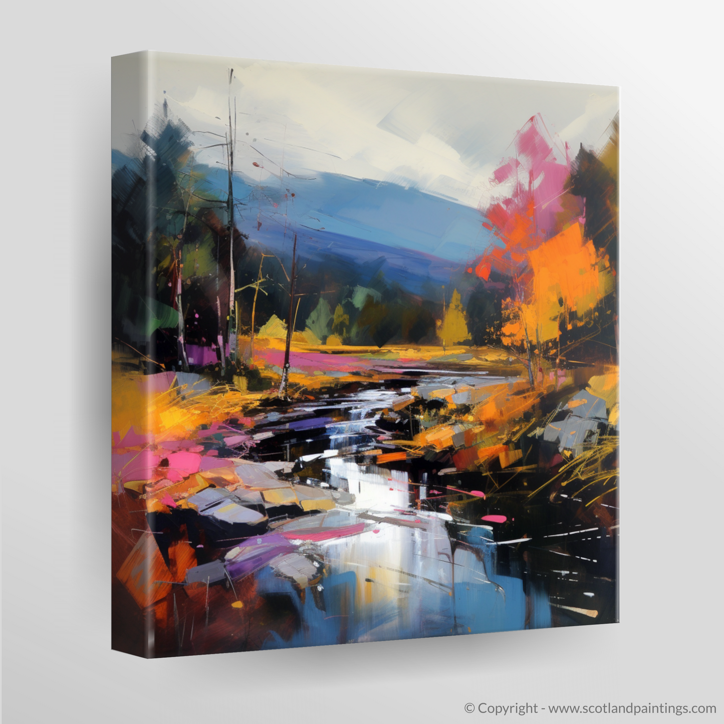 A mosaic of bold strokes unfolds before you, where fiery oranges and electric pinks set aglow the canvas, resembling the foliage in a state of autumnal flamboyance. Cool shades of azure and indigo marry with gentle whites in a reflective dance upon the water's surface, creating the illusion of a serene loch nestled quietly within the wild terrain.