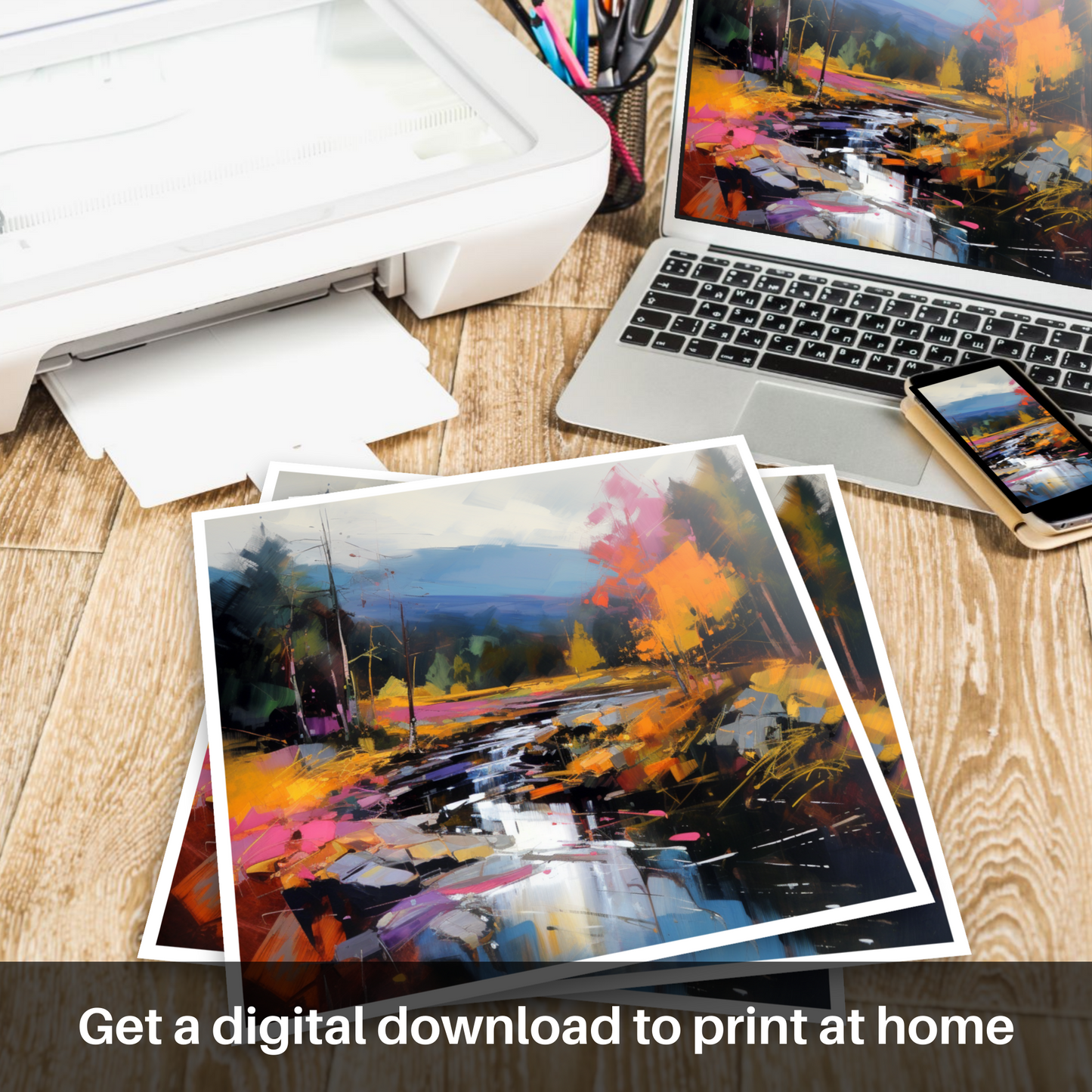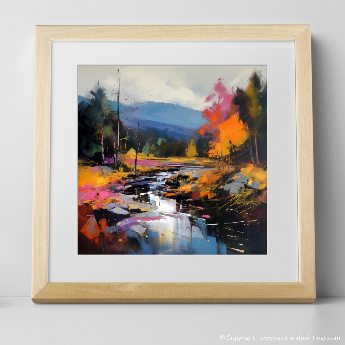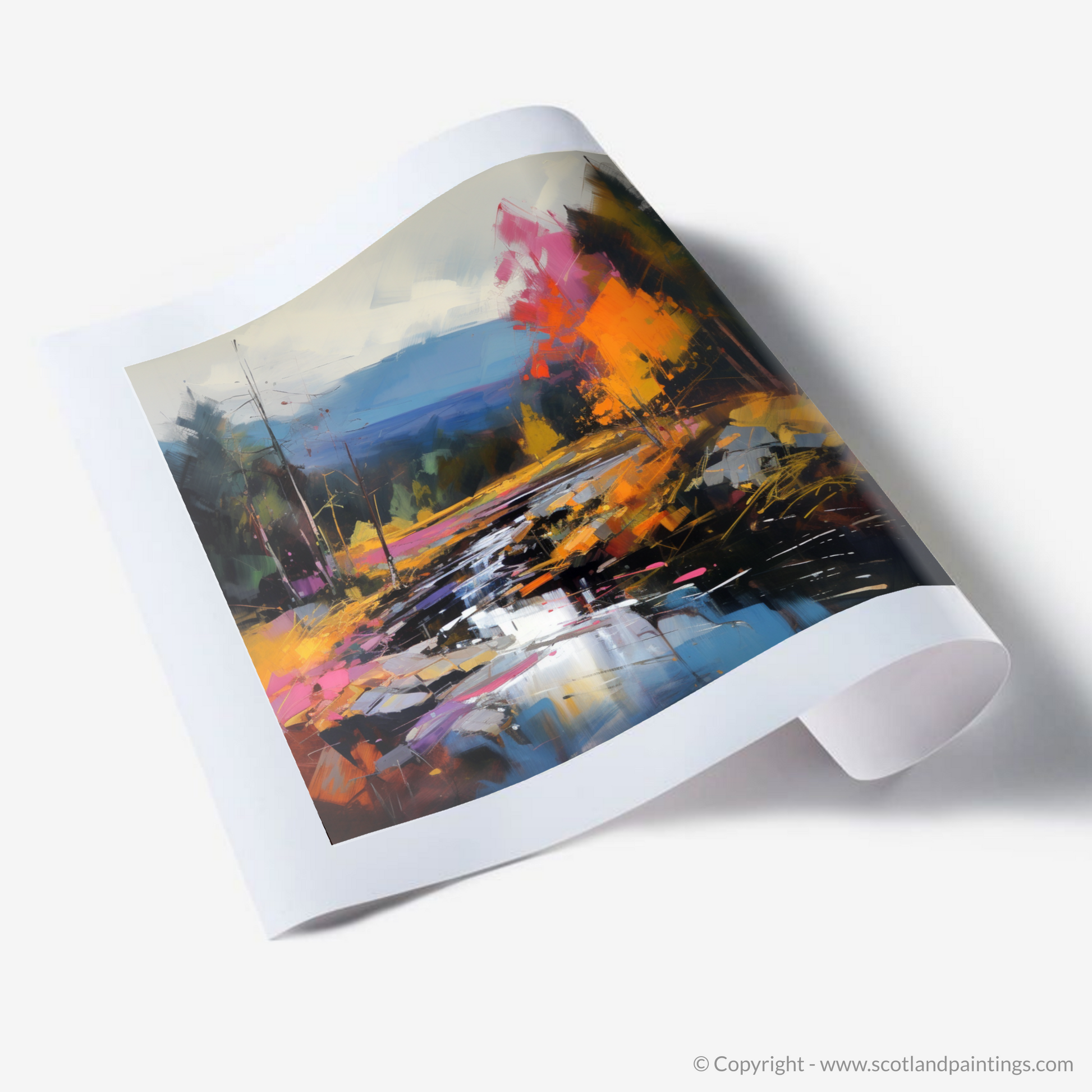 The print resonates with the energy of the natural landscape, while the distinct expressionist style allows for a deeply personal interpretation of the rugged Scottish Highlands. The forest scene encapsulated here is not merely one of silent greens and browns, but a symphony of colour that echoes the palpable life force of the wilds.