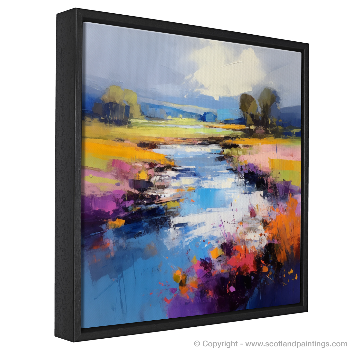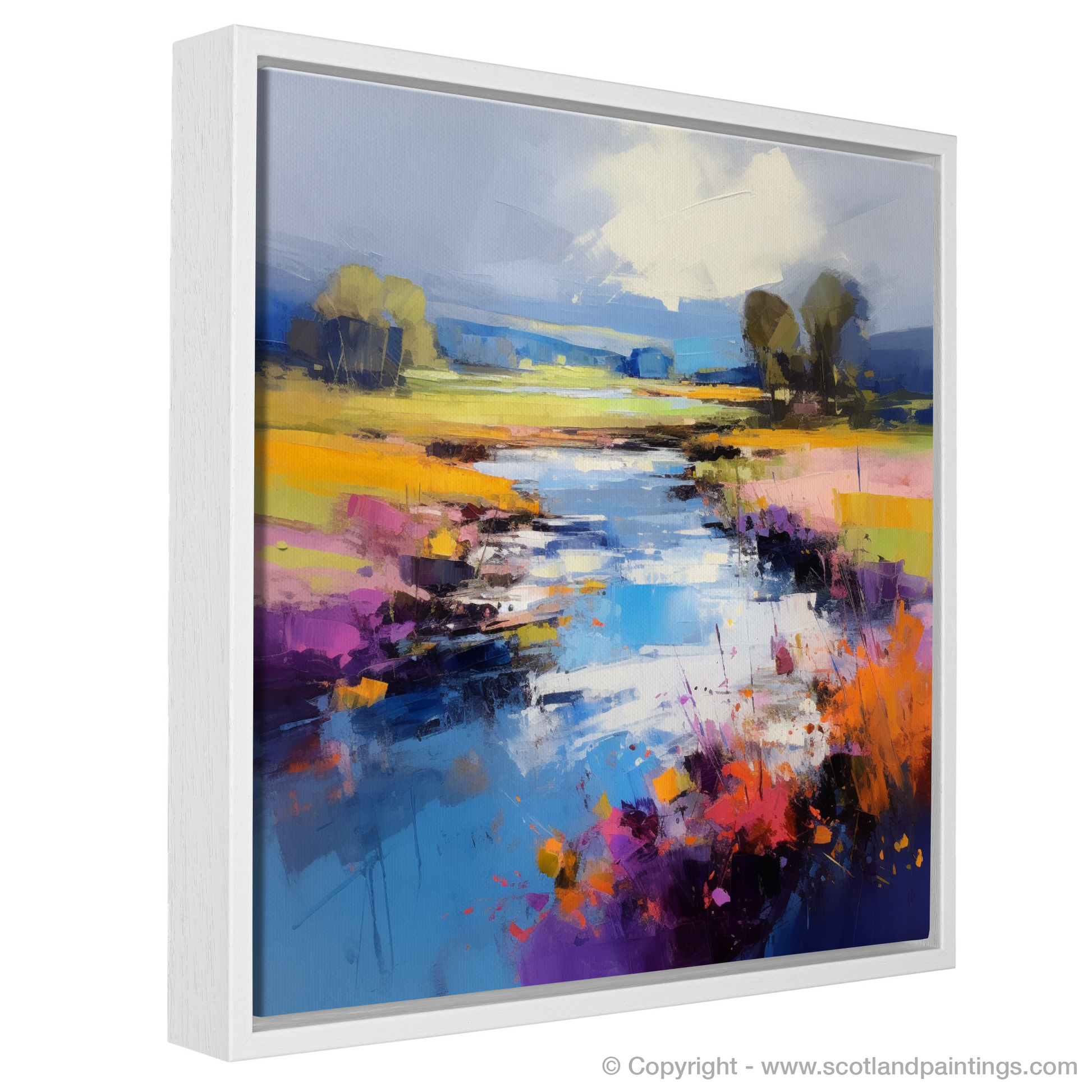 Flanking the river's mirror-like presence, the banks are awash with vibrant yellows, suggesting fields of wildflowers or perhaps the golden rays of a low-hanging sun. Dashes of intense pink and purple adorn the foreground, evoking wild heather or the blossoms that speckle the Scottish countryside, adding depth and a hint of mystery to the scene.