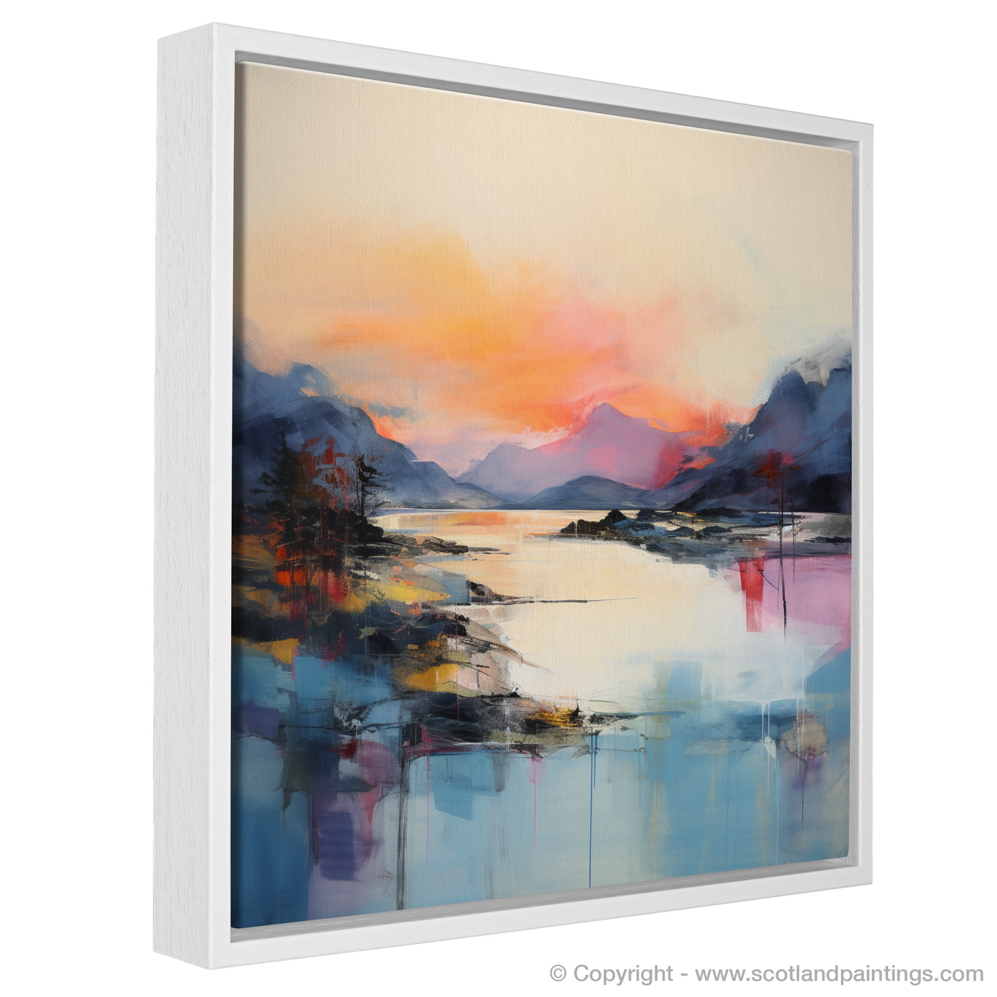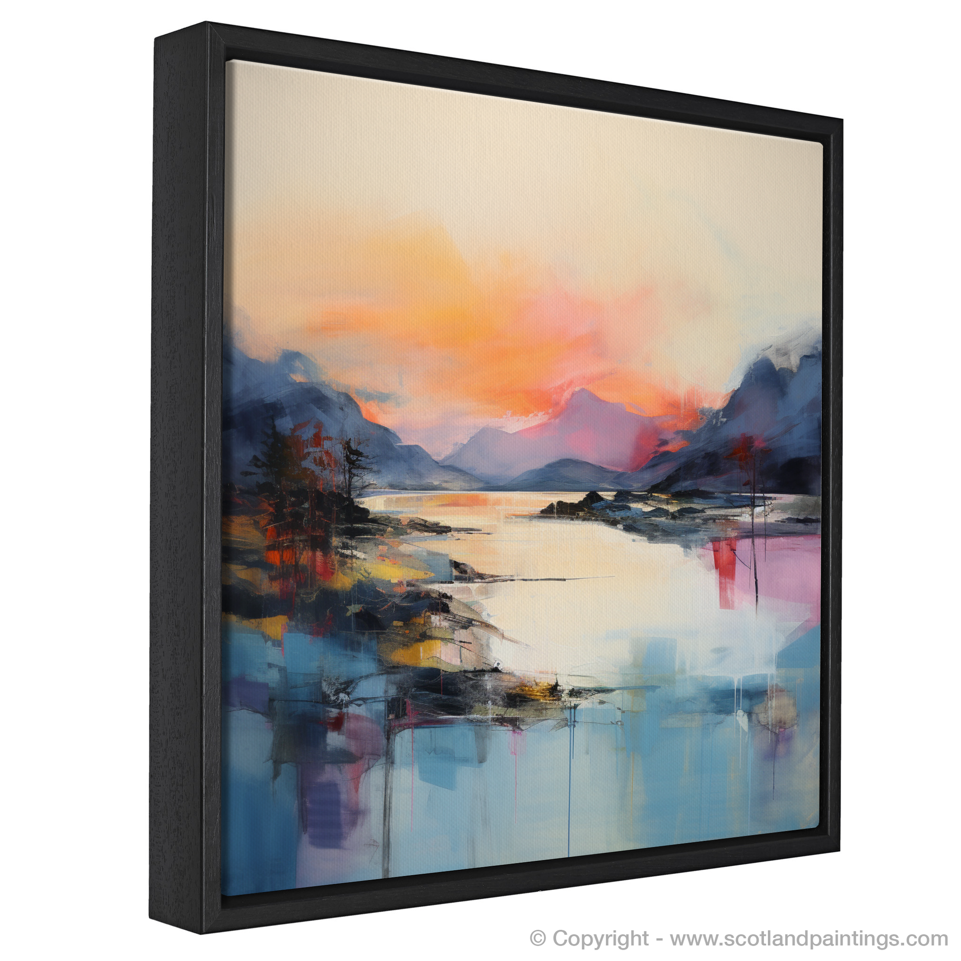 Immerse your senses in an evocative journey to Shieldaig Bay with this mesmerizing abstract interpretation. A symphony of vibrant hues captures the sheer spectacle of dusk, as the sky above the bay transitions into a palette of fiery oranges, warm pinks, and tranquil blues. These rich, expressive strokes convey the dynamic nature of the setting sun, mirrored by a serene, yet equally complex waterscape below.