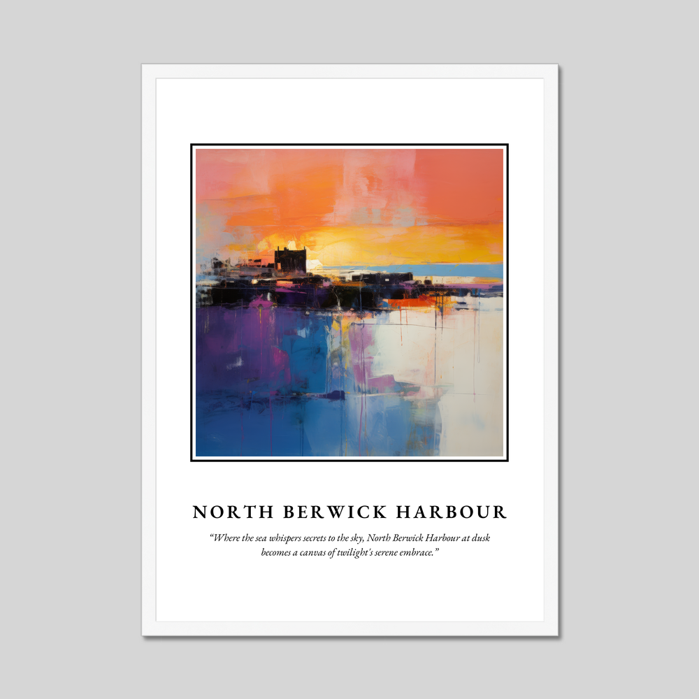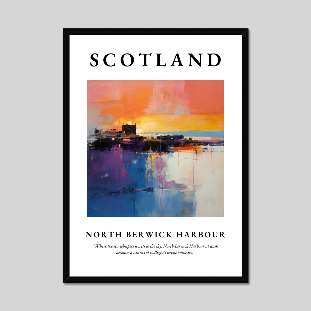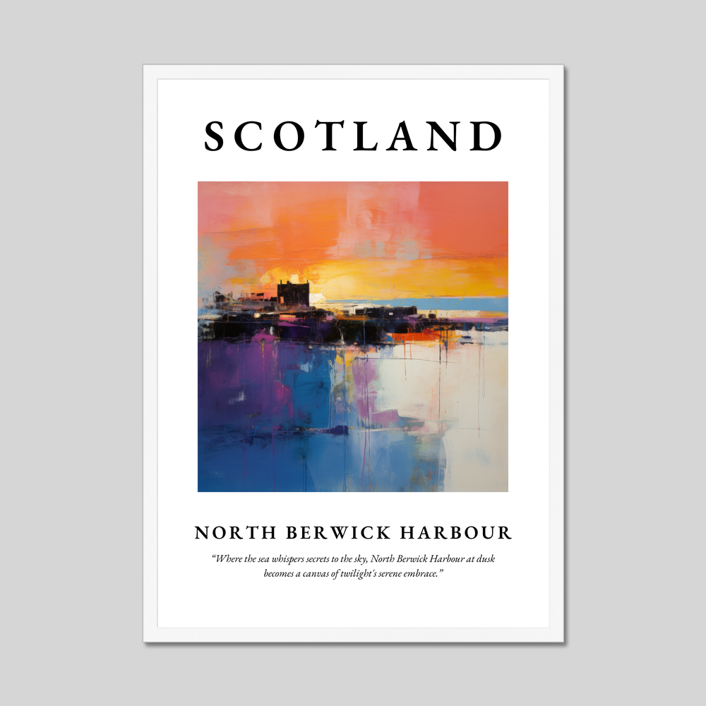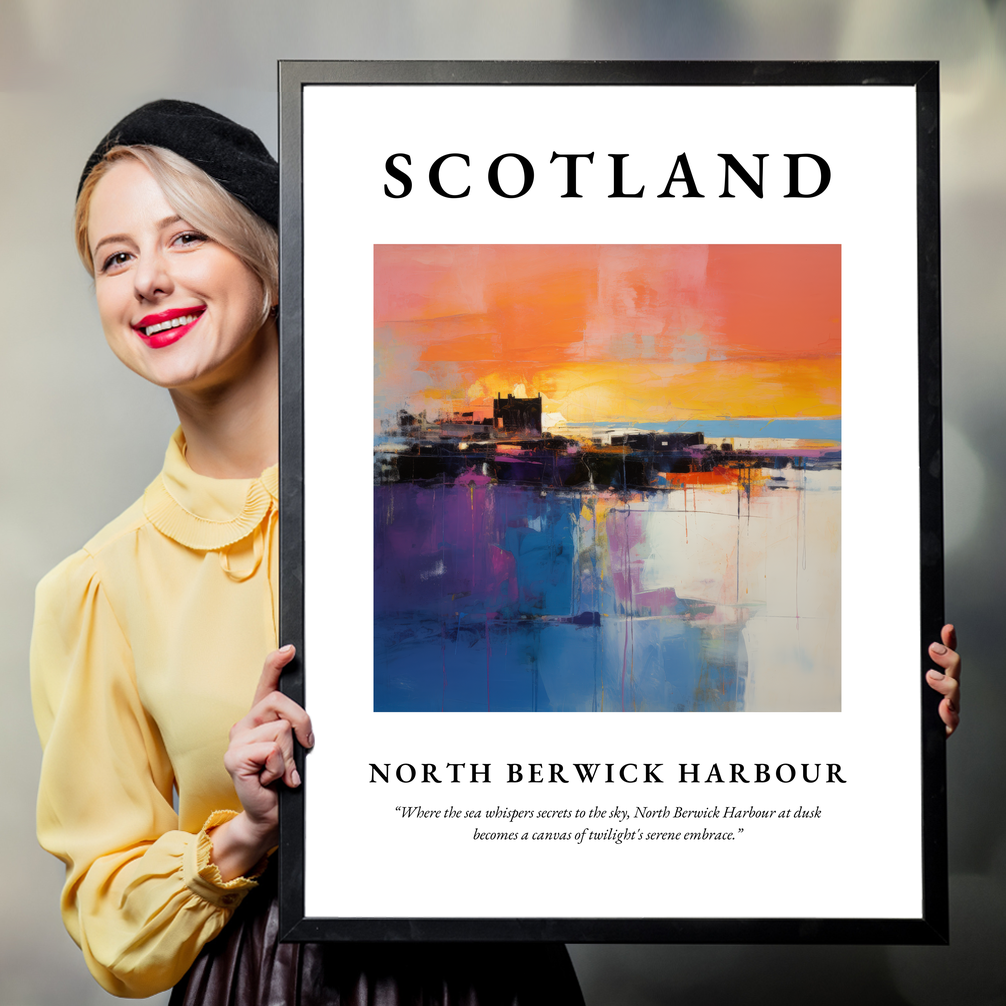 The poster opens with “SCOTLAND” boldly emblazoned at the top, setting the stage for the vivid artwork that lies beneath. The abstract style beautifully translates the twilight hues into vibrant brushstrokes, reflecting the mysterious dance of colours as day meets night. Below the painting, the heartfelt quote reads, “Where the sea whispers secrets to the sky, North Berwick Harbour at dusk becomes a canvas of twilight's serene embrace,” deepening your connection to this tranquil moment.