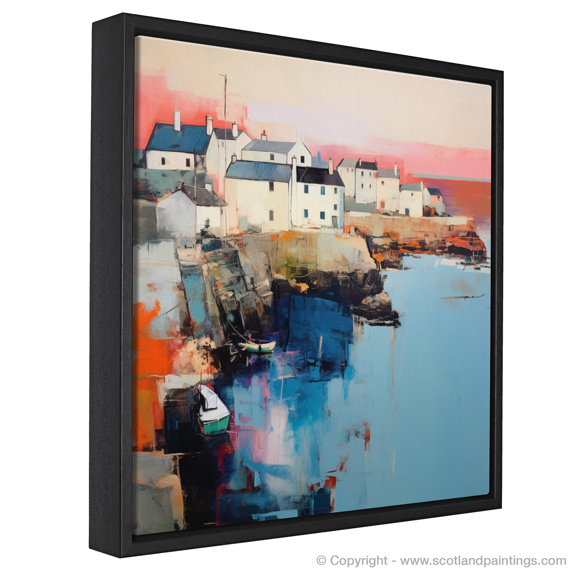 Capturing the serene essence of Scottish coastal life, this evocative print presents Portsoy Harbour bathed in the soft glow of dusk. Abstract in style, the artwork whispers tales of the sea through its fluid representation of reality, offering a dreamlike vista of one of Scotland's charming harbours.