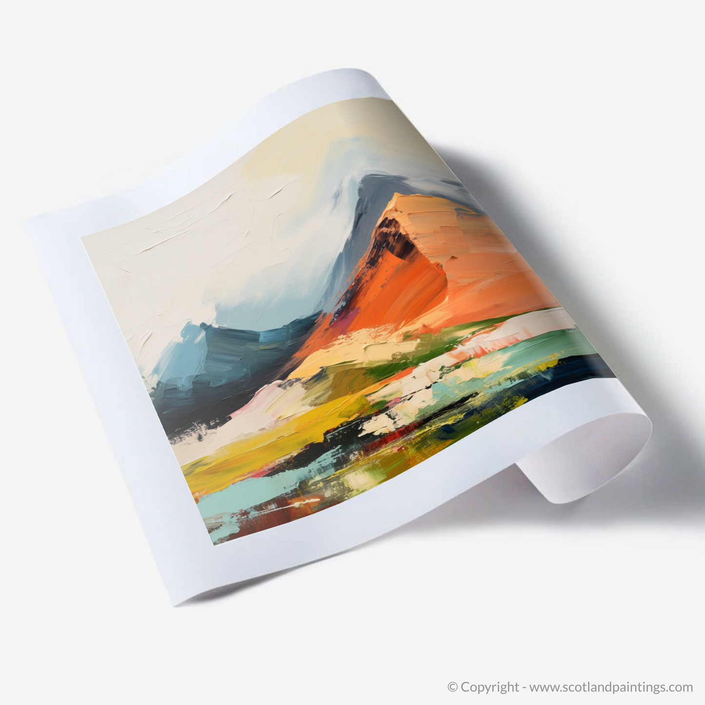 Escape into the wild heart of Scotland with a print that channels the untamed beauty of Liathach, located in Wester Ross. This abstract interpretation captures the essence of the soaring peaks and rugged landscape in a symphony of vibrant, visceral brushstrokes. The artwork is a feast of colour and motion, where earthen tones of sienna and umber blend with splashes of bright ochre, setting the heather ablaze beneath a dynamic sky.