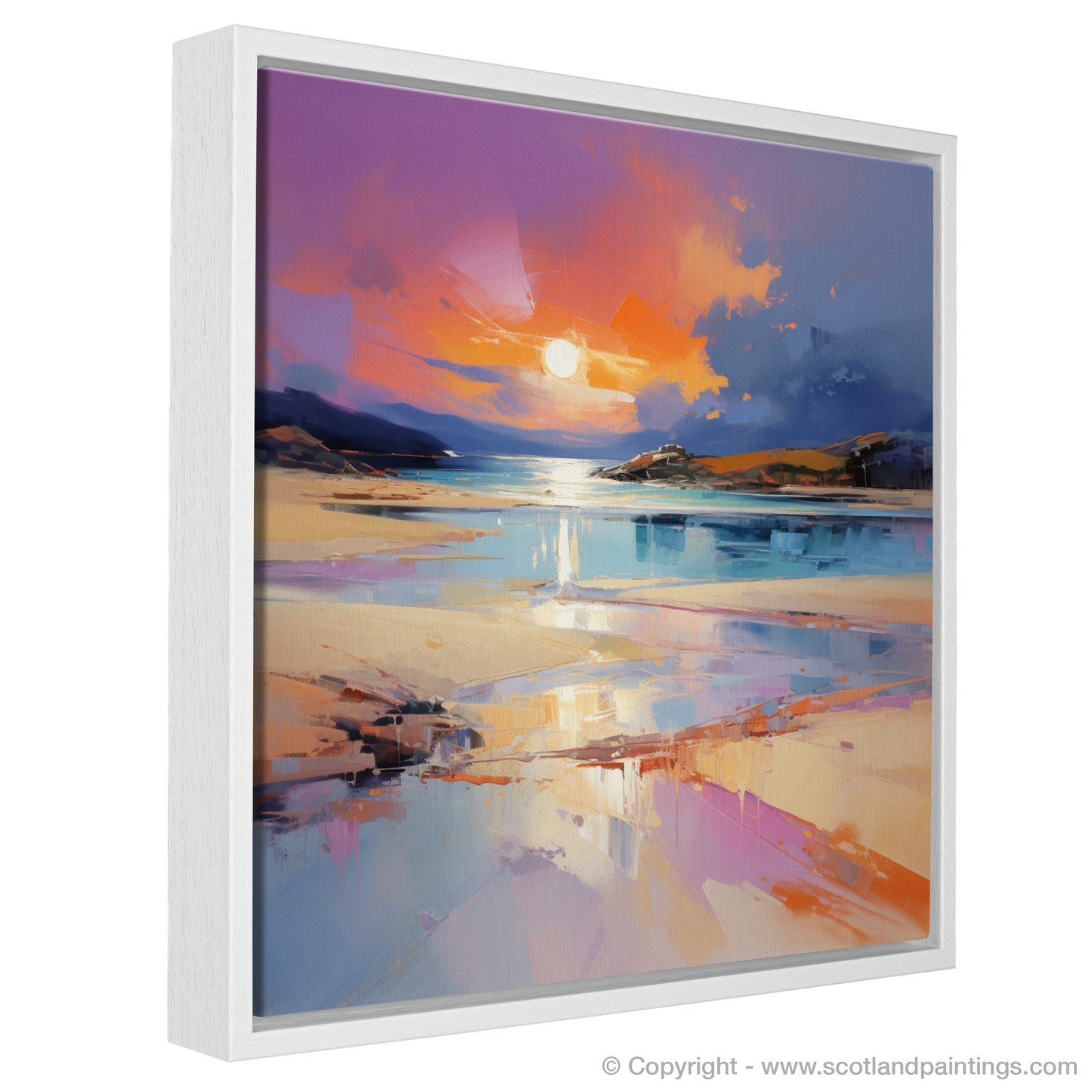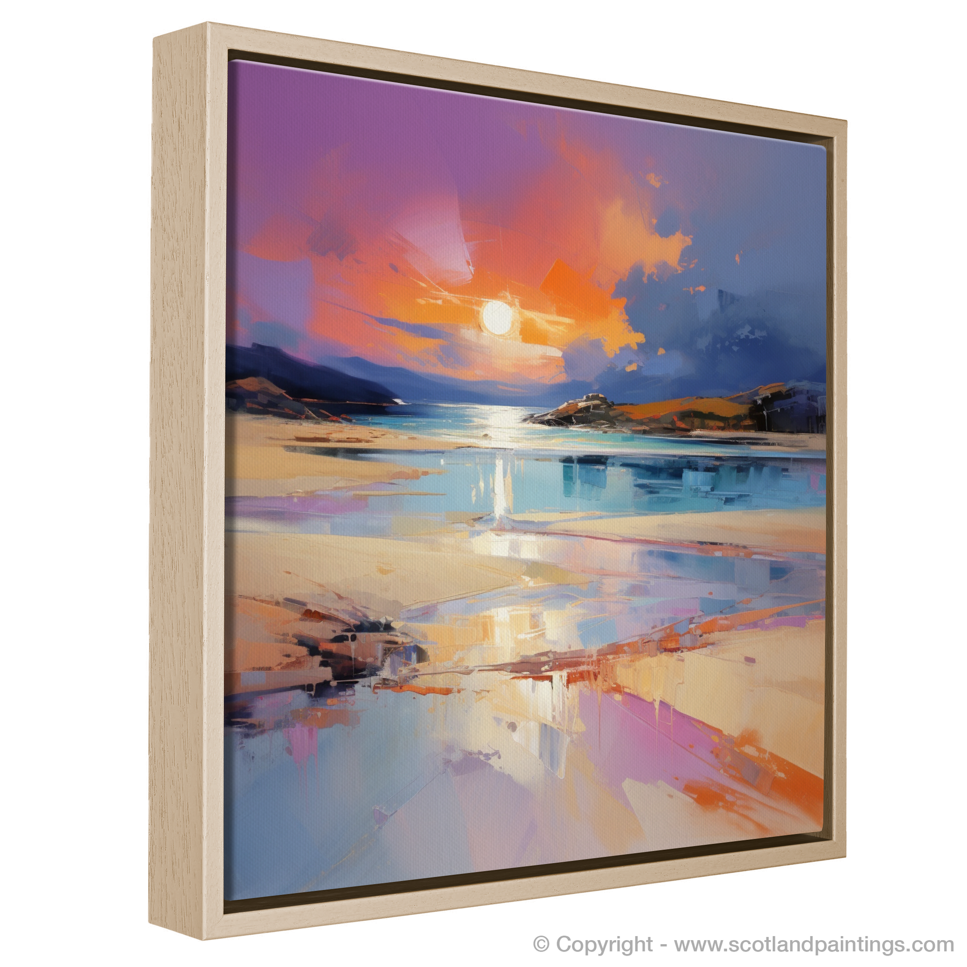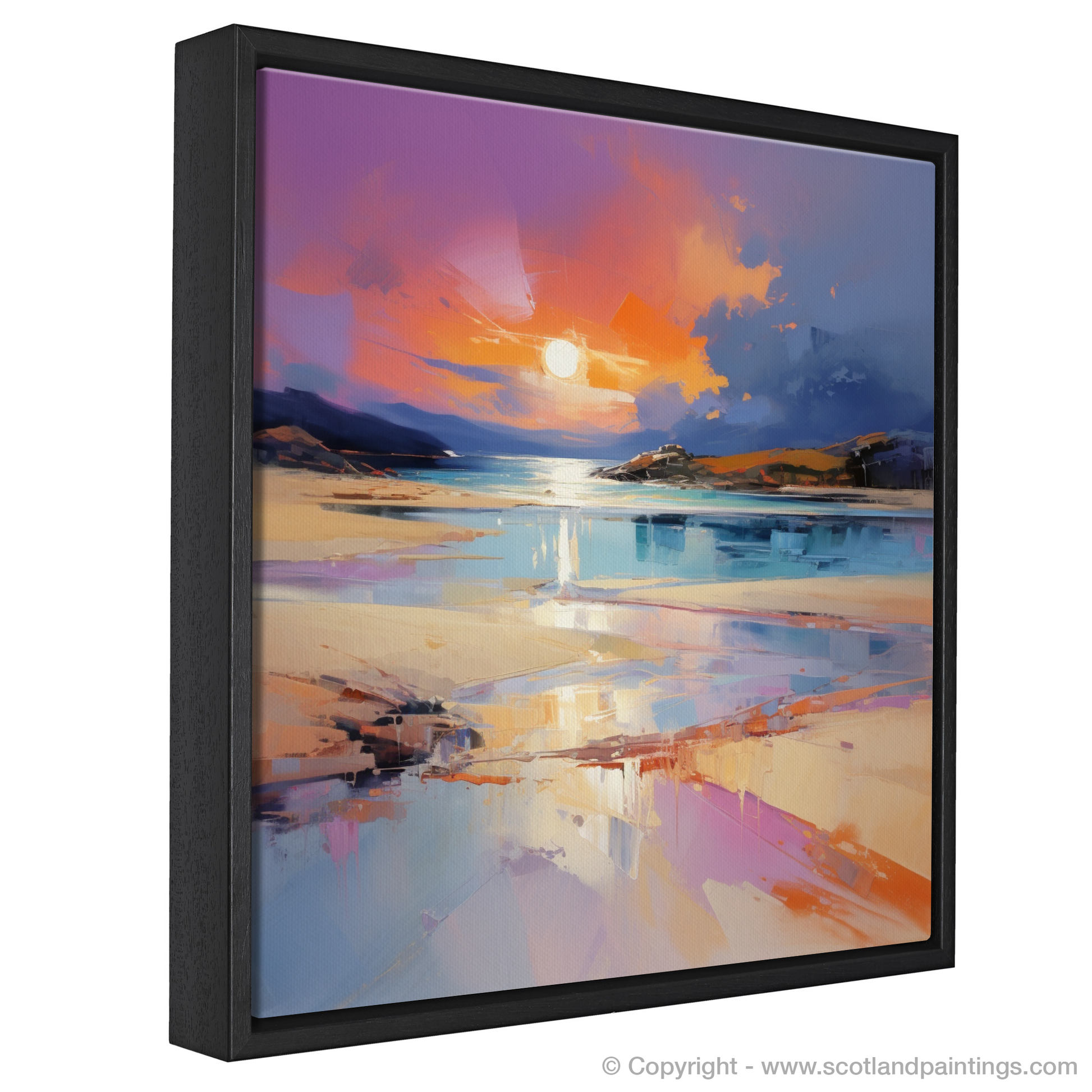 Immerse yourself in the luminescent brilliance of Scotland's natural splendour with this captivating expressionist portrayal of Achmelvich Beach during the enchanting moments of golden hour. As the day's last light dances across the undulating waves, this piece captures the swirling, vibrant hues of sunset that intermingle with the tranquil blues of the sea, reflecting off the wet sands in a symphony of colours.