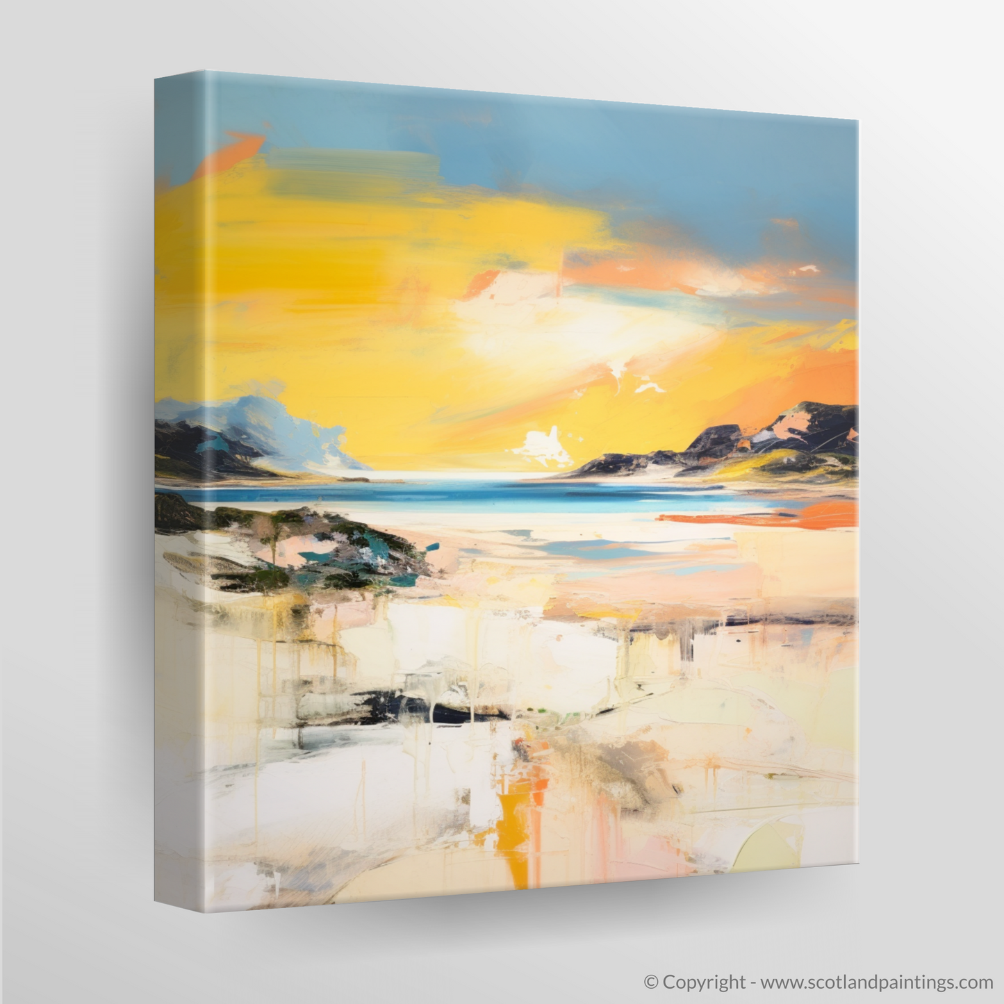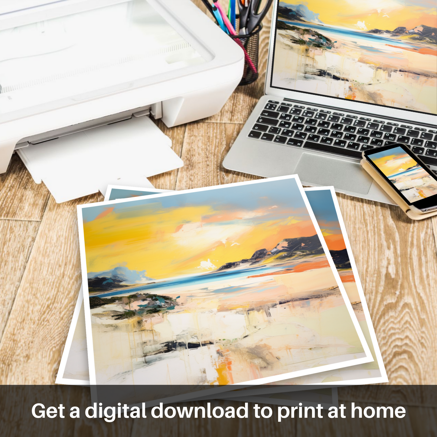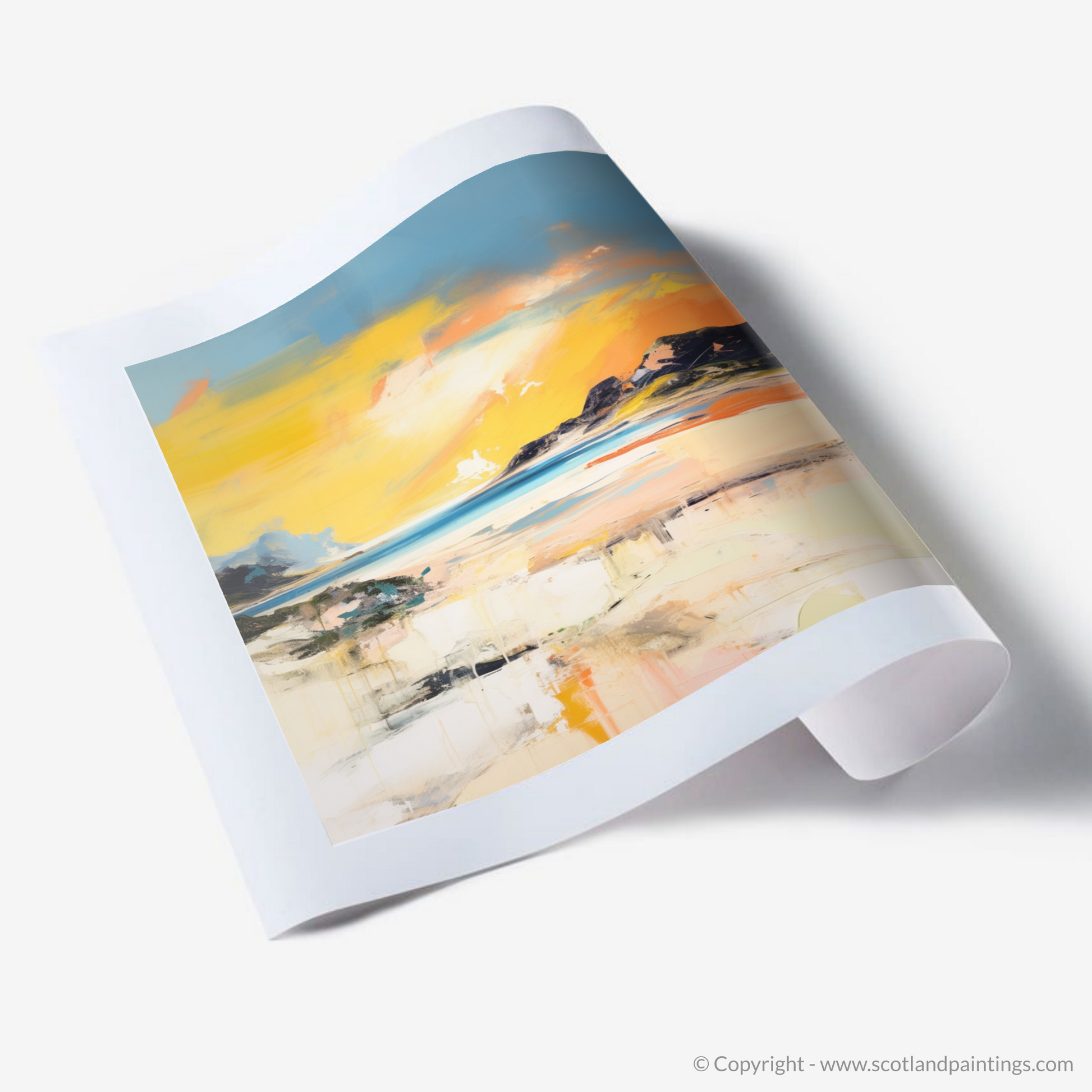 Bathe your space in the resplendent glow of a Scottish sunset with this captivating abstract representation of Camusdarach Beach. This mesmerising print captures the essence of golden hour, that fleeting time when the sun kisses the horizon and scatters a spectrum of warm hues across the sky and sea.