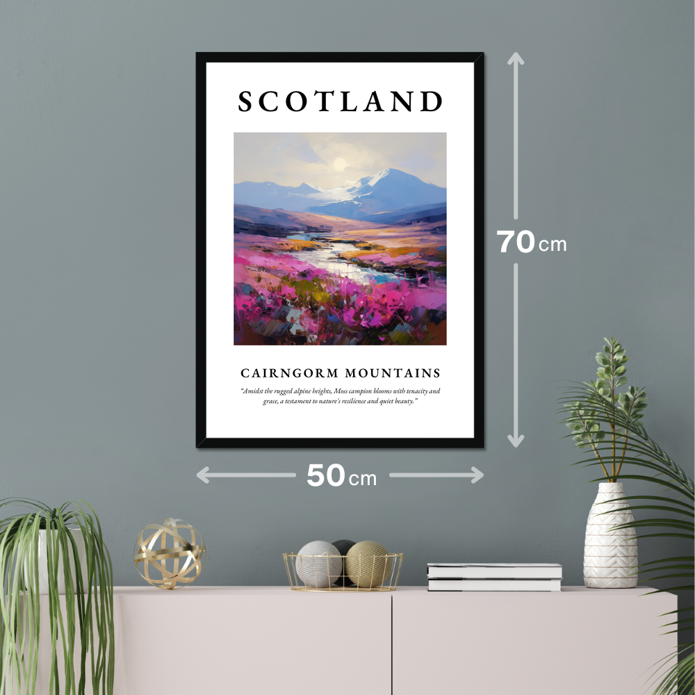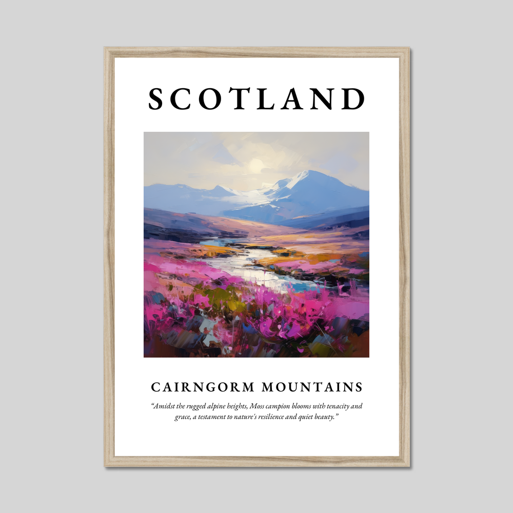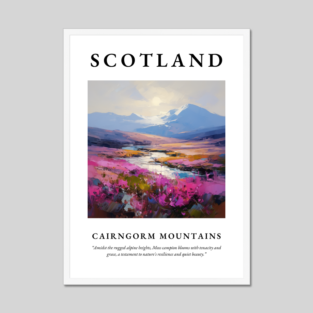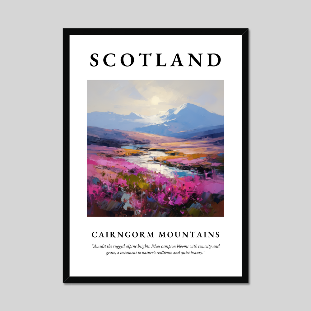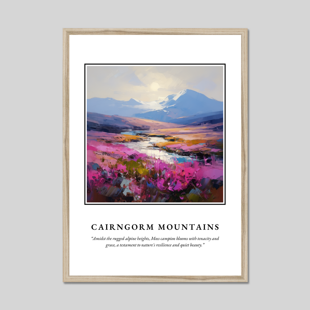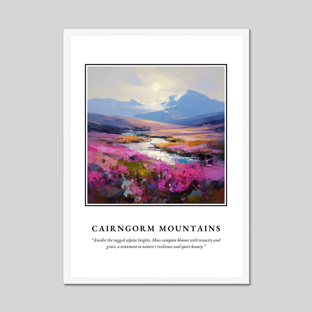 Choose from a sophisticated black, clean white, or a natural wood-effect frame to perfectly complement your decor. The painting of the Cairngorm Mountains exudes a sense of dynamic movement and energy, with vibrant strokes that evoke the serene yet powerful essence of this Highland sanctuary. Below, the quote “Amidst the rugged alpine heights, Moss campion blooms with tenacity and grace, a testament to nature's resilience and quiet beauty” resonates with those who appreciate the resilience and ethereal beauty of nature's wonders.