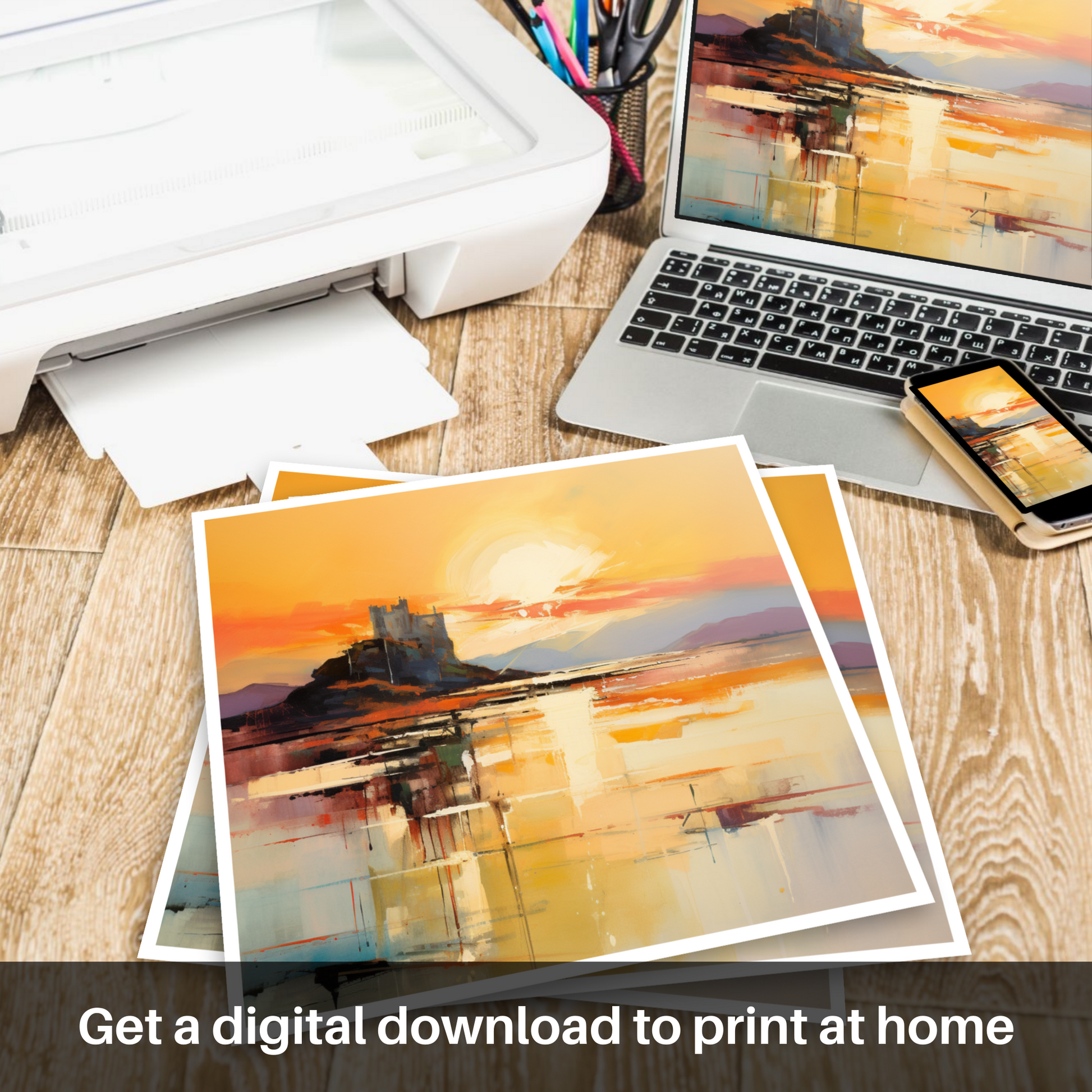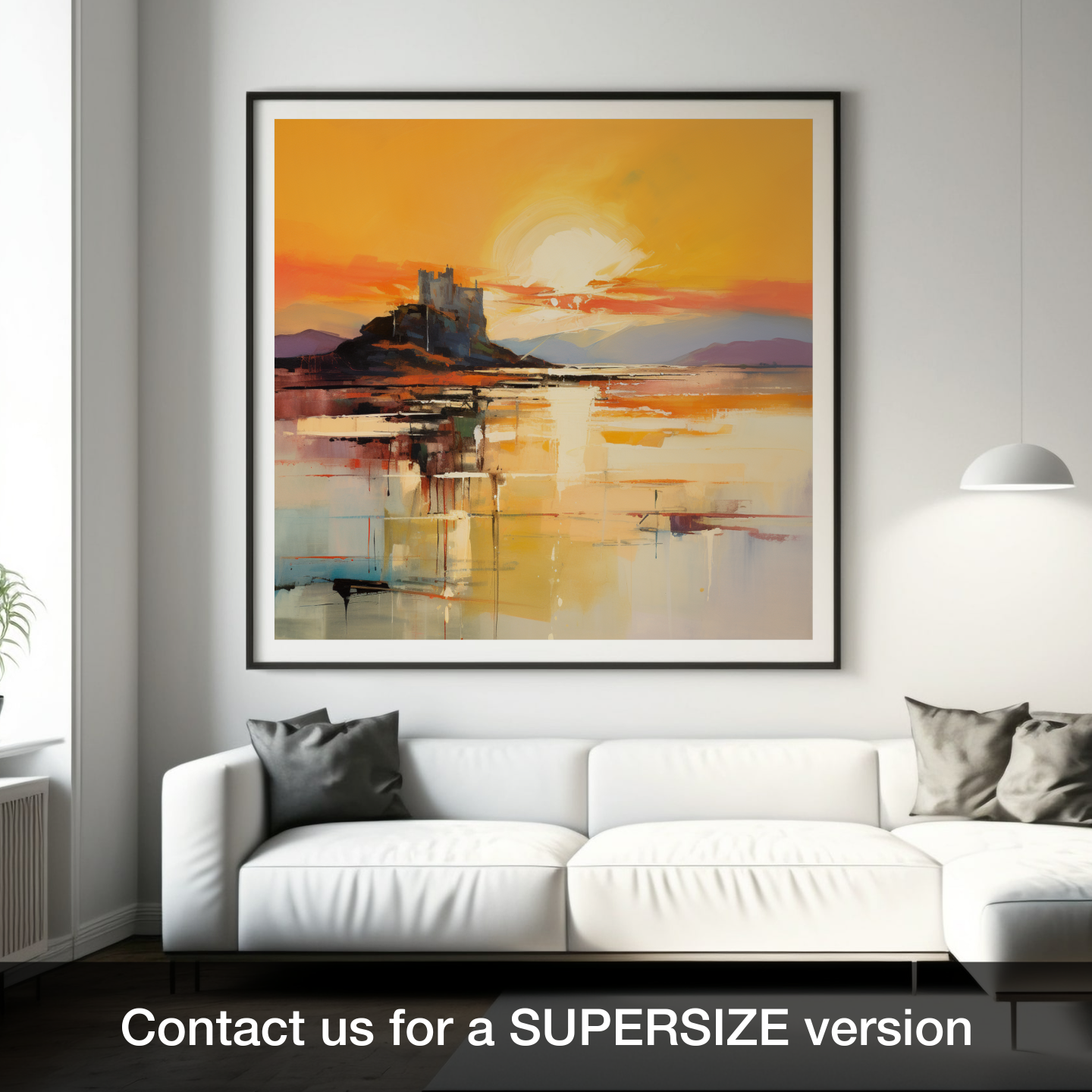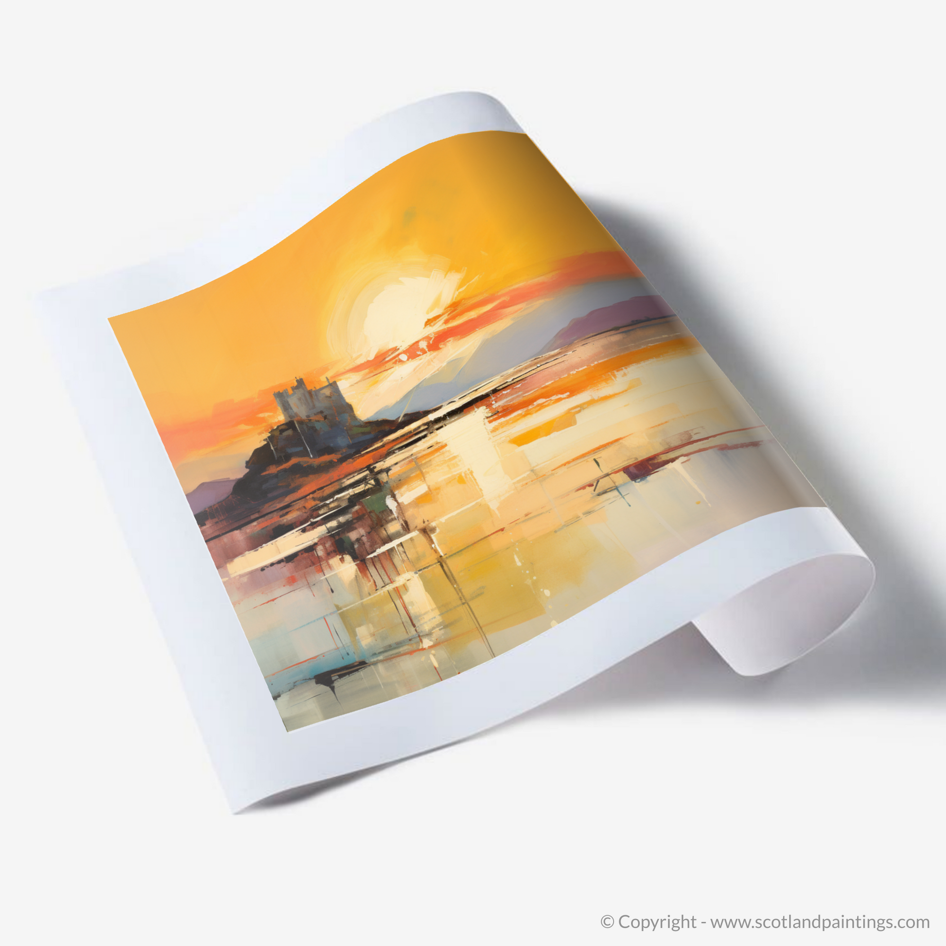 As the sun dips towards the horizon, casting its warm golden glow, our evocative print captures the essence of Castle Stalker Bay at the enchanting hour when day transitions to night. This abstract interpretation bathes the viewer in a symphony of fiery oranges, delicate peaches, and soothing creams, channeling the tranquility and awe-inspiring nature of Scotland's coastal coves.