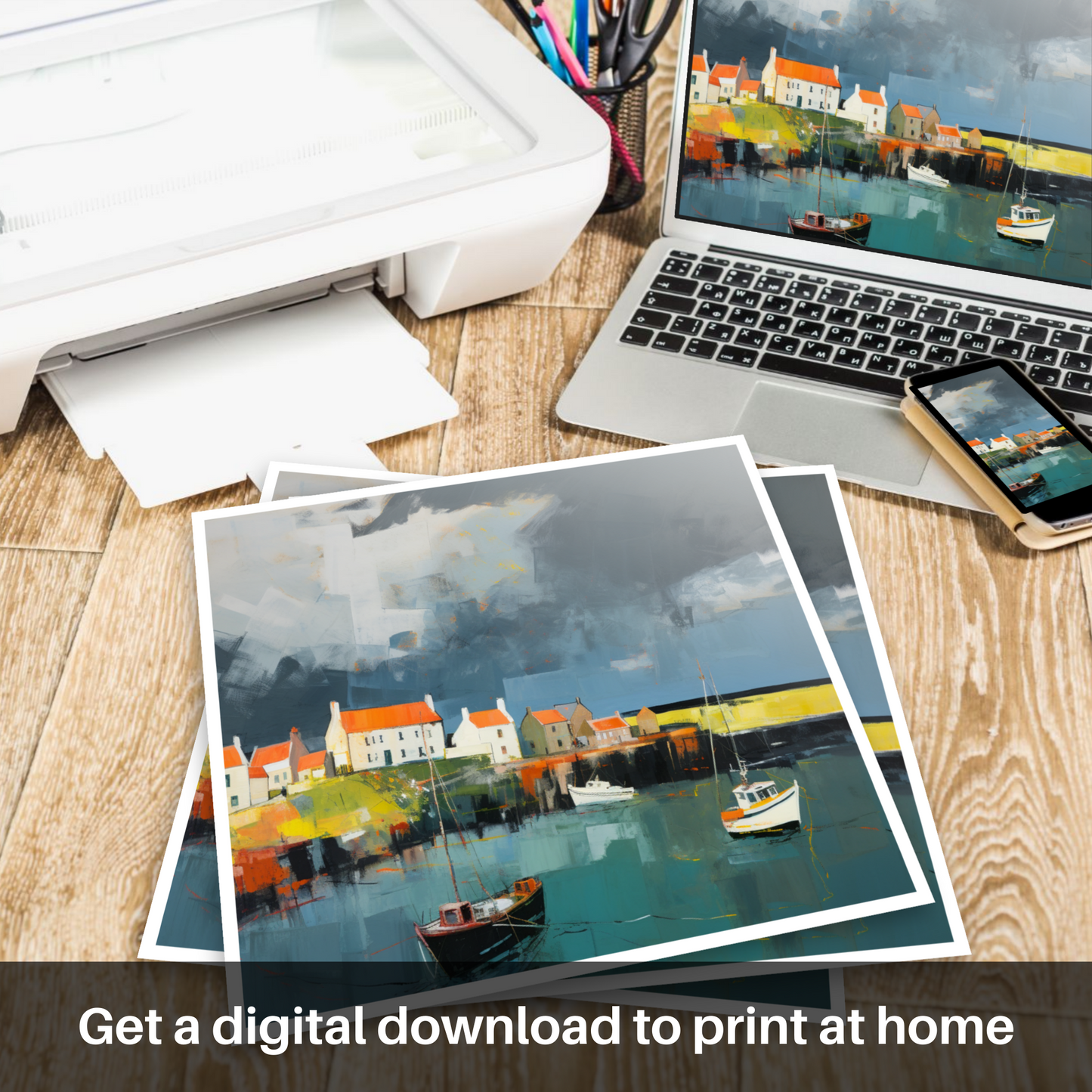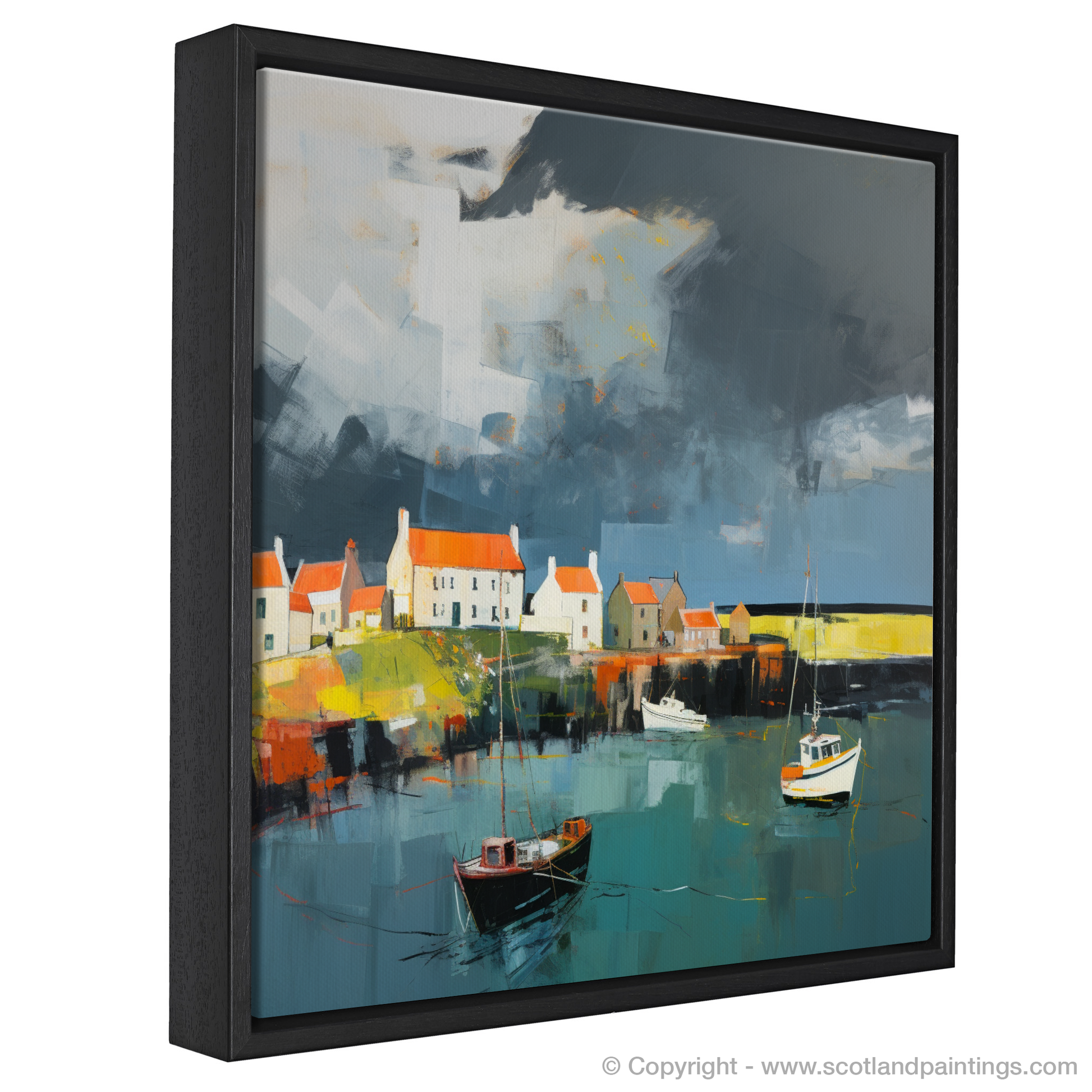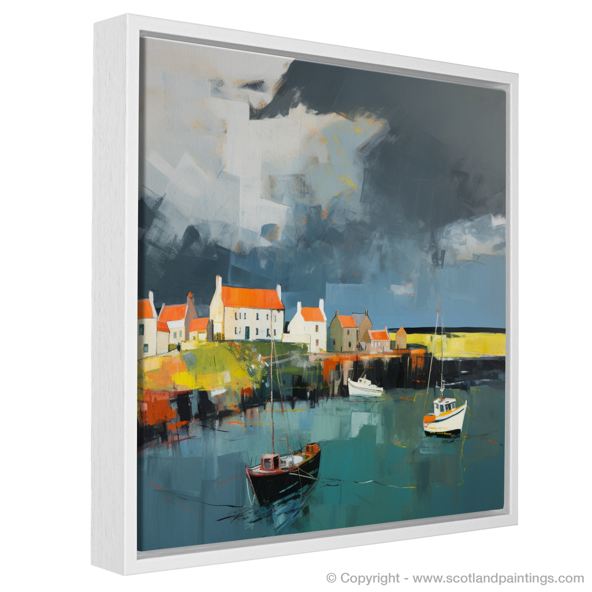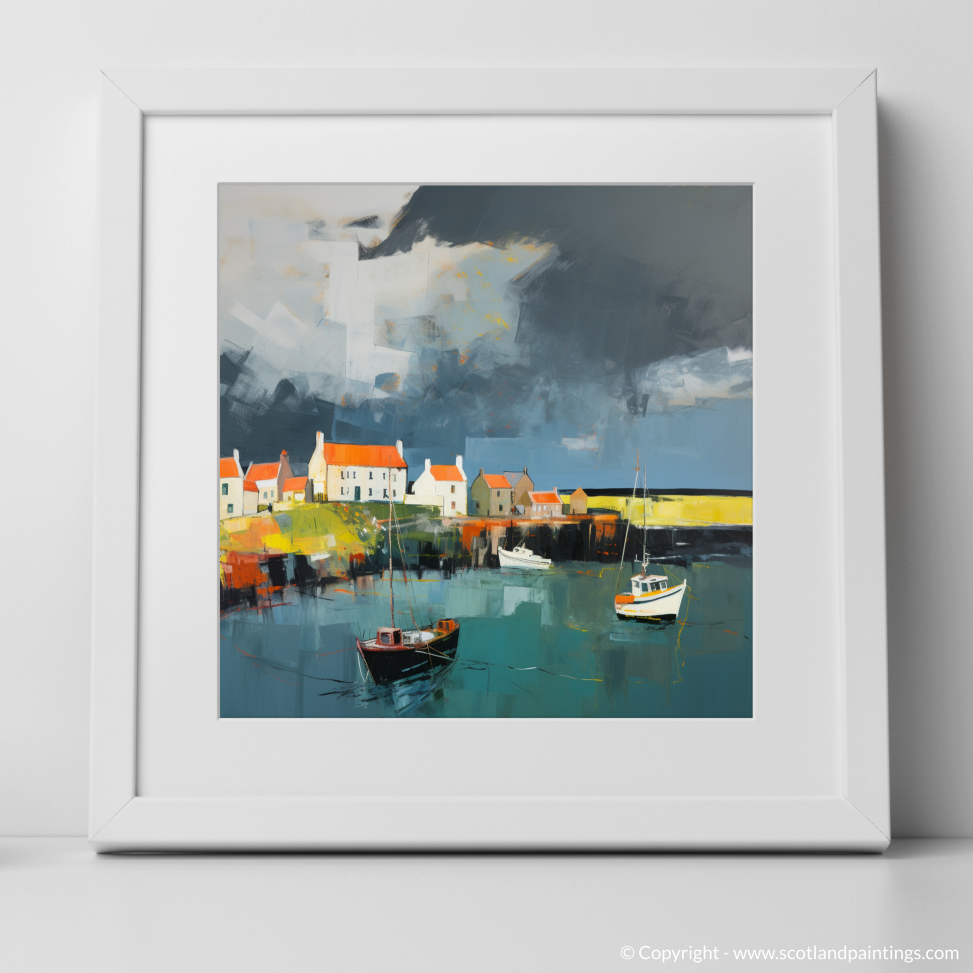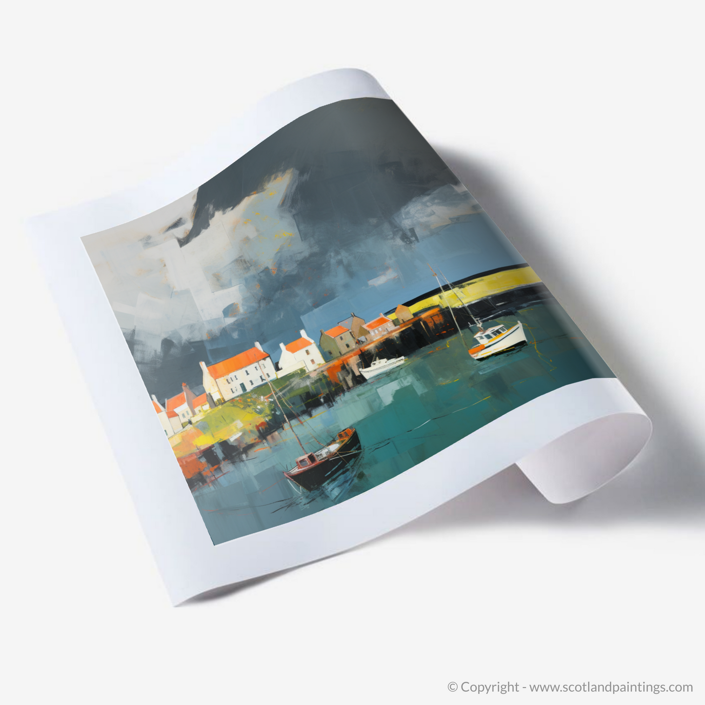 This print, an integral part of the 'Scottish Harbours' collection, offers not just a visual feast but an emotional journey. It is an abstract lens through which to view the storied Scottish coastline, a piece that does not simply depict a location but also conveys the very atmosphere that imbues it with indelible character. It is perfect for anyone who wishes to conjure the spellbinding allure of Scotland’s coastal enclaves within their own space.
