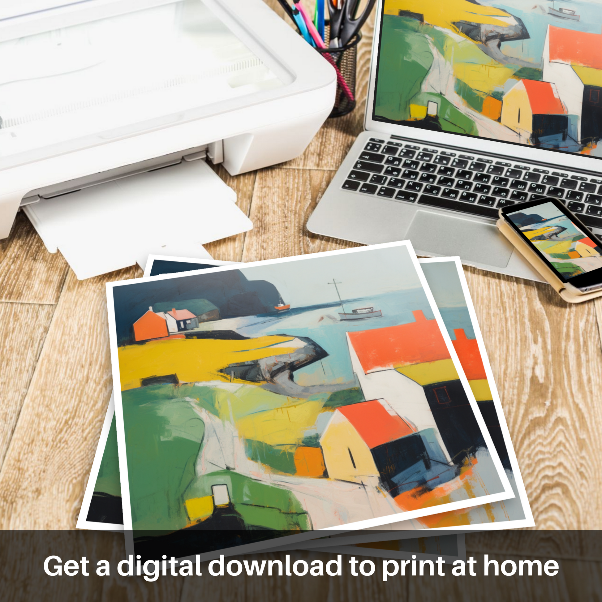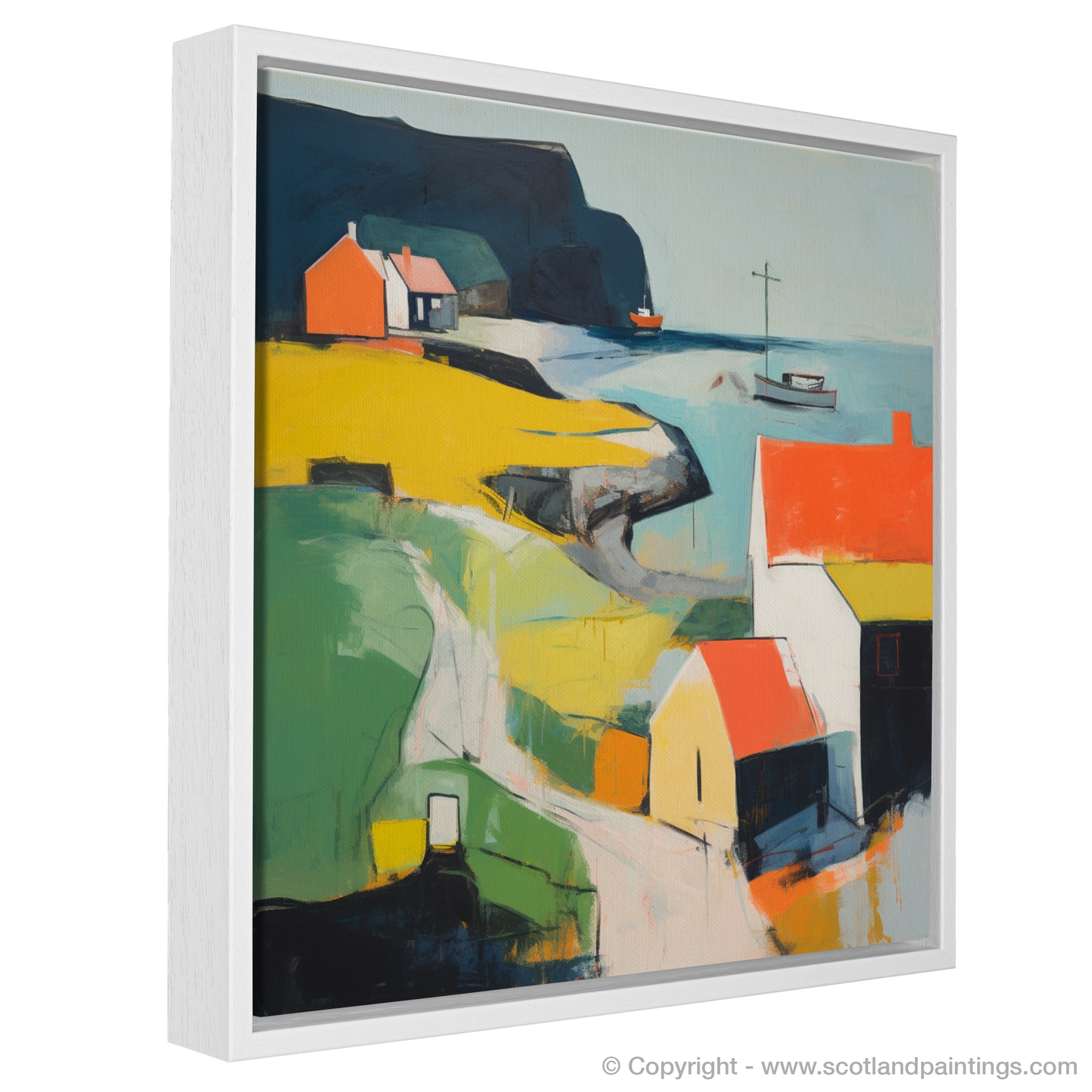 Central to the scene, charming harbour-side cottages painted in an array of reds and oranges evoke a sense of warmth and community, their simplified forms playing with the abstract theme. White accents break the dynamic composition, creating a powerful and harmonious balance.