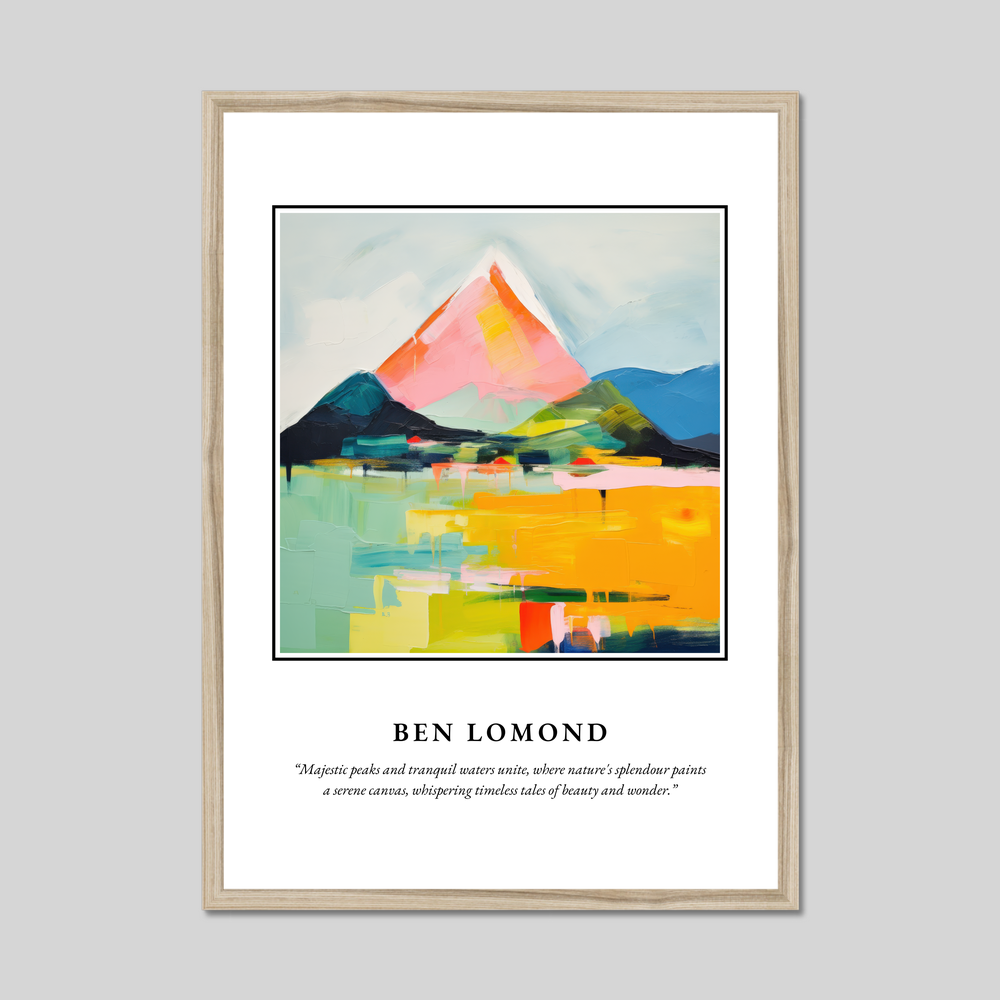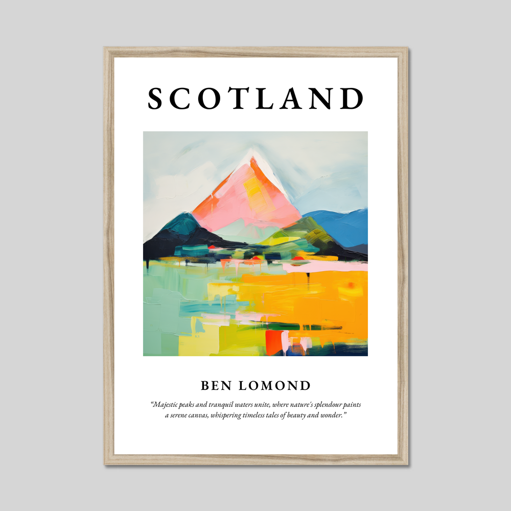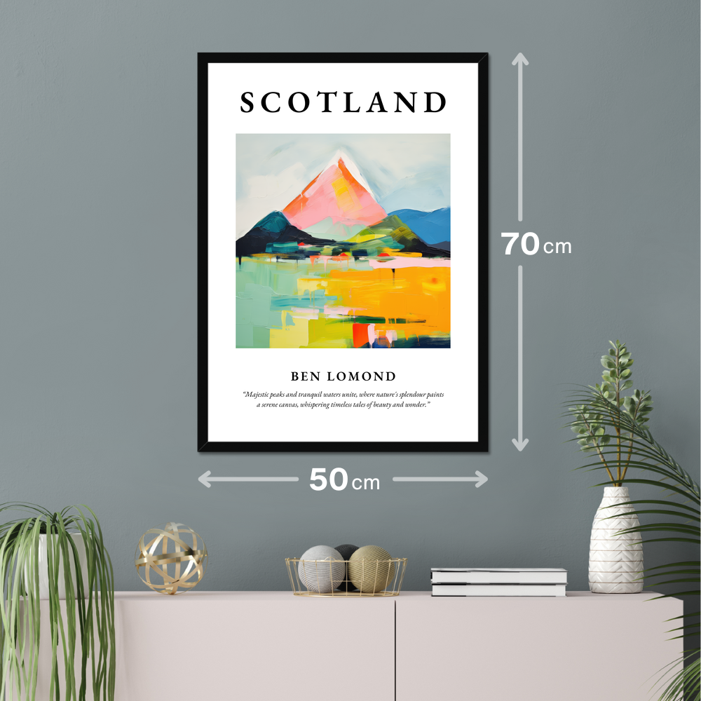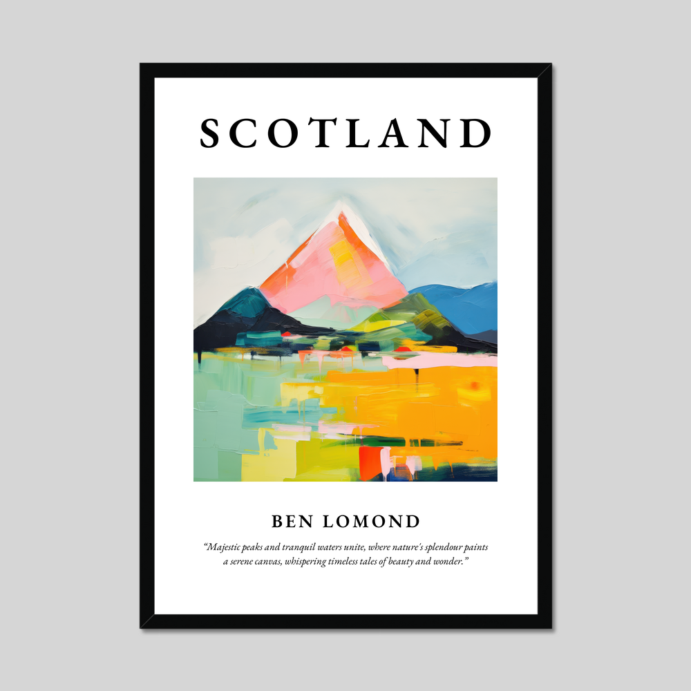 Capture the essence of Scotland with our striking framed poster print, measuring an impressive 50cm x 70cm. Available in your choice of black, white, or natural wood-effect frame, this piece beautifully combines style with substance. At the top, bold lettering proudly heralds "SCOTLAND," setting the stage for the dramatic abstract depiction of Ben Lomond below. An evocative quote rounds out the composition: “Majestic peaks and tranquil waters unite, where nature's splendour paints a serene canvas, whispering timeless tales of beauty and wonder.”