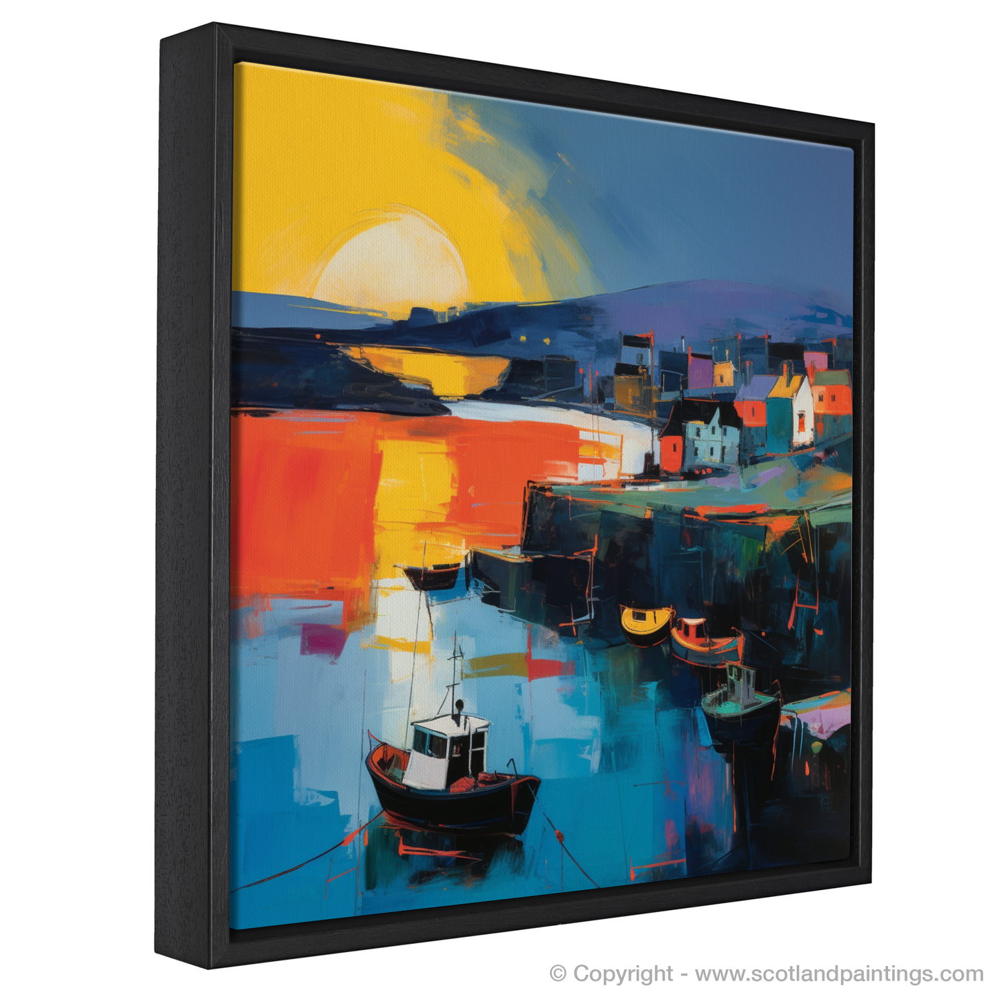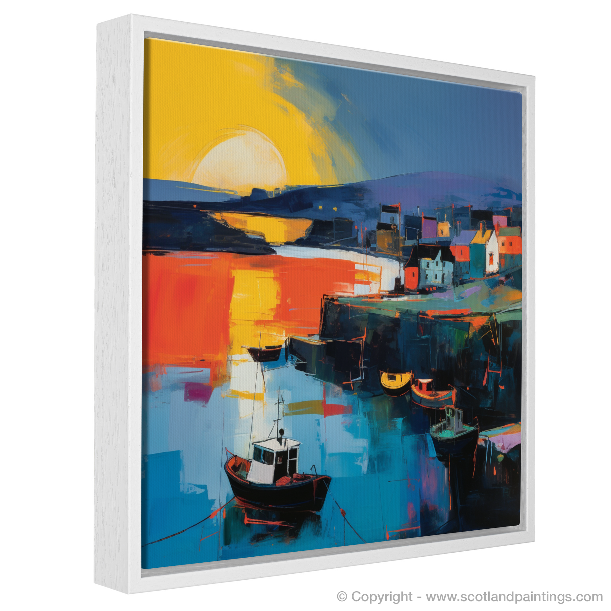 Let the luminous tranquility of twilight envelop you with this evocative portrayal of Portnahaven Harbour, captured in a mesmerising abstract aesthetic. This captivating print is steeped in a rich tapestry of bold colours and dynamic brushstrokes, inviting the viewer to bask in the serene beauty of a Scottish harbour at dusk.