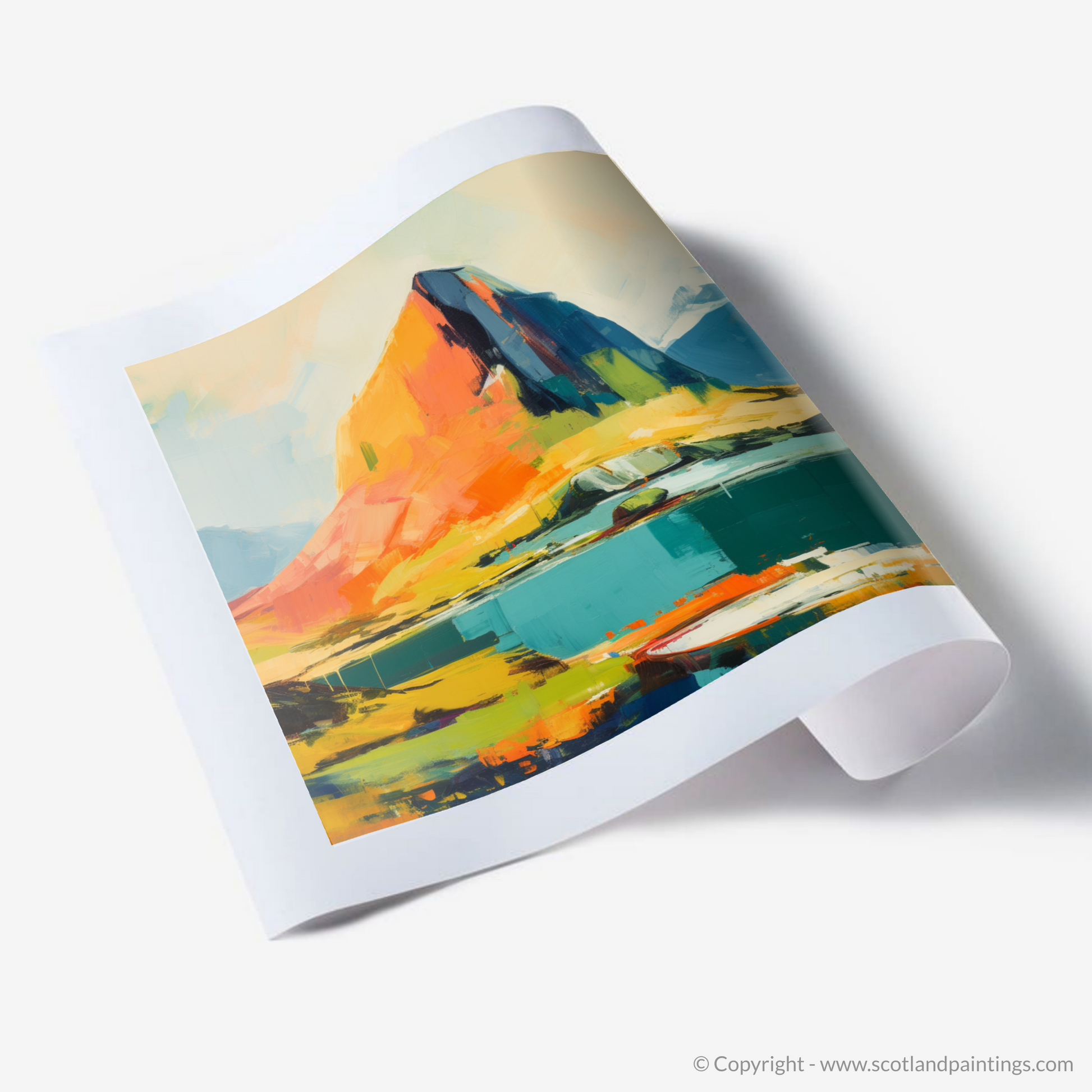 Immerse yourself in the vibrant hues and bold textures of our exclusive print that artistically portrays the majestic Suilven arising from the Scottish Highlands. As a part of our esteemed 'Scottish Mountains' collection, this abstract interpretation masterfully captures the spirit and splendour of Sutherland’s celebrated peak.
