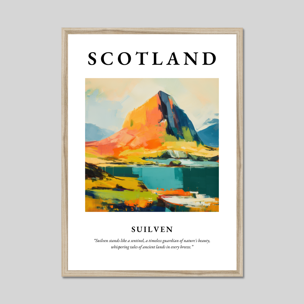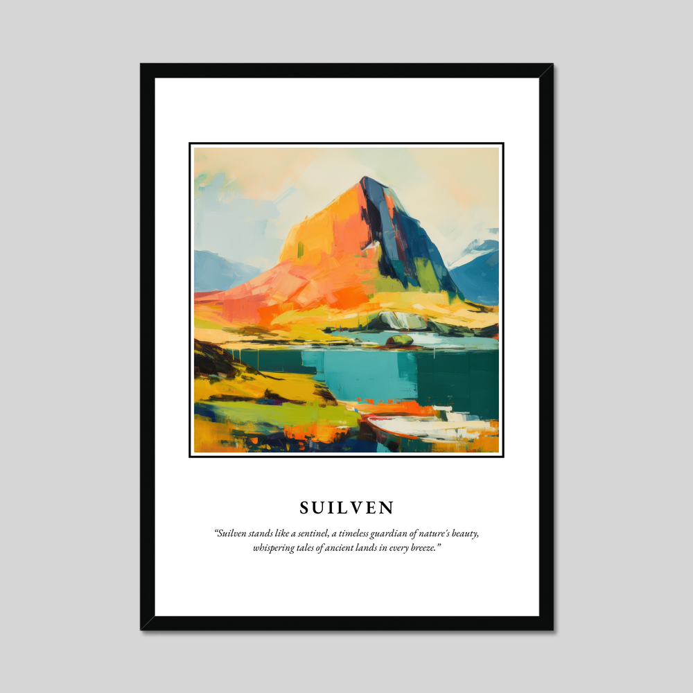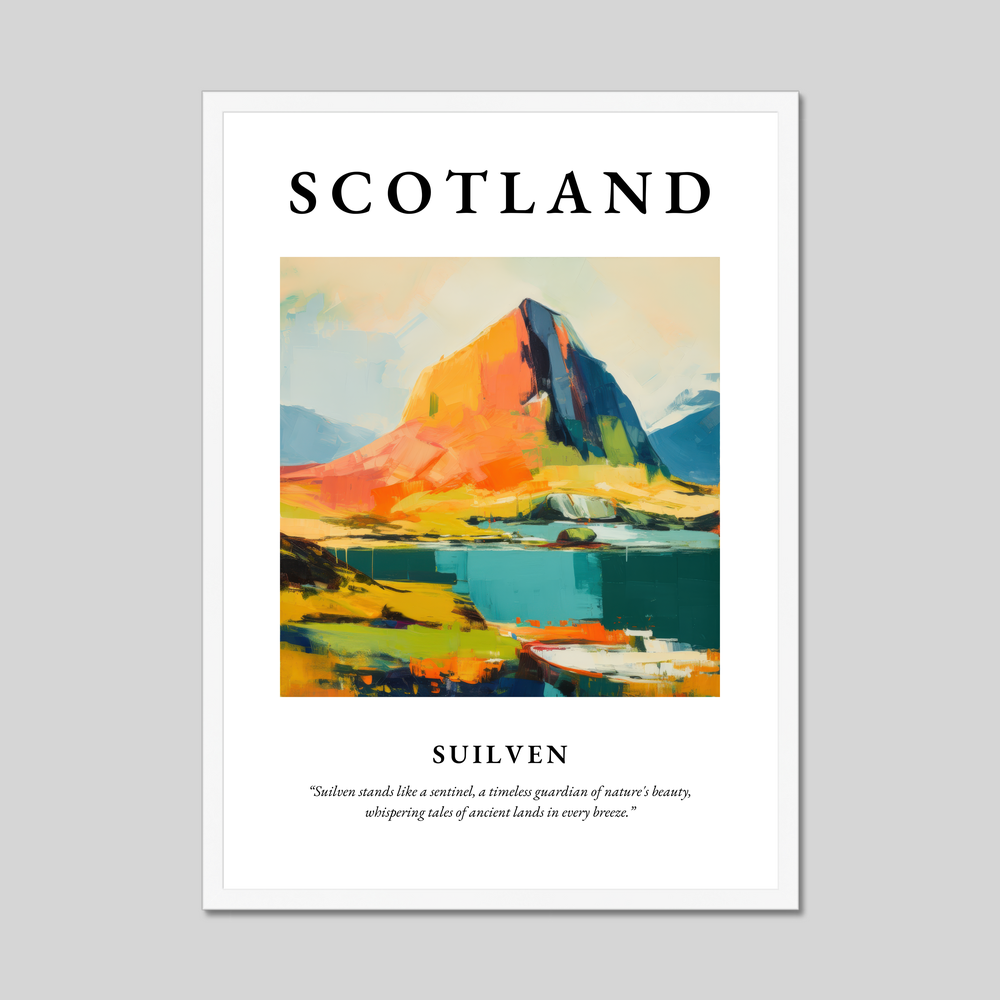 At the top of the poster, “SCOTLAND” is emblazoned in bold, eye-catching lettering, setting the stage for the exquisite painting below. The abstract representation of Suilven is a symphony of vibrant colours, blending bold strokes of deep blue, rich orange, and lush green to convey the mountain's majestic presence and timeless allure. Beneath this dynamic landscape, the quote “Suilven stands like a sentinel, a timeless guardian of nature's beauty, whispering tales of ancient lands in every breeze,” captures the essence and spirit of this iconic Scottish peak.