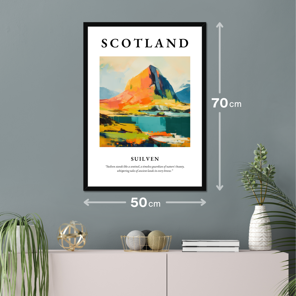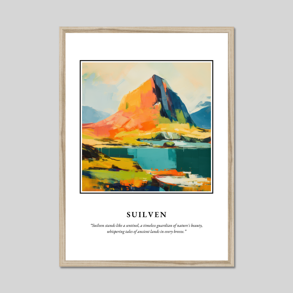 Invite the enchanting beauty of Scotland into your space with our stunning framed poster print, a captivating tribute to the storied mountain of Suilven. Measuring an impressive 50cm x 70cm, this sizeable artwork captures attention, covering a large wall area while remaining delightfully affordable. Choose from frames in sleek black, classic white, or a warm natural wood effect to perfectly match your interior décor.
