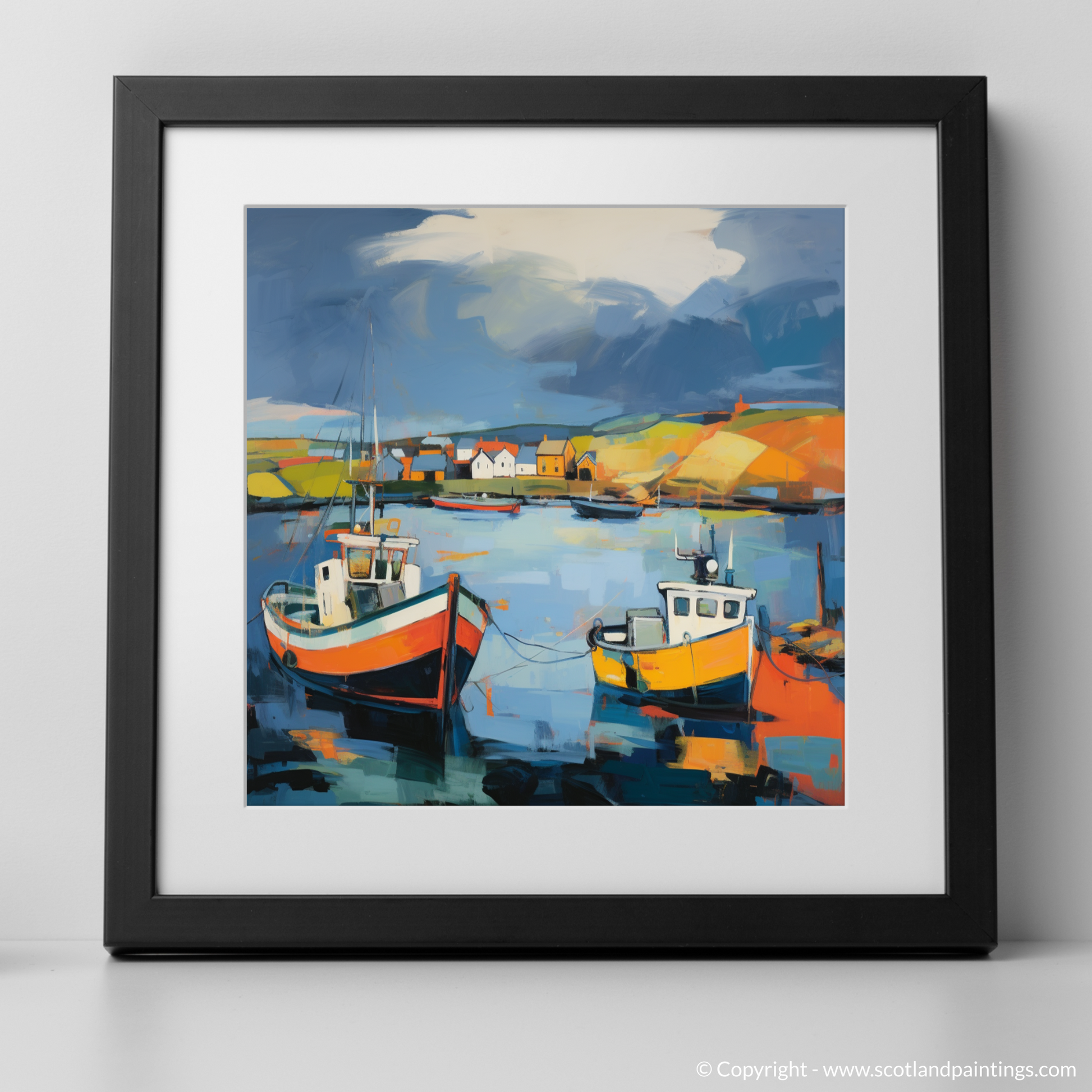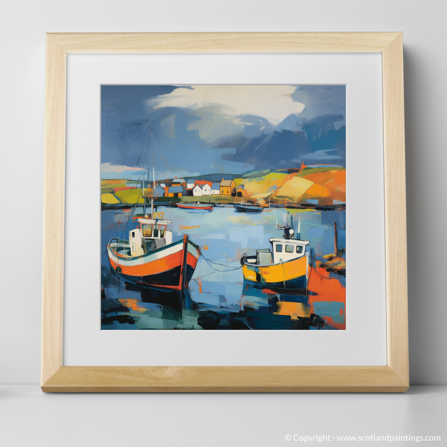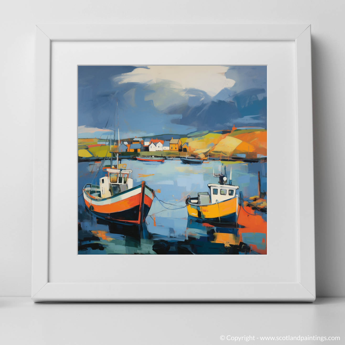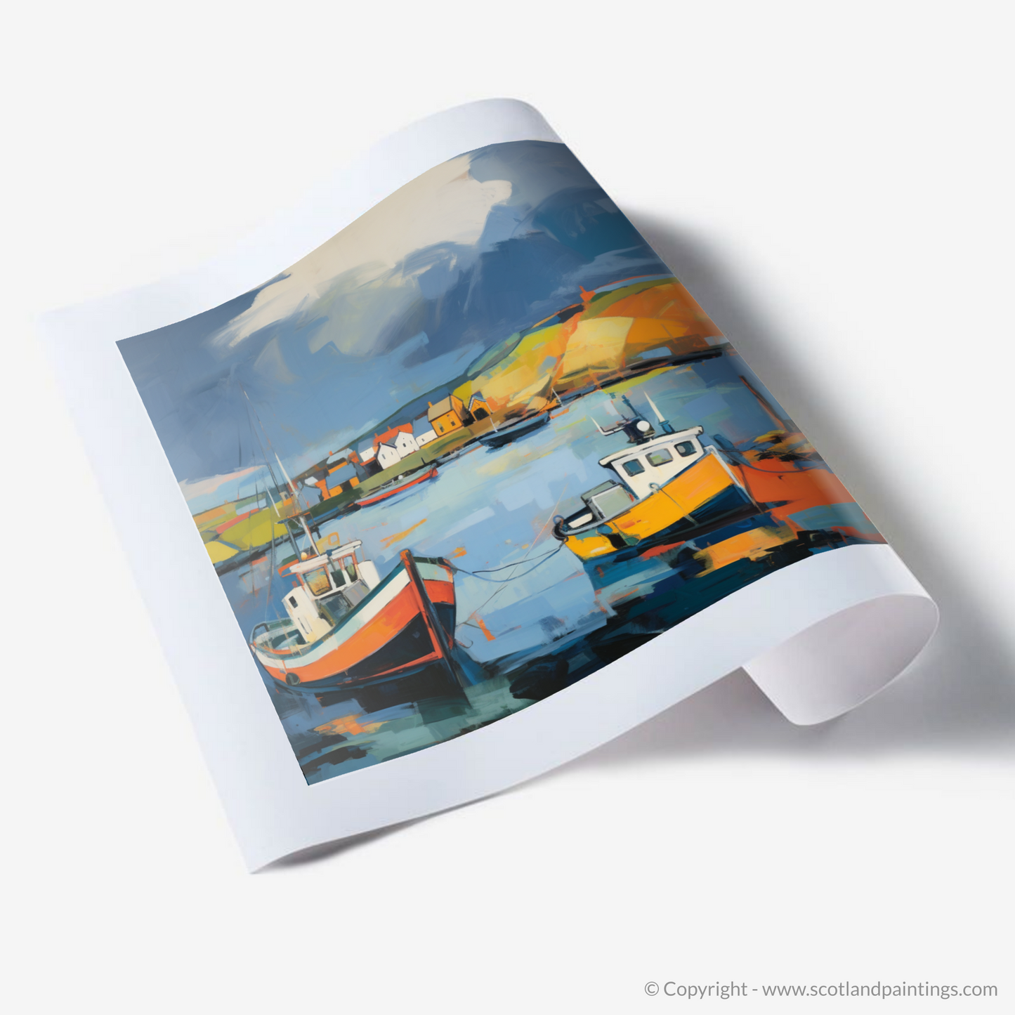 Sweeping brushstrokes evoke a sense of movement in this captivating abstraction of Findochty Harbour, where the natural charm of Scotland is rendered in a symphony of vivid colours and dynamic forms. The composition invites the viewer to a maritime scene characterised by a dramatic stormy sky that hovers above the tranquil harbour.
