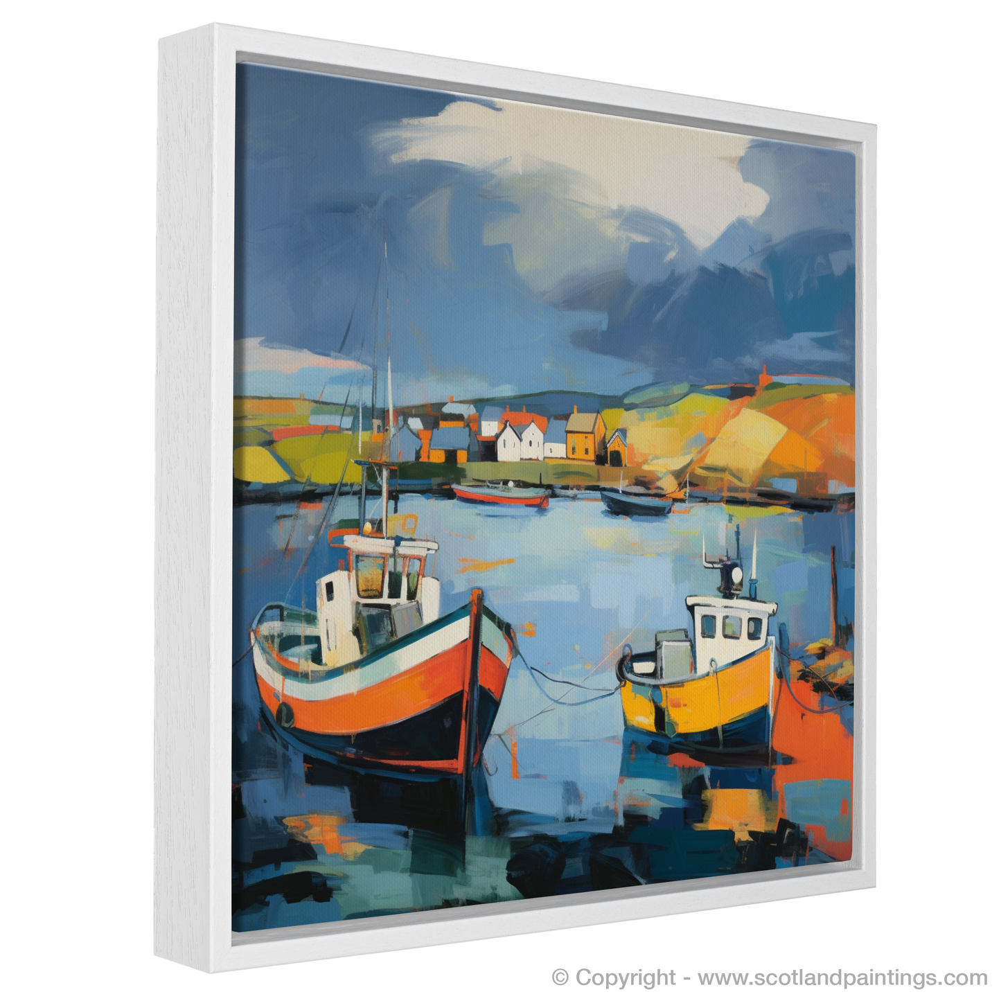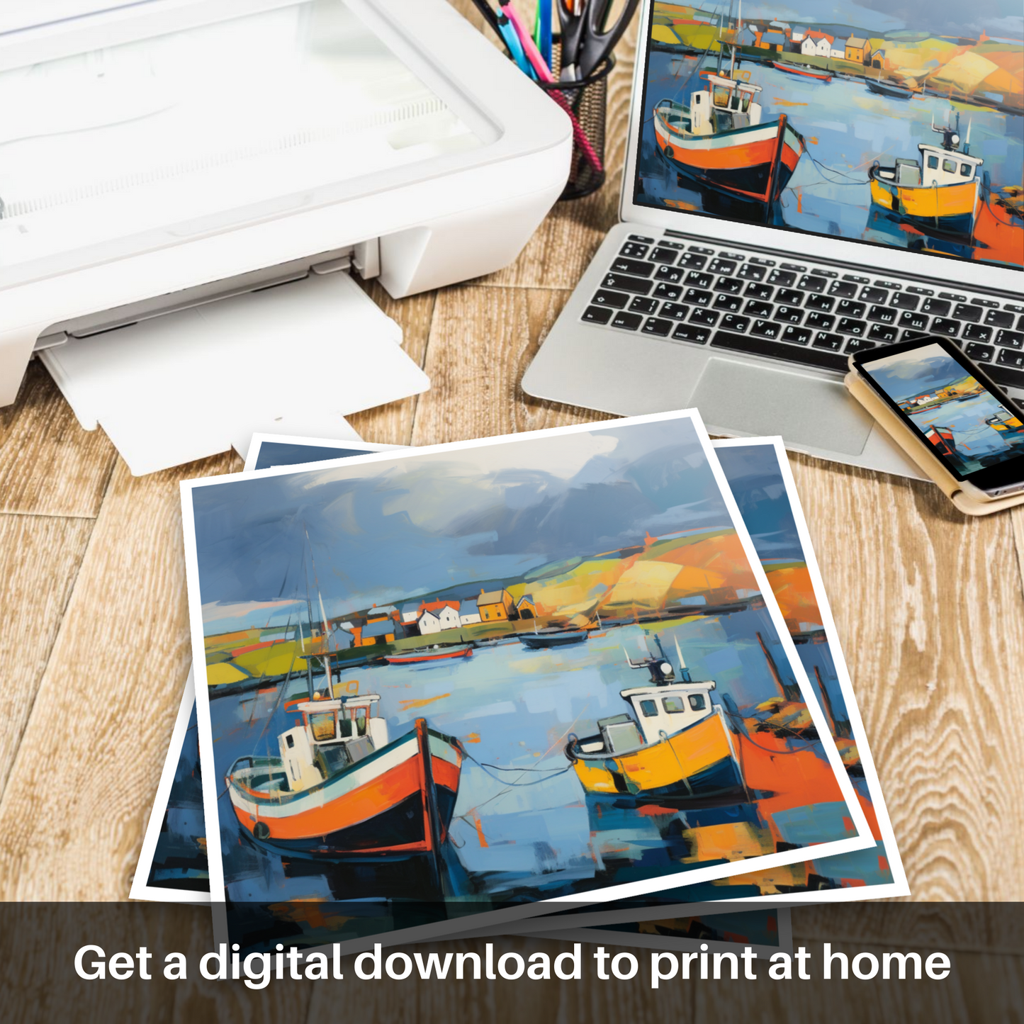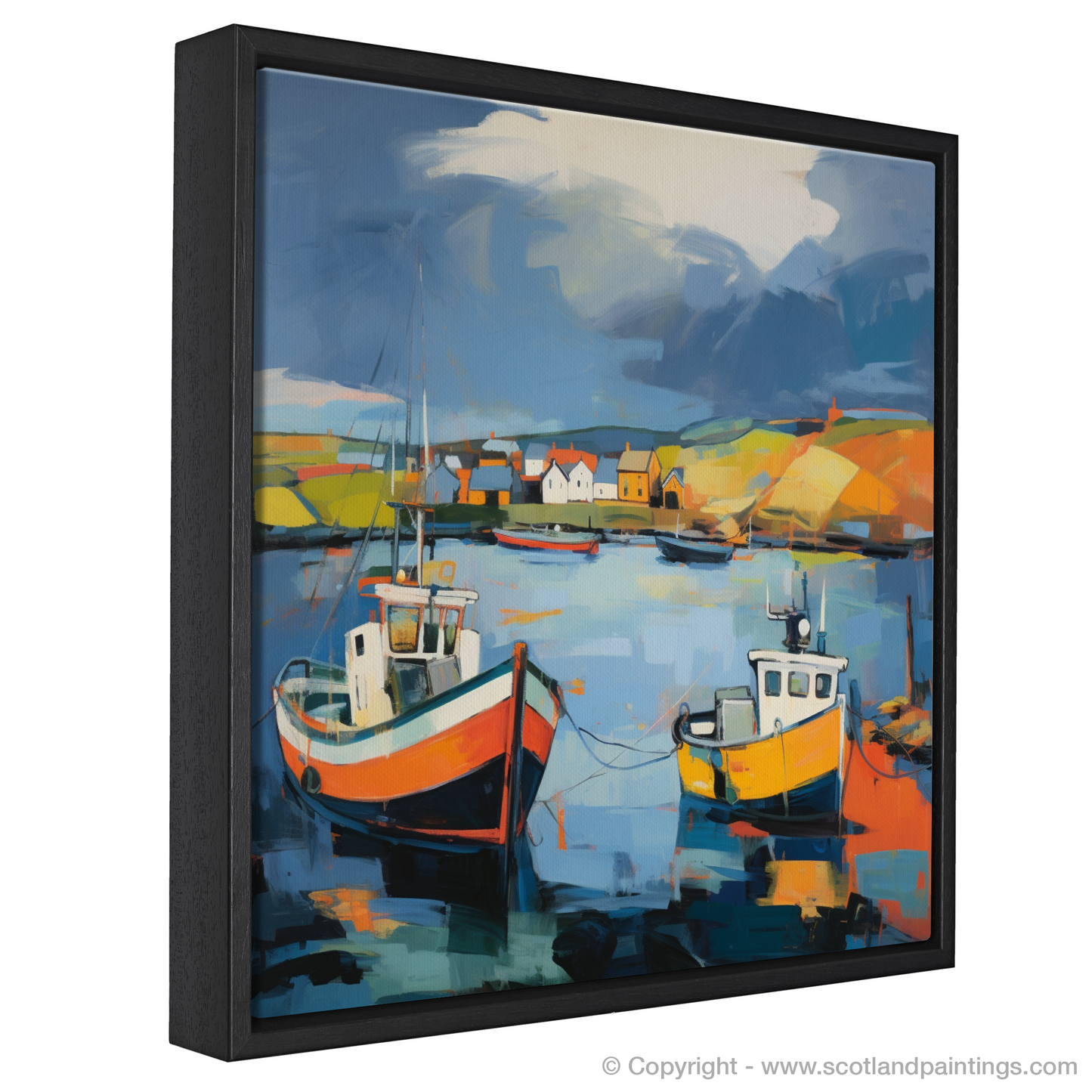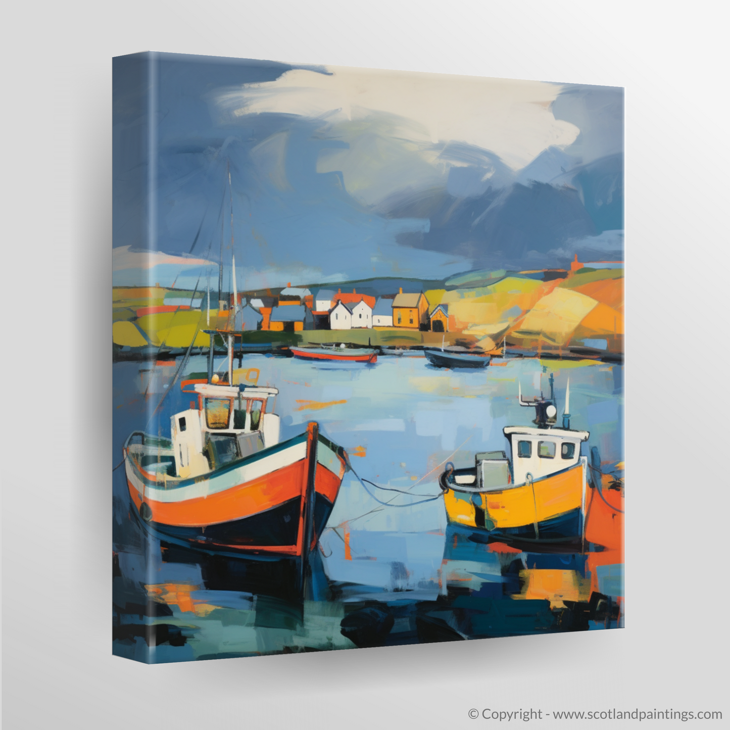 Sweeping brushstrokes evoke a sense of movement in this captivating abstraction of Findochty Harbour, where the natural charm of Scotland is rendered in a symphony of vivid colours and dynamic forms. The composition invites the viewer to a maritime scene characterised by a dramatic stormy sky that hovers above the tranquil harbour.