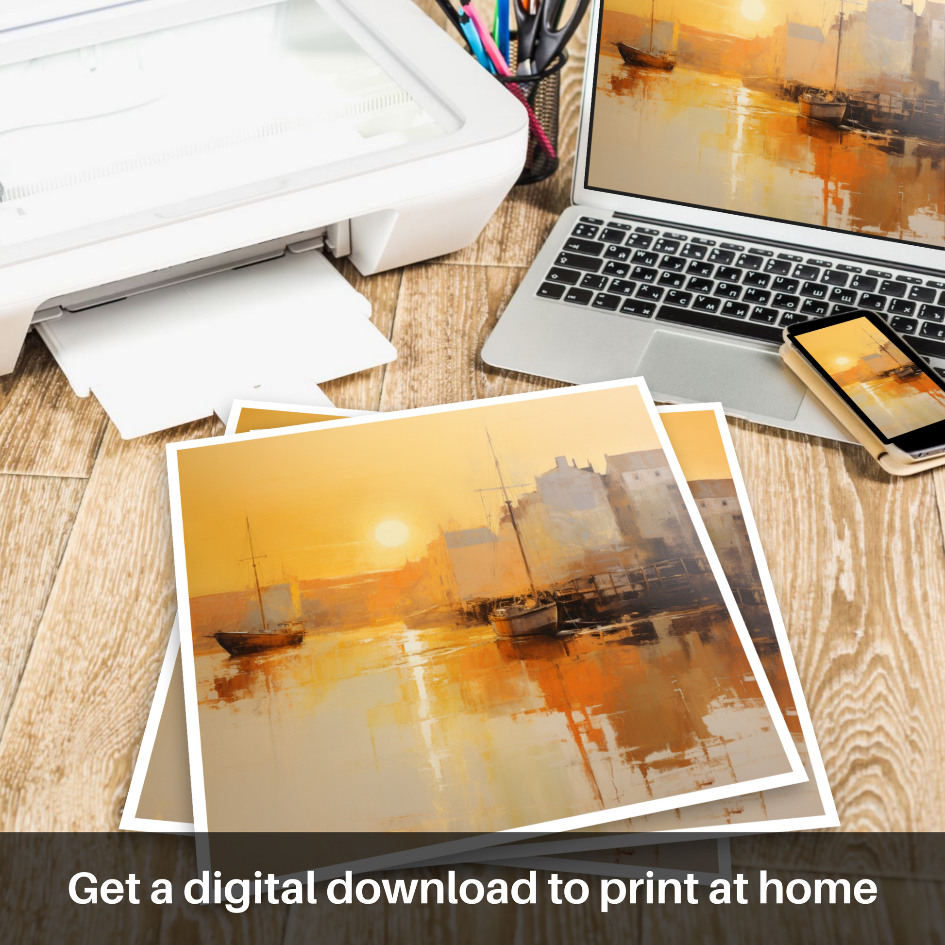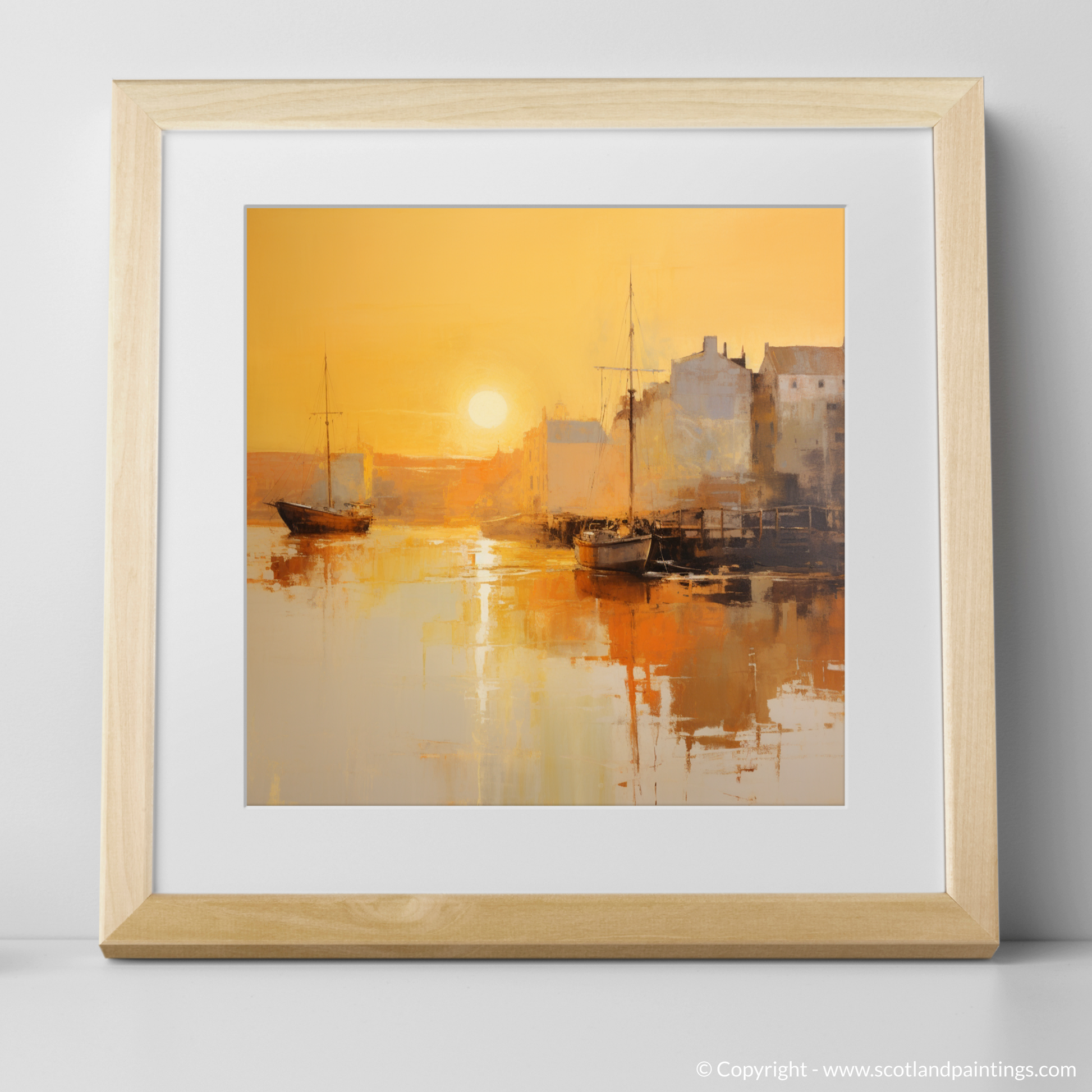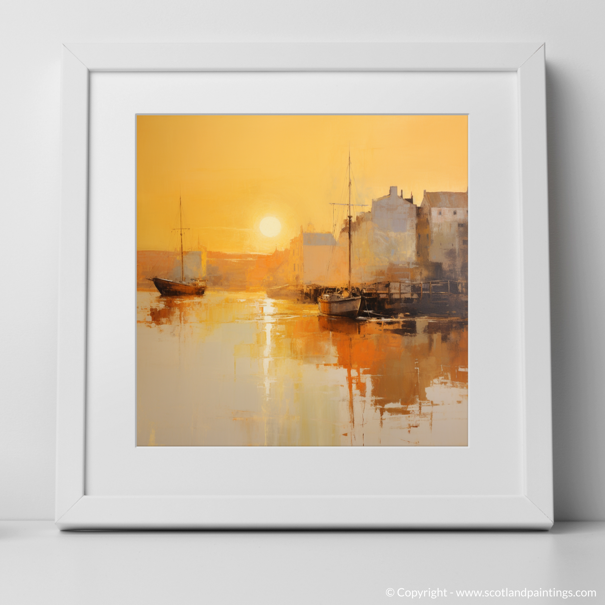 Bathed in the captivating glow of the setting sun, this mesmerising print captures the serene beauty of Charlestown Harbour during golden hour, rendered through a harmonious blend of abstract forms and a warm, amber-infused palette. The artwork transports viewers to the Scottish coast, where the languid sea reflects the vibrant hues of twilight, and silhouetted vessels hint at the tranquillity of seafaring life.