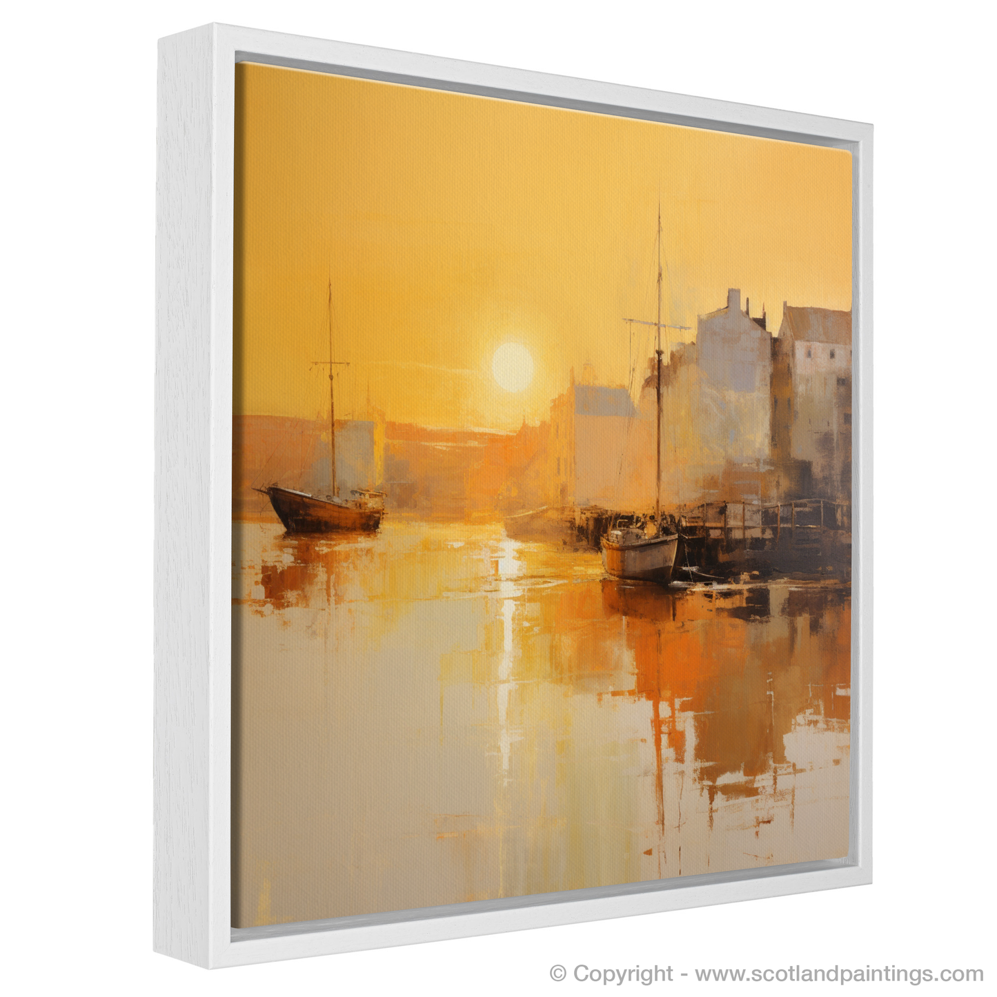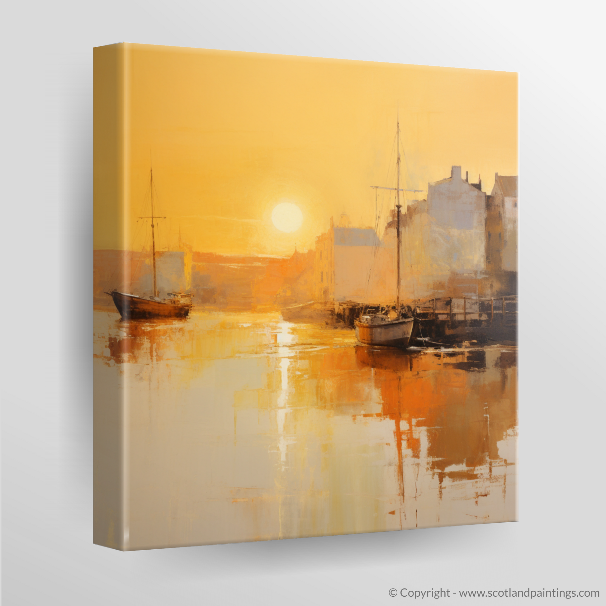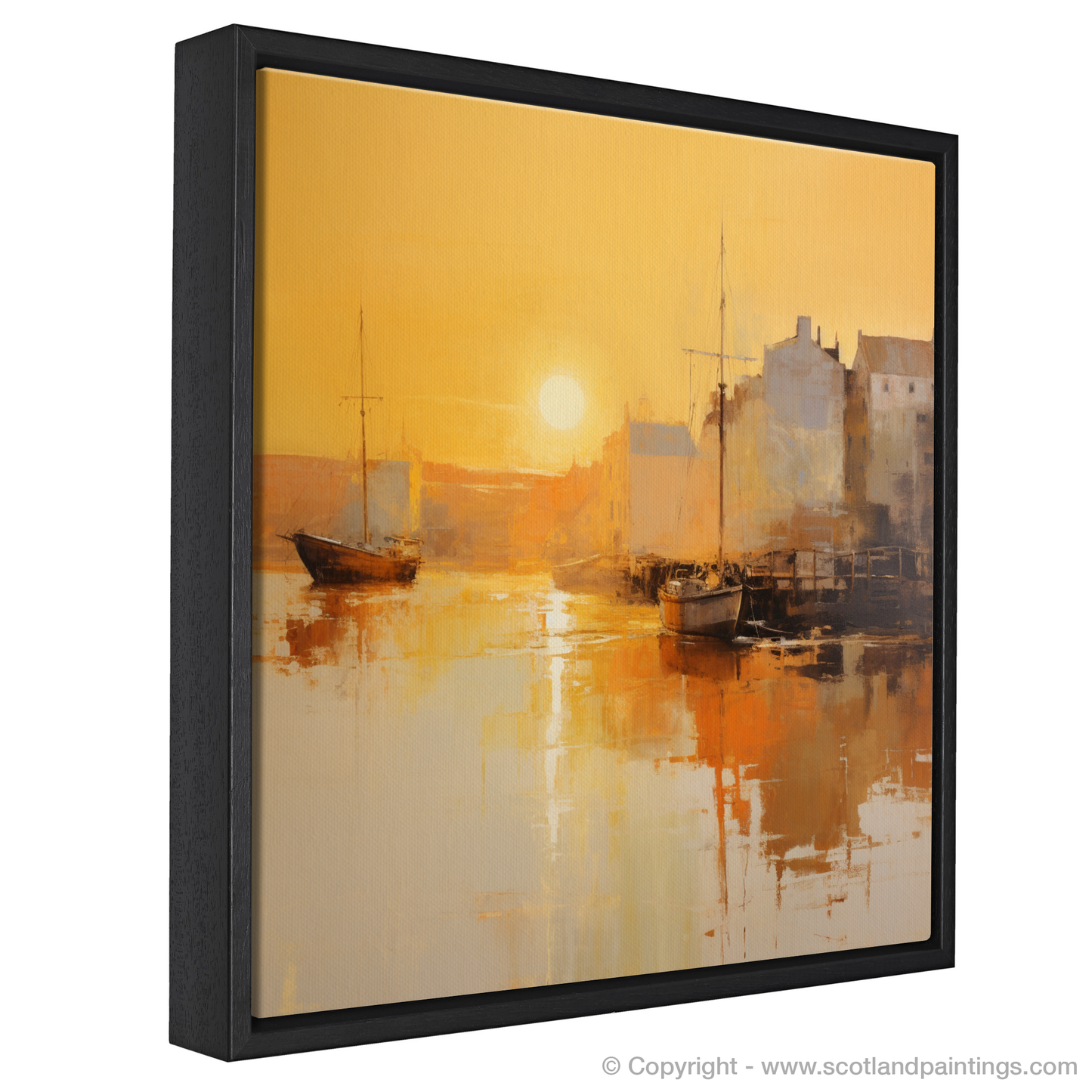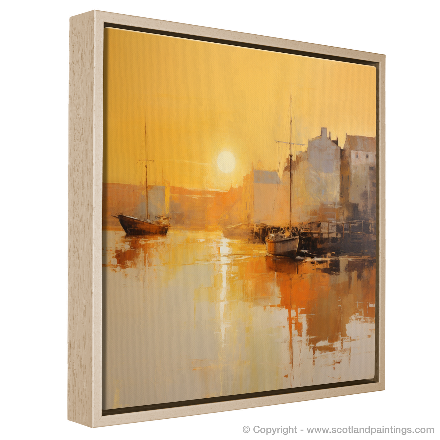 Bathed in the captivating glow of the setting sun, this mesmerising print captures the serene beauty of Charlestown Harbour during golden hour, rendered through a harmonious blend of abstract forms and a warm, amber-infused palette. The artwork transports viewers to the Scottish coast, where the languid sea reflects the vibrant hues of twilight, and silhouetted vessels hint at the tranquillity of seafaring life.