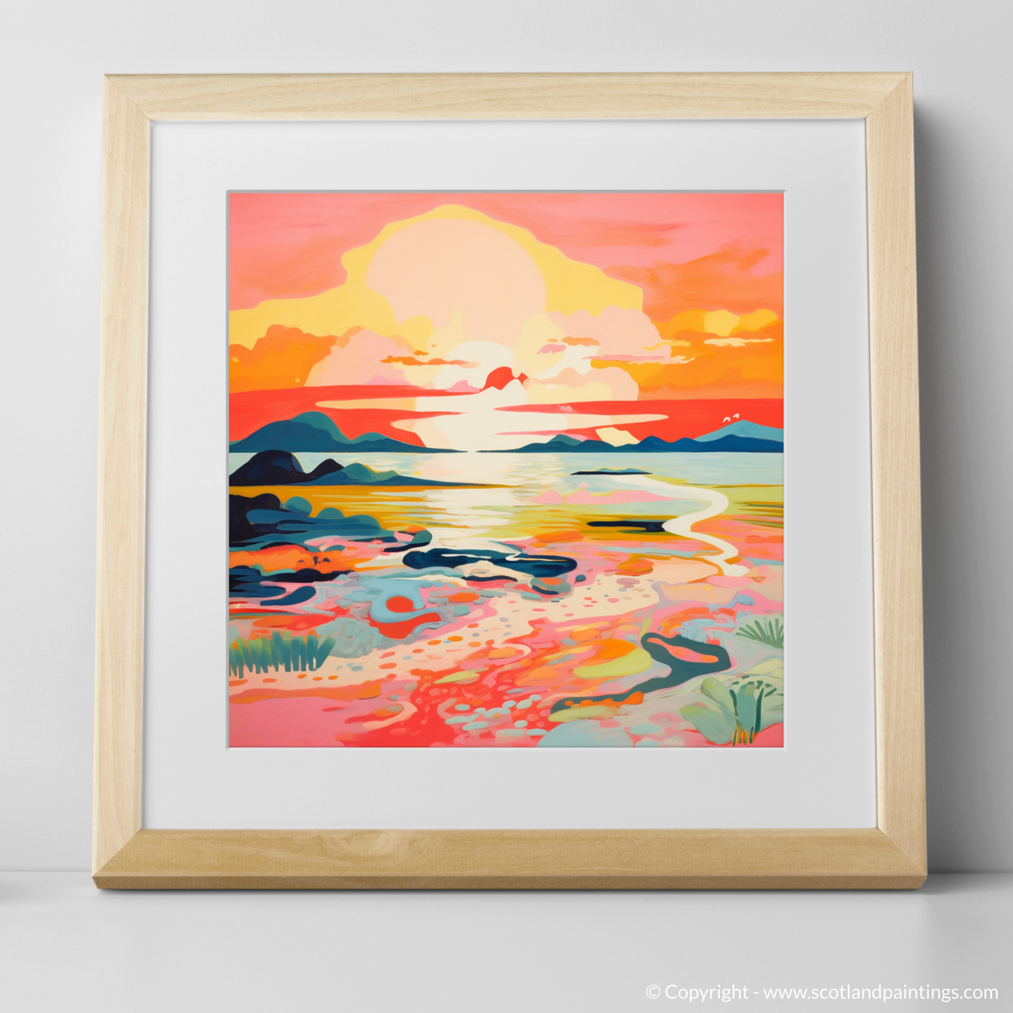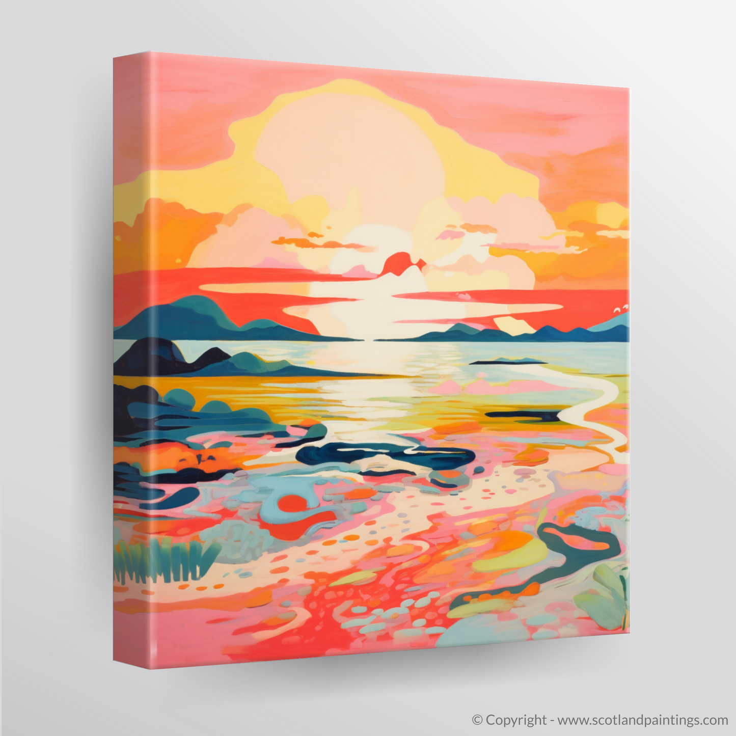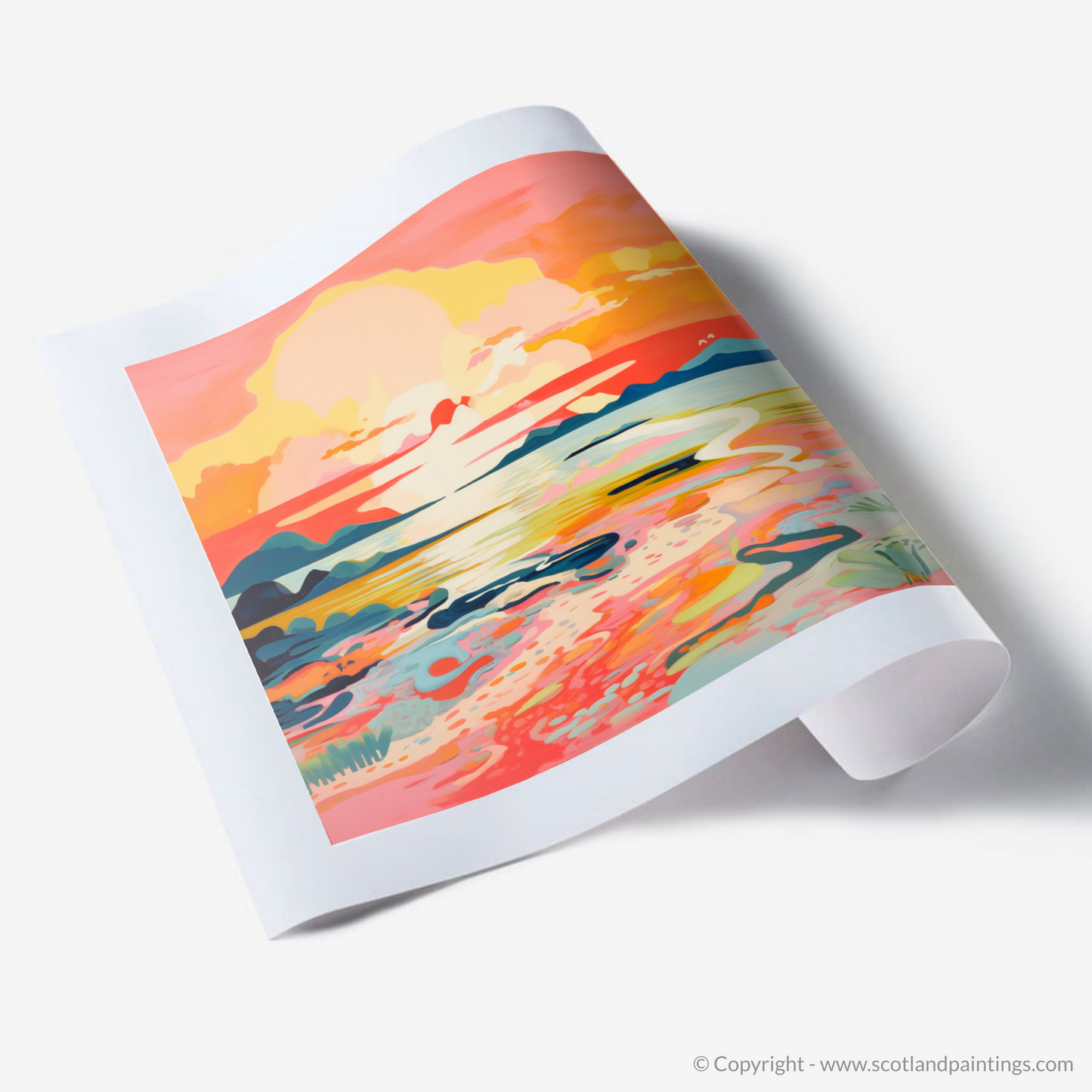 Immerse yourself in the vibrant hues of a Scottish haven with this exquisite abstract piece, capturing the essence of Coral Beach as the sun dips below the horizon. The dynamic play of colours transports you to a shoreside paradise where the boundary between sea and sky is lovingly blurred by the artist's visionary hand.