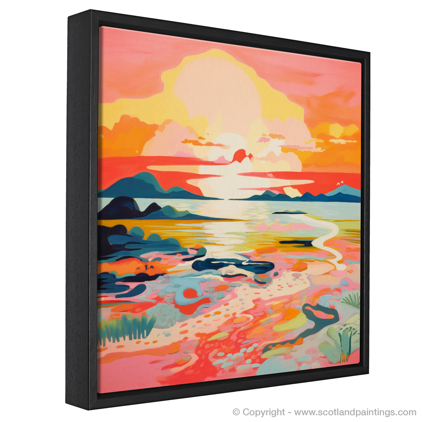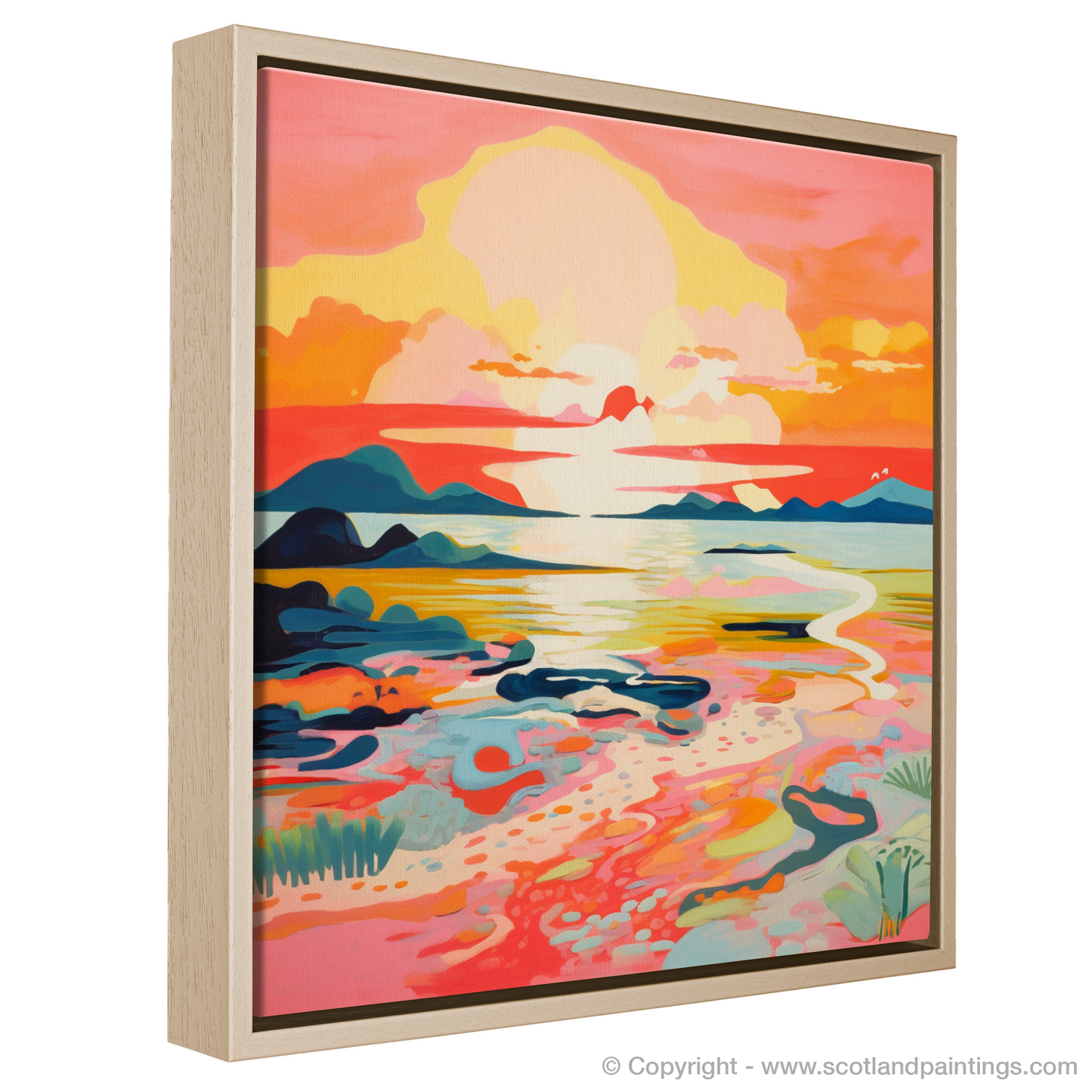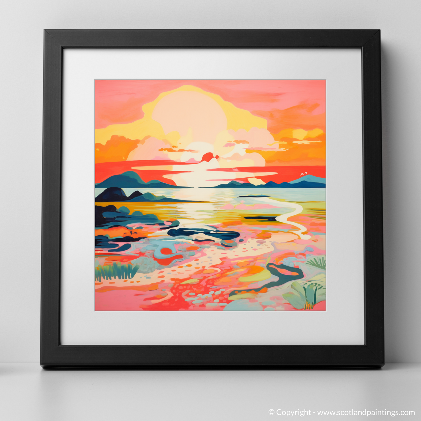 Immerse yourself in the vibrant hues of a Scottish haven with this exquisite abstract piece, capturing the essence of Coral Beach as the sun dips below the horizon. The dynamic play of colours transports you to a shoreside paradise where the boundary between sea and sky is lovingly blurred by the artist's visionary hand.