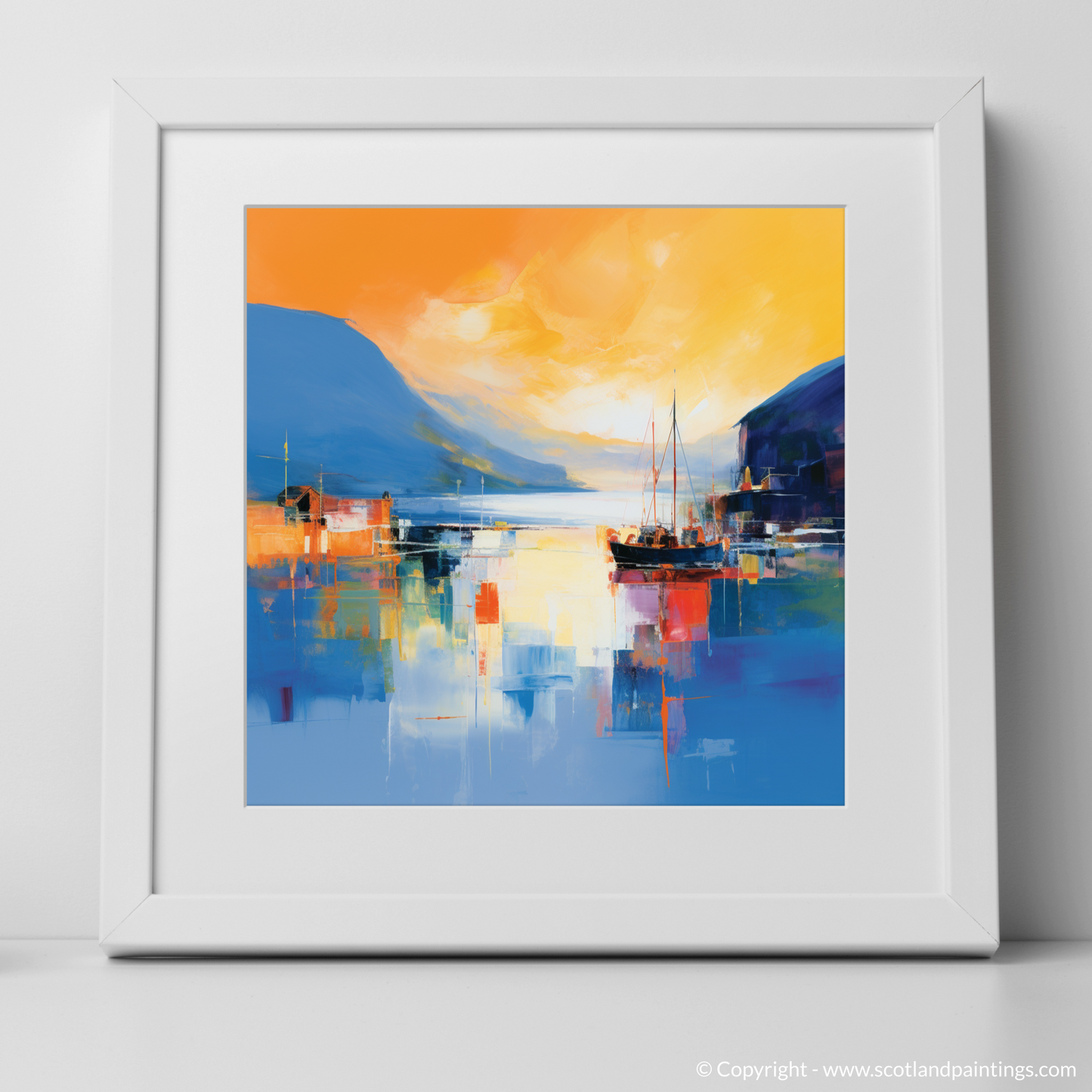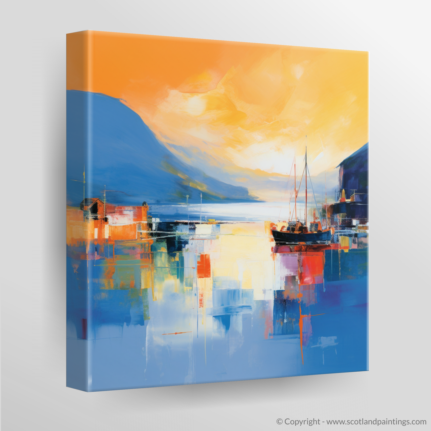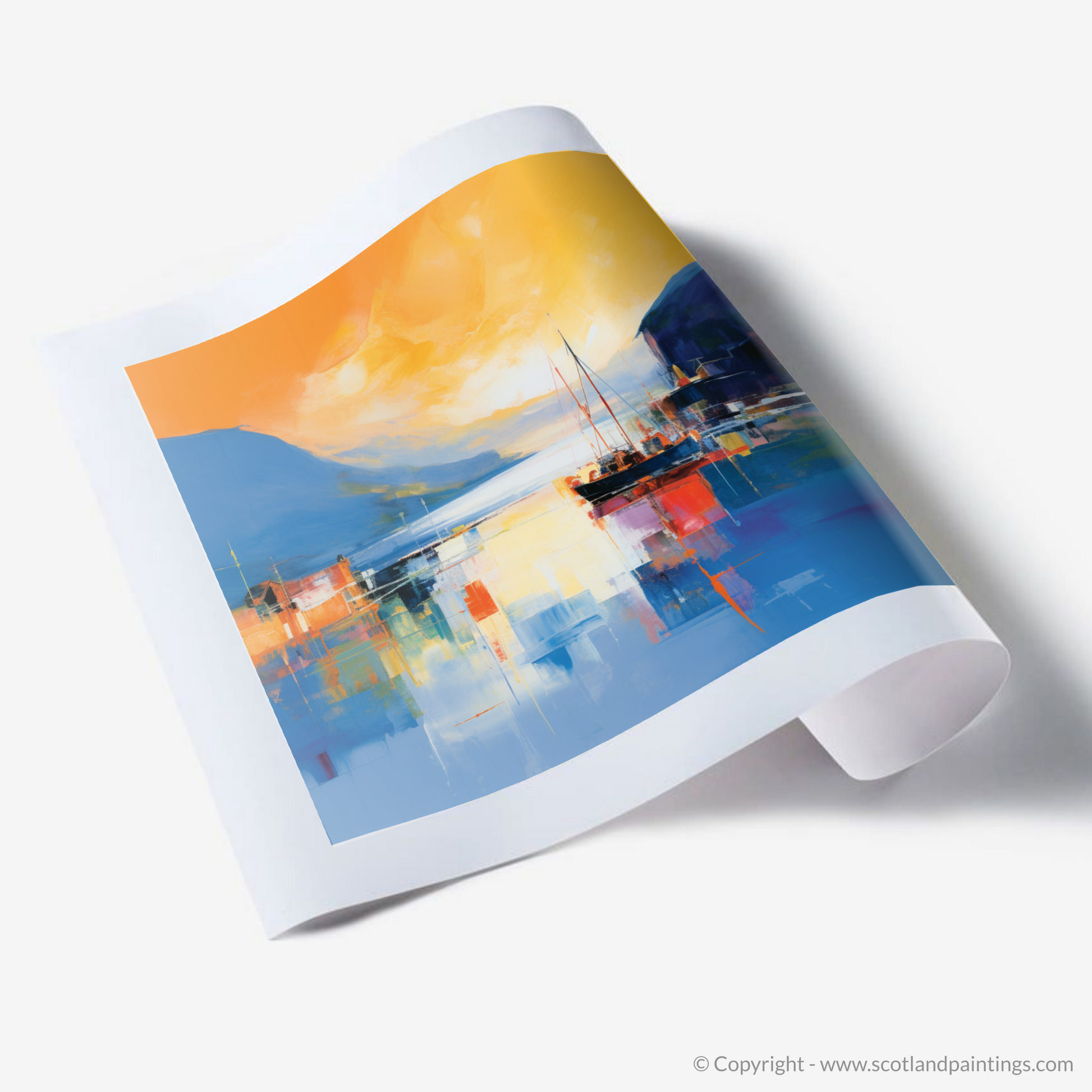 Let the radiant beauty of the Scottish coastline envelop your space with this captivating abstract print, an evocative interpretation of Lochranza Harbour bathed in the ethereal light of the golden hour. This exquisite piece masterfully captures the interplay of light and reflection as the day's last rays kiss the tranquil waters, casting the landscape in a warm, luminous glow.