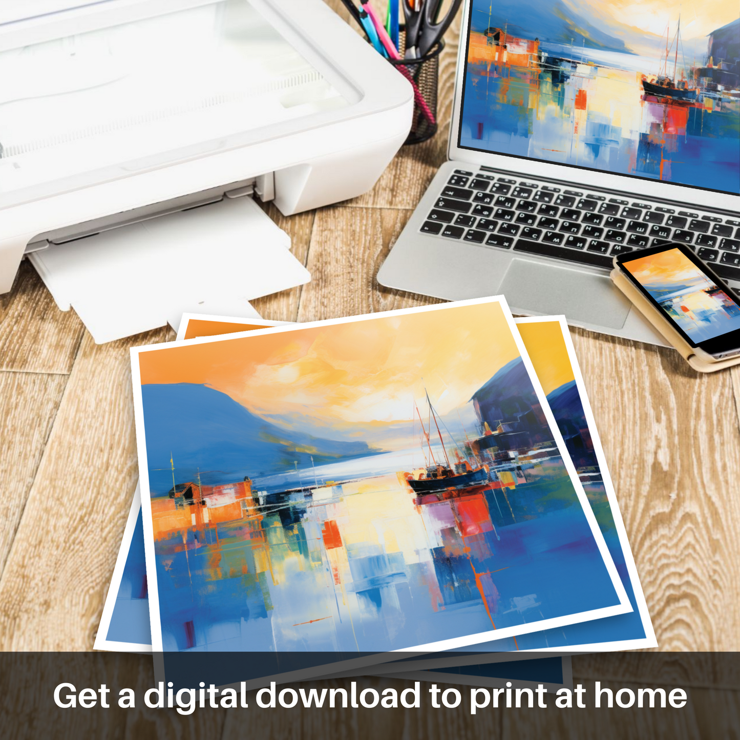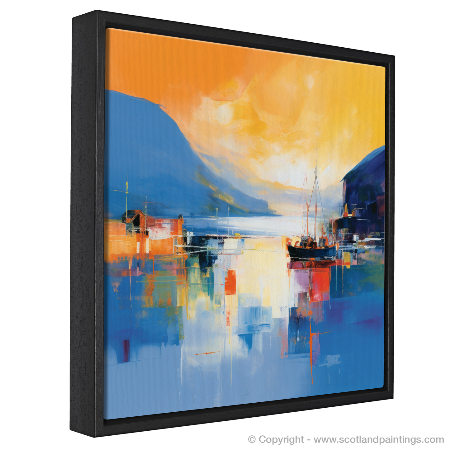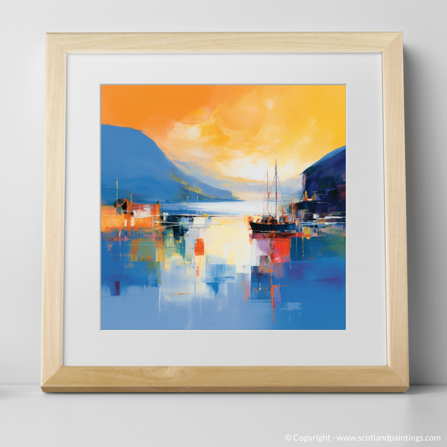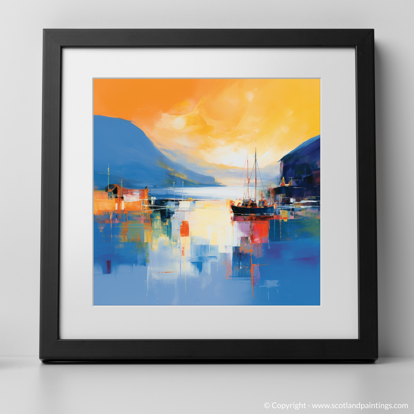 Let the radiant beauty of the Scottish coastline envelop your space with this captivating abstract print, an evocative interpretation of Lochranza Harbour bathed in the ethereal light of the golden hour. This exquisite piece masterfully captures the interplay of light and reflection as the day's last rays kiss the tranquil waters, casting the landscape in a warm, luminous glow.